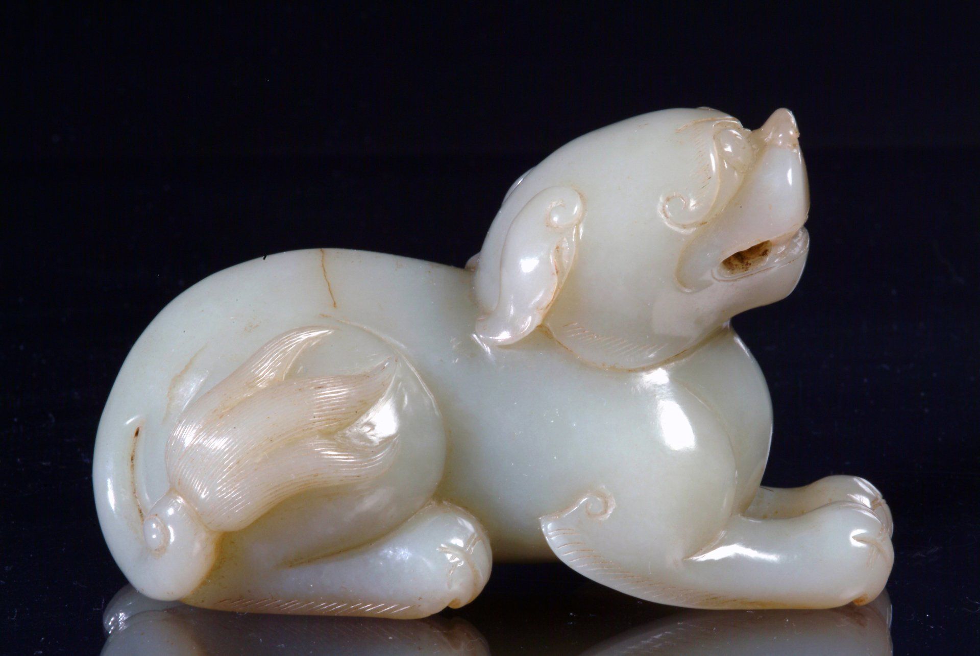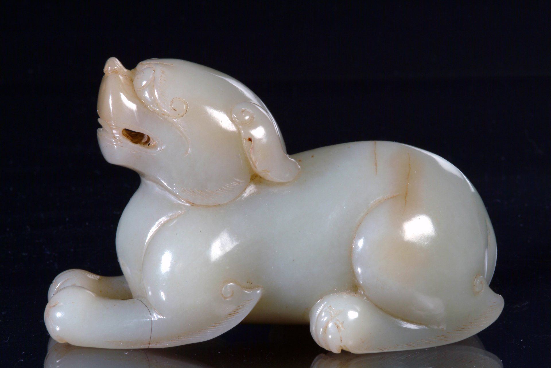 Ming Dynasty Pale Grayish-White Jade Reclining Mythical Creature Sculpture