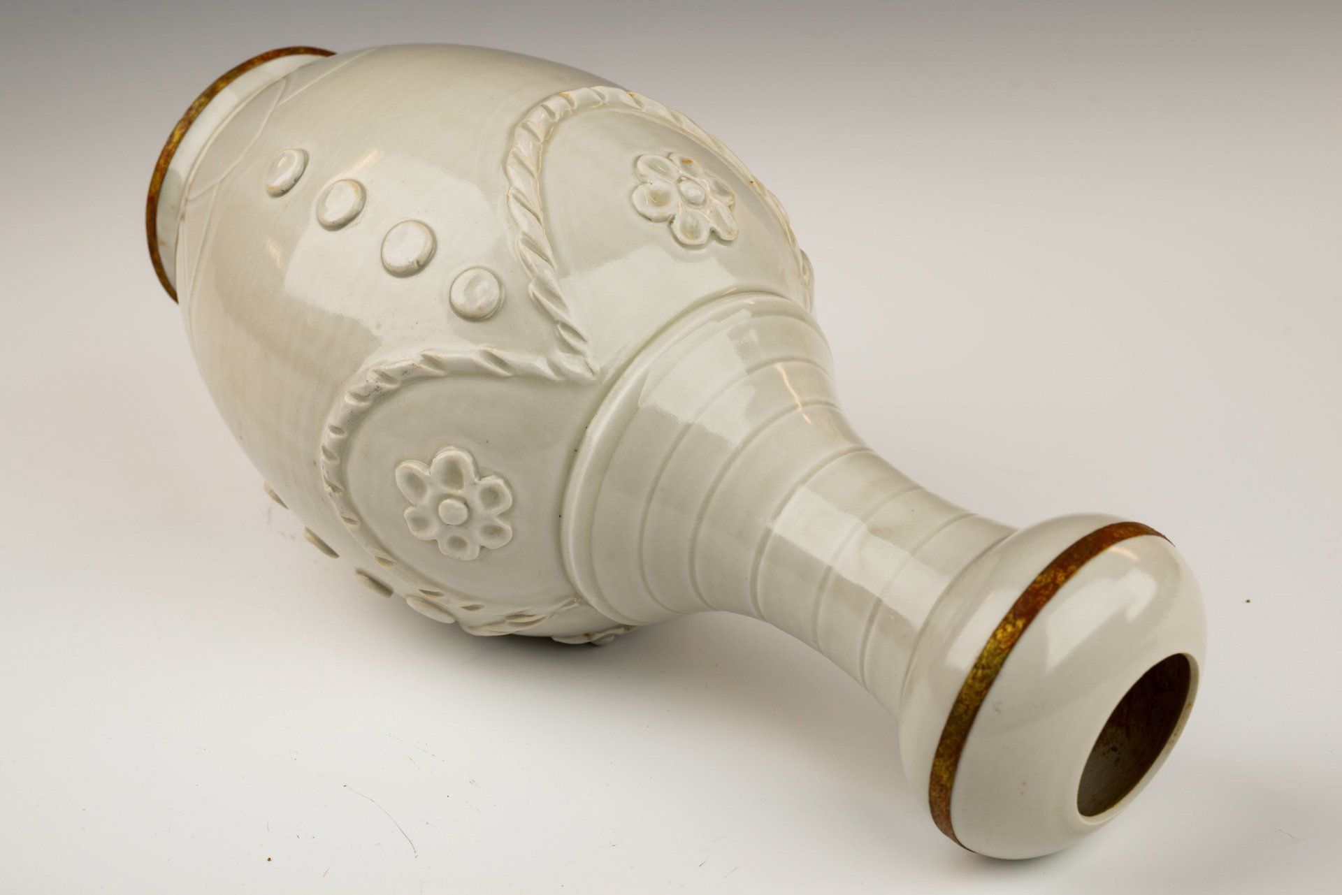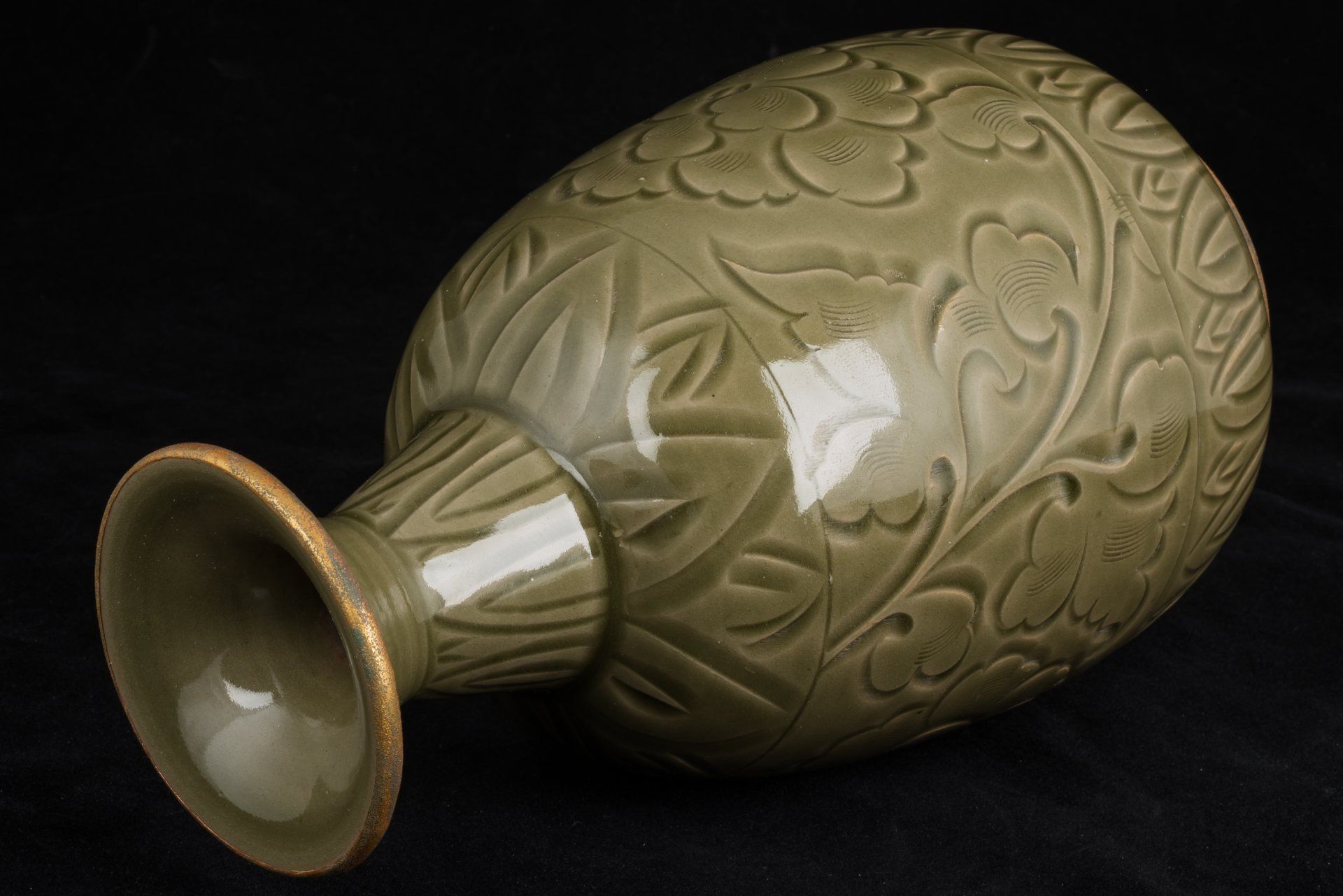 This exquisite specimen of Chinese ancient fine art is an Imperial vase from the Northern Song Dynasty, specifically characterized by its distinguished Ding kiln white ware. The vase showcases an intricate design featuring lotus leaves encircling the foot, draped cord buttons, and floral motifs adorning its body. Notably, it possesses a bowstring neck and a saucer-shaped head. The vase is finished with an ivory-colored transparent glaze that covers an off-white body, exhibiting distinctive tear streaks within the glaze. A hallmark of authenticity, the fire-gilded bands encircling the head and base display a porous nature, adorned with reddish cuprite and greenish botryoidal malachite corrosion, which has developed through the porous surface of the gilt. This corrosion serves as a testament to the vase's age and integrity, providing a more trustworthy means of authentication than thermoluminescence (TL) testing, a view upheld by experts in the field of ancient Chinese artifacts. While the vase is unmarked, its elaborate features suggest that it may be a tribute piece due to the presence of the fire-gilded band. The dimensions of the vase are approximately 11.5 inches in height. ppjrs