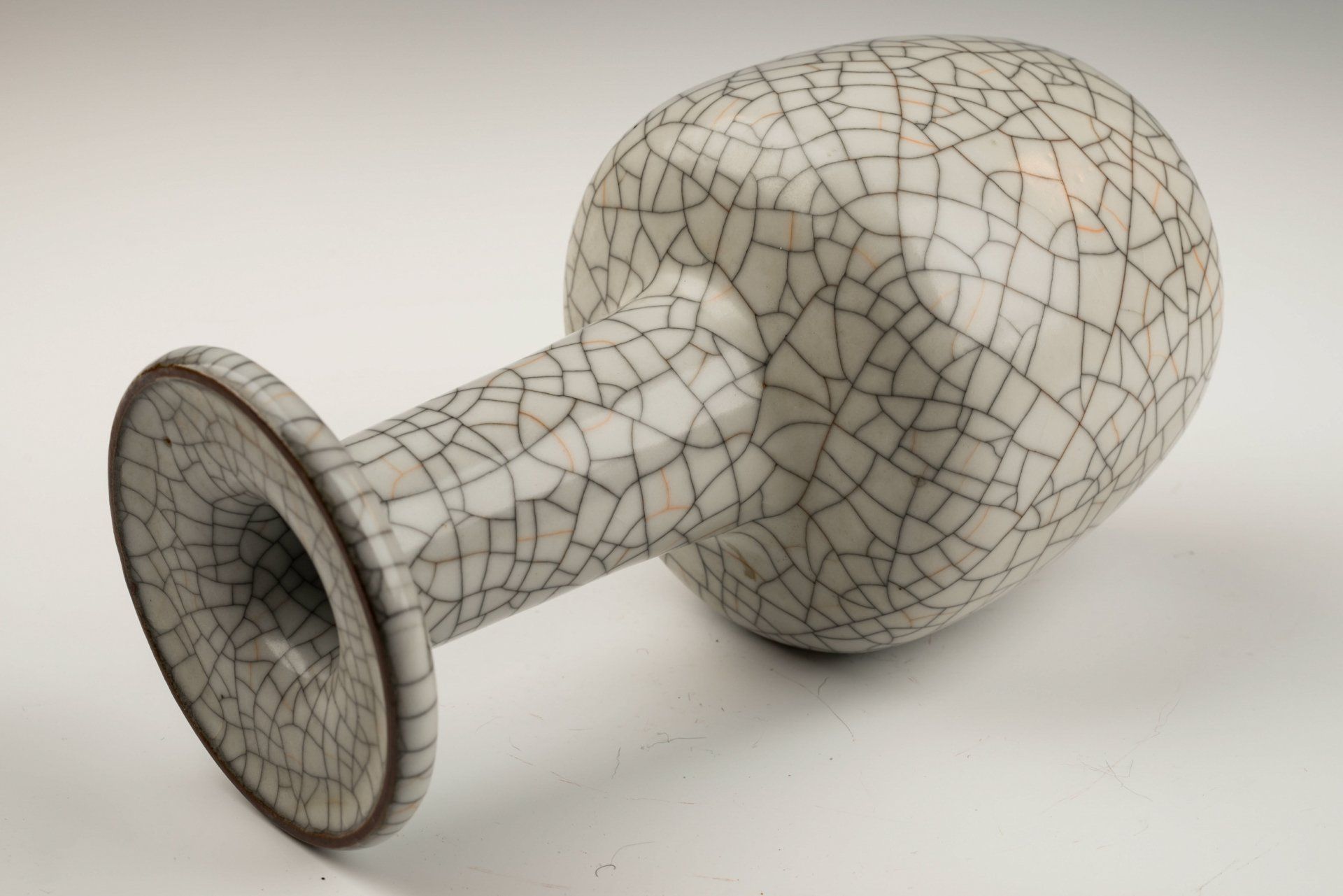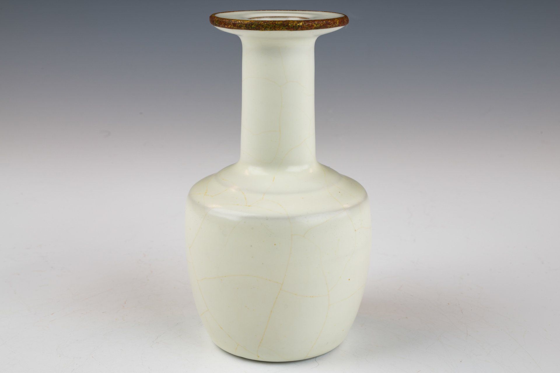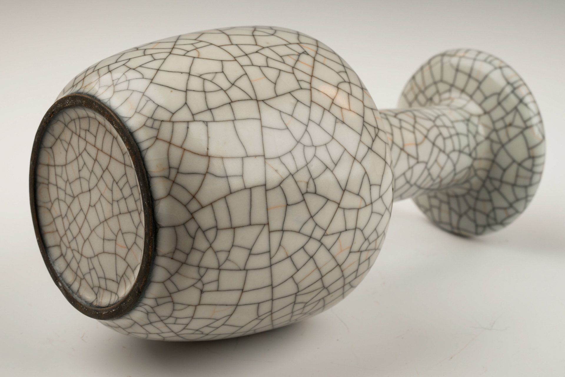 Masterpiece Guan Ware Mallet-Form Vase: This exquisitely crafted vase showcases a distinguished form, characterized by a finely potted structure. The vase features a striking crackled white glaze, interspersed with threads of gold, enhancing its aesthetic appeal. The base reveals the dark brown biscuit associated with Song Dynasty Guan Ware. Following the displacement of the Imperial Court by the Jin armies during the Northern Song Dynasty, the court relocated to Hangzhou in 1127 A.D., establishing the Southern Song Dynasty. The vase stands at a height of 8 1/2 inches. ppjrs