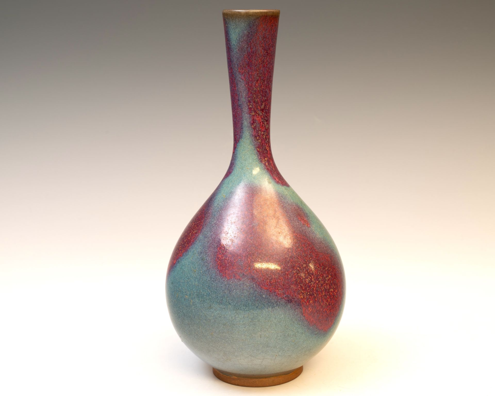 This exquisite vase, originating from the Northern Song Dynasty and attributed to the Jun Kiln, exemplifies the artistry of Jun ware. Characterized by its pear shape and elongated neck, the vase features a captivating blue glaze interspersed with violet splashes across both the neck and the body. Additionally, fine crackling is present throughout the surface, adding to its aesthetic appeal. The vase stands at approximately 9.5 inches in height, showcasing the craftsmanship and cultural significance of this historical period. ppjrs