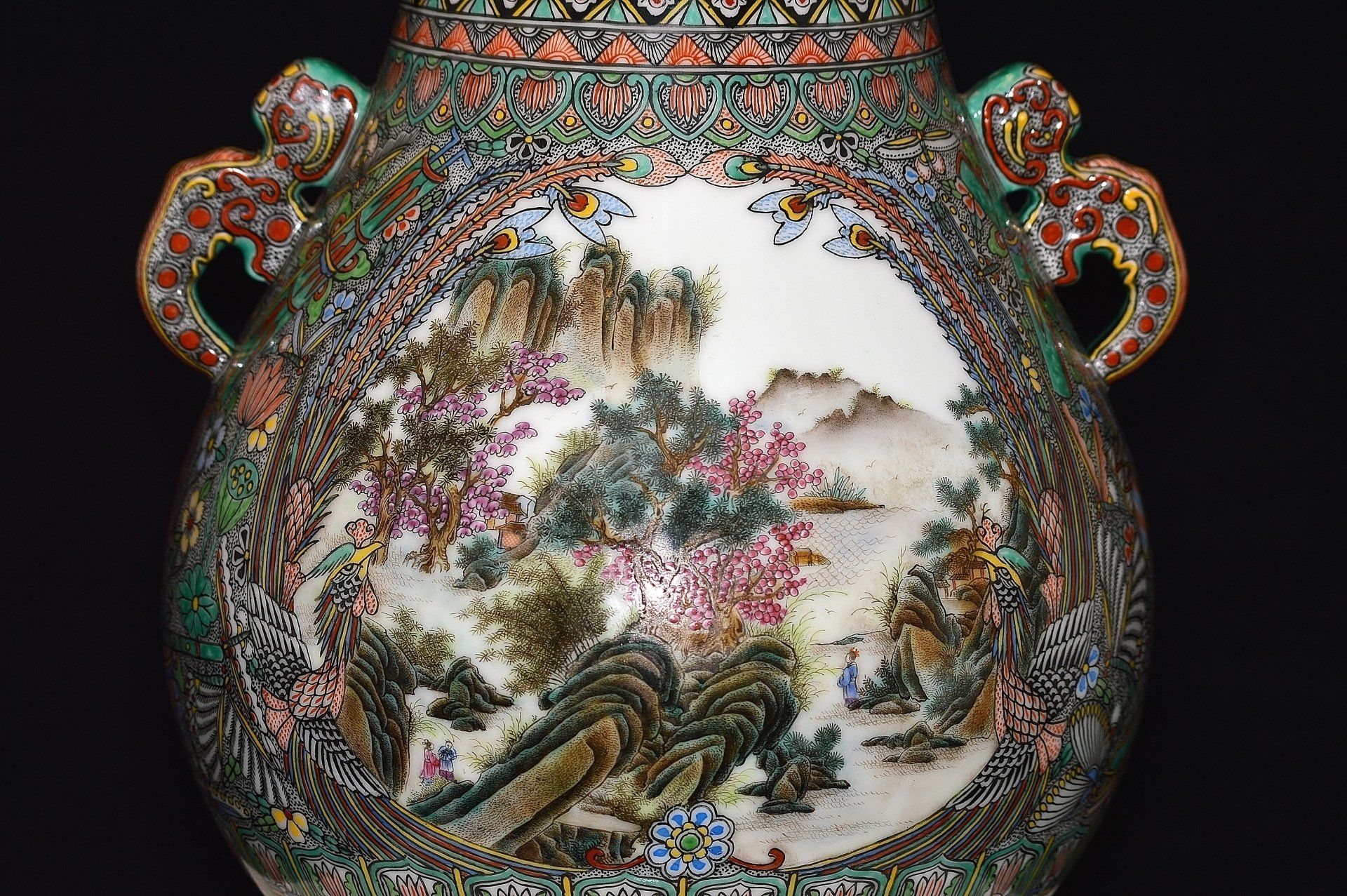**Chinese Antique Porcelain: Qing Dynasty Qianlong Marked and Period Famille Rose Landscape Vase** We are pleased to present an exceptionally rare and exquisite Famille Rose landscape vase, marked and produced during the Qianlong period (1736-1795). This remarkable piece features a Hu form and showcases motifs reminiscent of Islamic tile artistry, an influence that appeared intermittently in select porcelains during the Qianlong era. This elegantly painted vase exhibits a high level of craftsmanship, adorned with two meticulously detailed landscape panels depicting serene valleys. Each panel is intricately framed by dual phoenix figures, enhancing the overall aesthetic. The mark is strategically aligned with the principal panel, adhering to the characteristics typical of Imperial Qianlong porcelain. Recognized as the zenith of porcelain production in China, the Qianlong period holds significant historical and artistic value, and this vase epitomizes that legacy. The vase stands at approximately 10 1/2 inches tall. Should you have any inquiries regarding this distinguished piece, please do not hesitate to reach out.(click photo to enlarge)