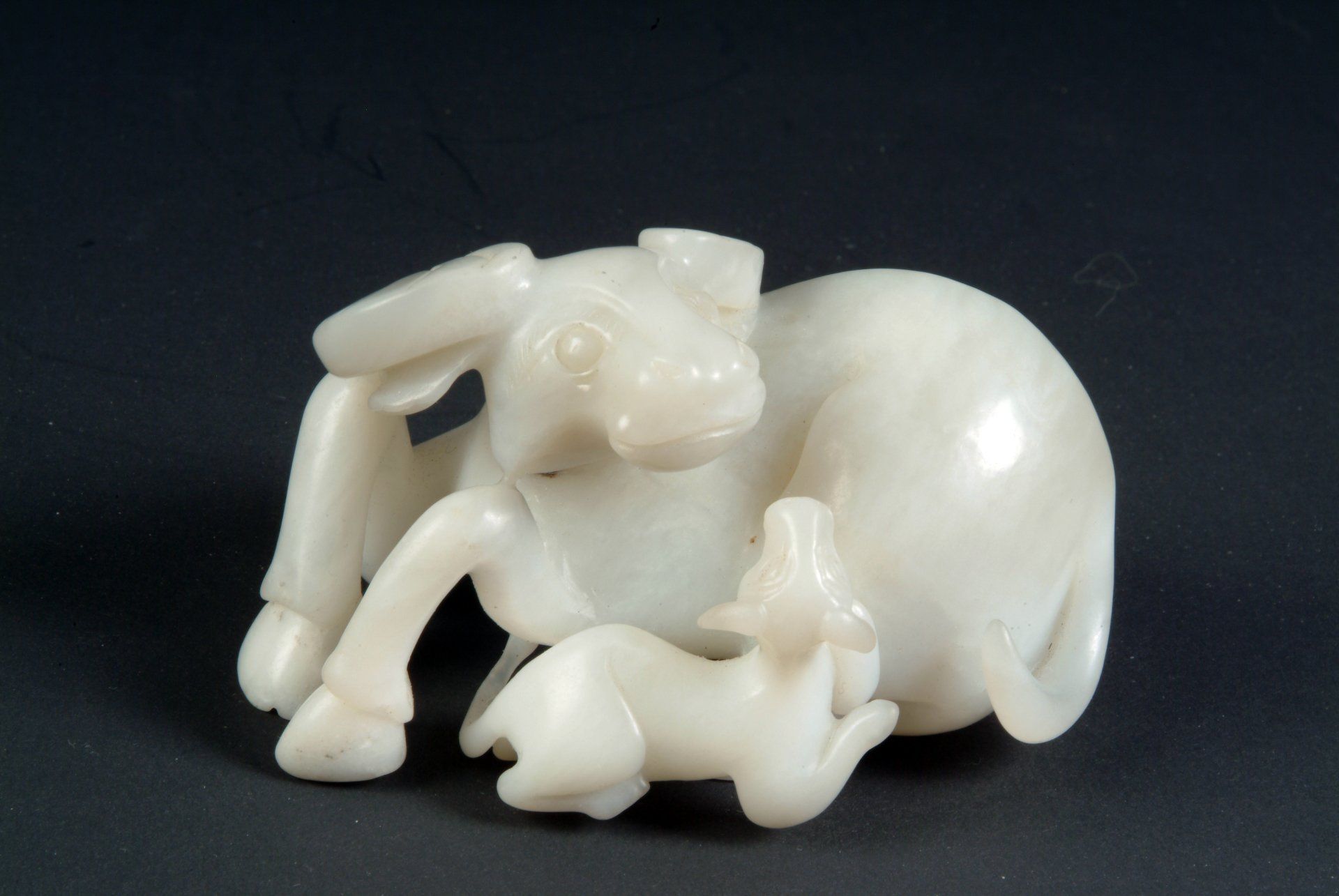 White Jade Sculpture of a Buffalo and Calf from the Qing Dynasty