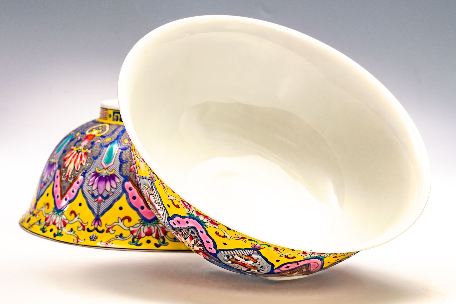 A Pair of Imperial Qing Dynasty Kangxi Yellow Ground Falangcai Enamel Bowls, Featuring a Deep Pink Four-Character Yuzhi Mark in a Double Square, Dating from the Kangxi Period