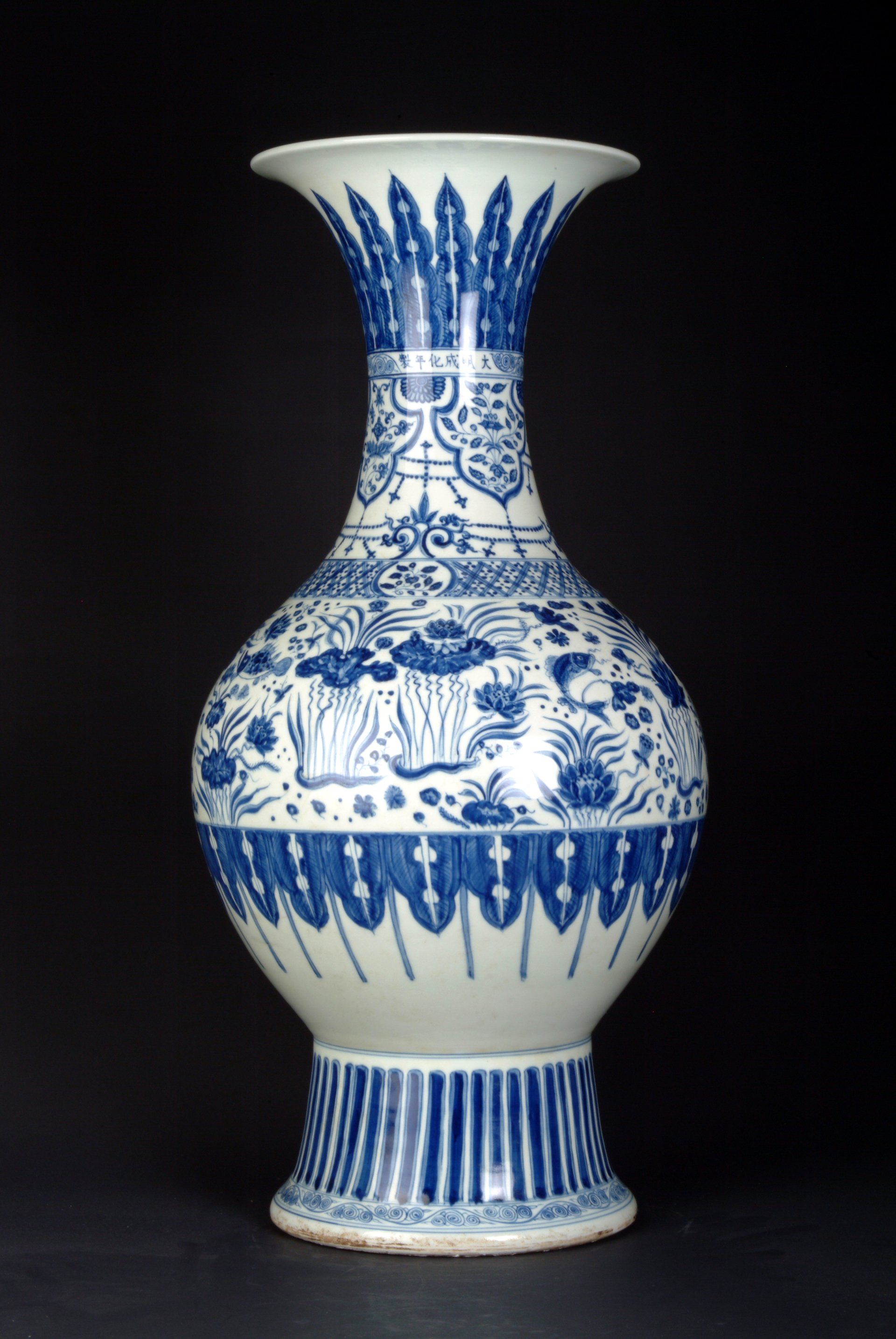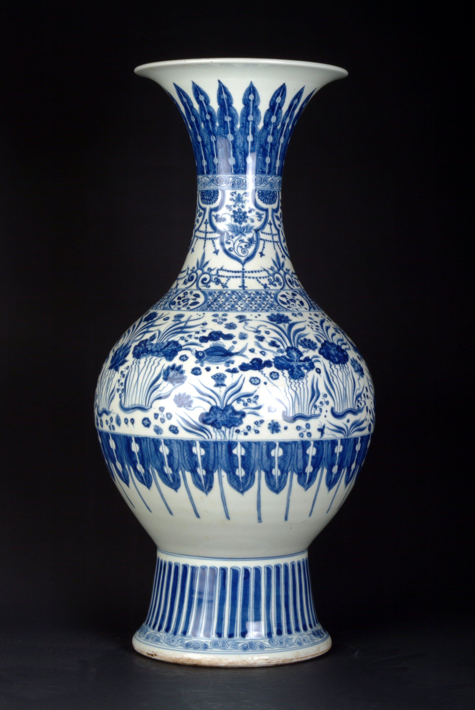 This exceptional and sizable blue and white vase, marked with the Chenghua Imperial seal from the Ming Dynasty, exemplifies the artistry of this distinguished period, which spanned from 1465 to 1487. The vase features intricate decorations, particularly a prominent band depicting fish amidst aquatic vegetation. While larger examples of Chenghua wares are rare, they do exist, and this piece is notably among the largest. The vase displays the six-character Chenghua mark elegantly inscribed in the secondary band. Upon reviewing auction catalogs, specialized publications, and museum collections, one will find that no larger Chenghua vase has been documented. Its form is exquisite, showcasing a brilliant color palette and demonstrating the controlled yet freehand brushwork typical of the finest Chenghua porcelain. The blue and white wares from this period represent the pinnacle of Chinese ceramic production. The cobalt pigment utilized during this era possesses a distinctive deep-blue hue, setting it apart from the blue and white wares of other periods. This unique coloration results from the use of imported cobalt, believed to originate from Persia, specifically a variant known as Somali blue, which has not been imported for over five centuries. Additionally, during the Chenghua era, a locally sourced cobalt known as Pitang was employed, allowing for various tonal refinements by blending the two. Chenghua artisans meticulously painted fine outlines and filled them using broad brush strokes, maintaining a balance between precision and expressiveness. Furthermore, they achieved a remarkable refinement of the clay and heightened kiln temperatures, leading to unique surface characteristics, such as slight mottling or burn marks at the base of the vase. The glaze, characterized by a fine texture and minute, evenly distributed bubbles detectable with a magnifying loop, is particularly notable. This museum-quality vase stands as an exemplary representation of true Imperial blue and white Chenghua wares. Evidence of age, manifested through flaking in the biscuit, attests to its historical significance. The vase measures approximately