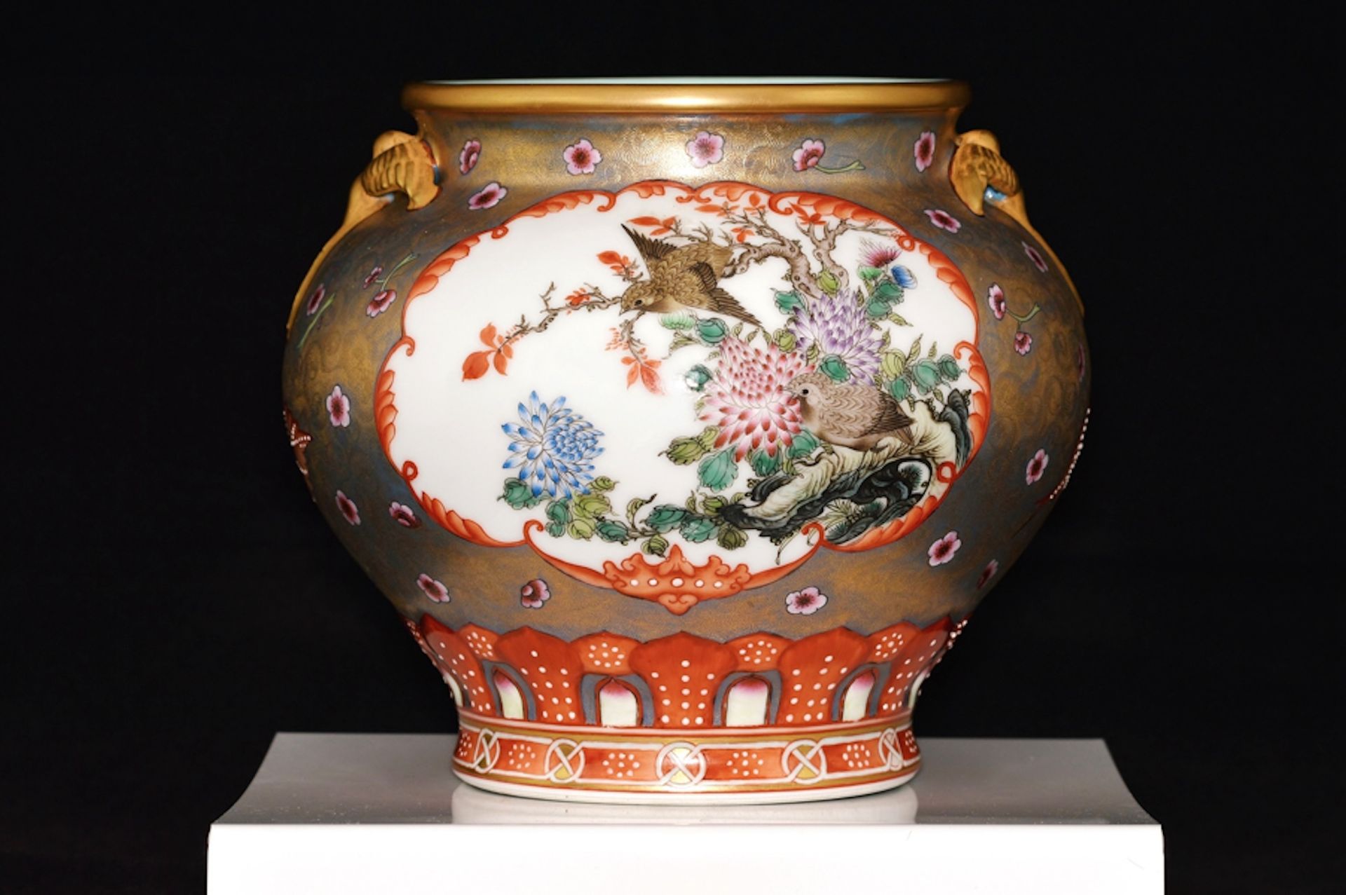 This Qianlong Famille Rose Guan-formed vessel represents the pinnacle of Chinese Famille Rose enamel porcelain artistry. It is arguably one of the finest examples ever documented and made available for acquisition. I invite you to reference your scholarly texts, explore auction catalogs, and consult major museums worldwide in search of a piece that may rival its unparalleled beauty and craftsmanship. The complexity of this vessel is remarkable, warranting an in-person examination to fully appreciate its exquisite details. The vessel features a multi-layered decorative scheme, with an elegant form defined by a striking blue ground that has been incised in a subtle wave-like pattern and subsequently adorned with gold accents. Scattered across the surface are delicate rose-colored blossoms that enhance its allure. The central panels exhibit masterful brushwork, showcasing branches embellished with blooming flowers and two magpie birds, all executed with an astonishing level of control—many strokes appearing to be applied with a single hair, a detail that becomes evident upon close inspection with a loupe. The panels are framed in iron red, while two leaves, also in iron red, bear intricately painted depictions of a cricket and a grasshopper. Two gold phoenix handles elevate the vessel's design, complemented by meticulously applied droplets of white enamel that accentuate the iron red throughout the piece. The interior and base are finished in a stunning turquoise hue. The color palette adheres to the esteemed Qianlong Famille Rose tradition, and the underside bears the Qianlong mark—positioned in alignment with the main panels, a characteristic typical of Imperial Qianlong pieces. Standing at 7 5/8 inches tall, this vessel epitomizes the high standards set for true masterpieces of Chinese porcelain. For any inquiries regarding this exceptional vessel, please do not hesitate to reach out.