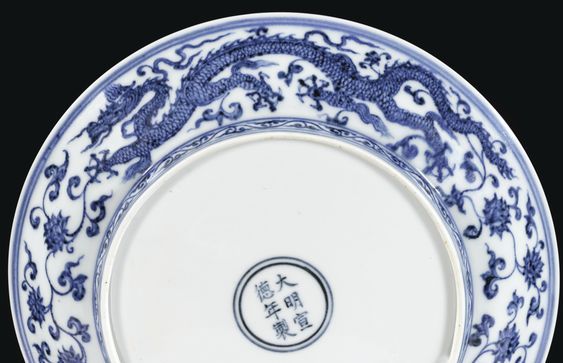 Christie's sold this Blue and White Lotus Dish 10/3/4" Dia.in Hong Kong 5/29/2019 for approx. $465,000.usd The dish has a reign mark is written on side The base is unglazed. These corrupt Auction Houses cheat all collectors because they don't have the opportunity to purchase the rarest and finest pieces in the world also by keeping the finest pieces out of their auctions the average collector has no idea where their pieces fit the marketplace or what the value should be.