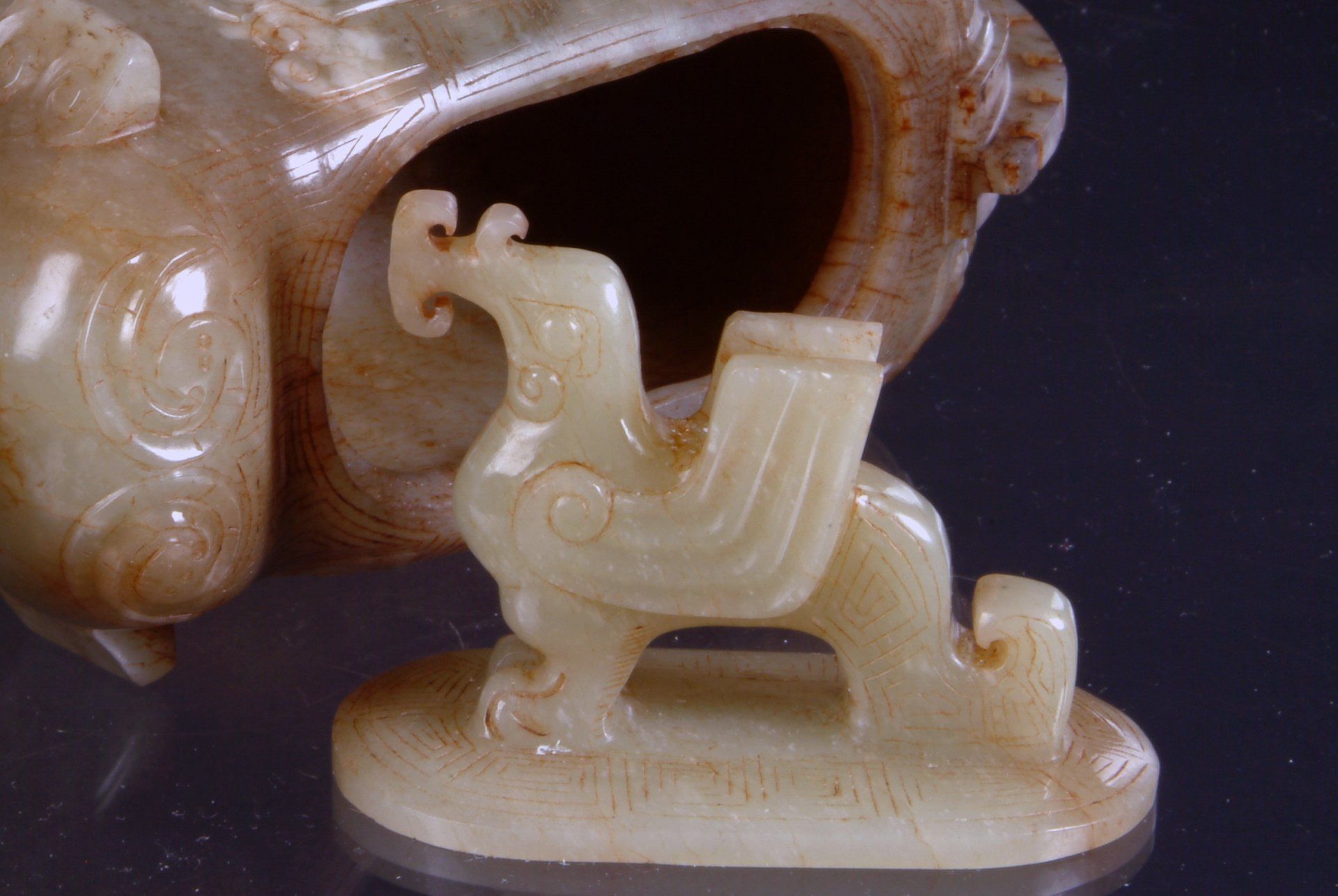 This exceptional Eastern Zhou pale celadon elephant vessel is a notable artifact from the period. It is masterfully carved, showcasing intricate and highly stylized details characteristic of the Eastern Zhou era. The lid is adorned with a finial in the form of a mythical bird. The translucent pale celadon jade features extensive brownish veining and inclusions, which further attest to its historical provenance. The vessel measures approximately 7 inches in length.