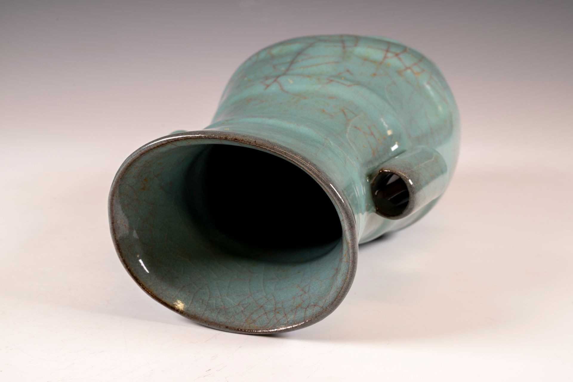 غوان ياو من عهد أسرة سونغ الجنوبية: مزهرية بيضاوية رسمية من سيراميك غوان الإمبراطوري من الفرن الداخلي شيونيسي بمقبض أنبوبي، تحمل علامة وتاريخًا يعود إلى تلك الفترة