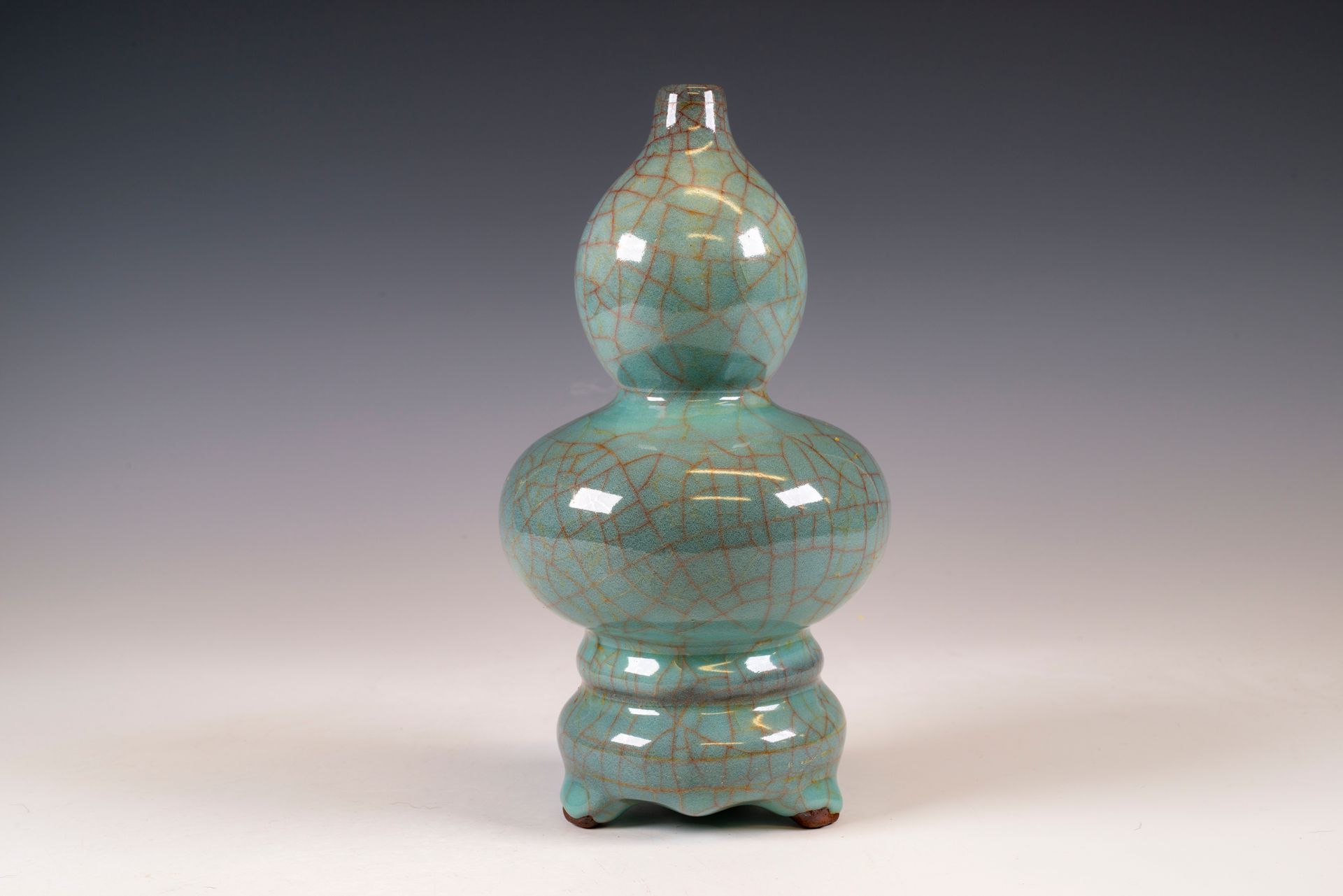 مزهرية زجاجية مزدوجة من عهد أسرة سونغ الجنوبية. صُنعت هذه المزهرية الزجاجية المزدوجة الرائعة خلال فترة العلامة الإمبراطورية في فرن غوان الرسمي، وهي تُجسّد براعة فنّ صناعة خزف غوان المُنتج في فرن شيونيسي الداخلي. تتميز المزهرية بطبقات متعددة من طلاء زجاجي مميز ذي لون أزرق مائل للزرقة مع مسحة خضراء خفيفة، طُبّقت بمهارة على جسم نحيف للحصول على طلاء زجاجي أكثر سمكًا. يُكمّل سطح المزهرية المتشقق اللافت علامة غوان الرسمية الموجودة على القاعدة. بالإضافة إلى ذلك، فهي مُدعّمة بثلاثة أرجل حديدية ناتجة عن عملية الحرق، وتتميز بلون بني مغرة داكن مشتق من مادة الطين الأساسية. يُفهم مصطلح "شيو ني سي" على أنه يشير إلى إدارة تموين القصر، وتحديدًا قسم شوناي. بعد غزو جيوش جين الذي أجبر البلاط الإمبراطوري جنوبًا من أسرة سونغ الشمالية عام 1127 ميلادي، تأسست أسرة سونغ الجنوبية في هانغتشو. يبلغ ارتفاع المزهرية حوالي 9 1/4 بوصة.