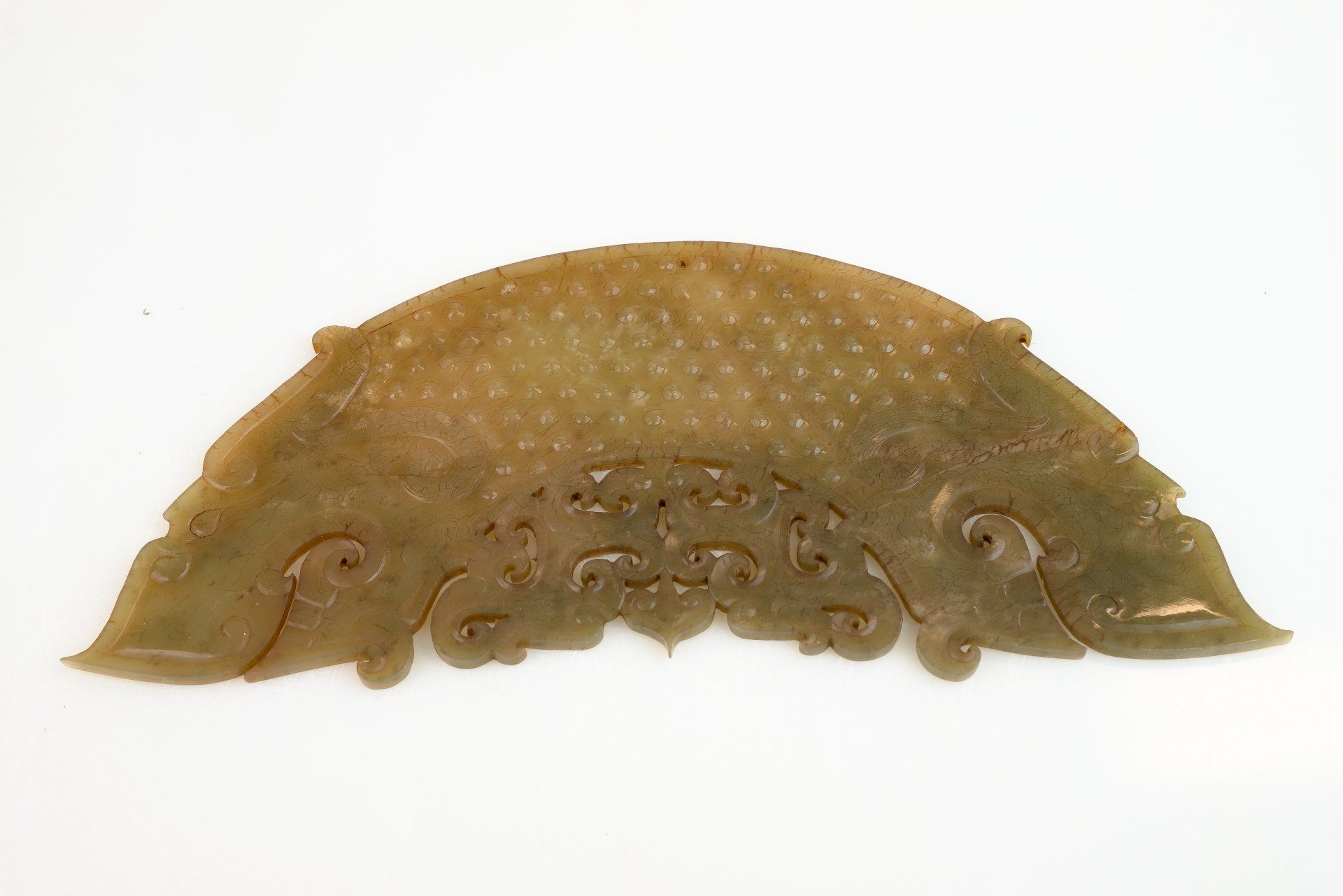 هذه القطعة الرائعة من اليشم القديم من فترة الدول المتحاربة، الواقعة في عهد أسرة تشو الشرقية، تجسد حرفية استثنائية. تم تشكيل قلادة اليشم، المعروفة باسم هوانغ، بشكل فني على شكل قوس وتتميز برأسين تنين منحوتتين بشكل معقد، مزينين بنمط حبيبات محكم تتخلله سحب مخرمة. المادة عبارة عن يشم سيلادون شفاف يعرض شوائب أعطت لونًا بنيًا لمعظم القلادة، إلى جانب مناطق موضعية من التكلس. تُظهر المنحوتات دقة لا مثيل لها، مما يميزها بشكل لا لبس فيه كقطعة أثرية أصلية من هذه الحقبة التاريخية. تظهر الخطوط الدقيقة كما لو تم التنقيب عنها بدقة في أقسام دقيقة - وهي تقنية معقدة لا يمكن ملاحظتها إلا في أفضل قطع اليشم من أسرة تشو الشرقية. تتطلب هذه الدقة استخدام عدسة مكبرة عالية الجودة للفحص المناسب. لا تزال الطبيعة الدقيقة للأدوات المستخدمة في إنشاء هذه القطعة غير معروفة، مما يؤدي إلى تكهنات مستمرة؛ يُنظّر البعض لاستخدام أدوات ذات رؤوس ماسية تُشبه السكاكين. وبما أن اليشم يتمتع بصلابة تُضاهي الفولاذ، فإن تحقيق هذه التفاصيل الدقيقة دون المخاطرة بتقطيع الحجر أو تشققه أو كسره يُمثل معضلةً حيرت الباحثين المُتخصصين في دراسة منحوتات اليشم. يُذكر أن هذه الحرفية لم تظهر في أي حقبة أخرى عبر التاريخ الصيني. يبلغ طول أداة هوانغ، المصنوعة خلال فترة الممالك المتحاربة (حوالي 476 قبل الميلاد إلى 221 قبل الميلاد)، حوالي 9.25 بوصة، وهي مُجهزة بفتحة مخروطية صغيرة مُثقوبة للتعليق.