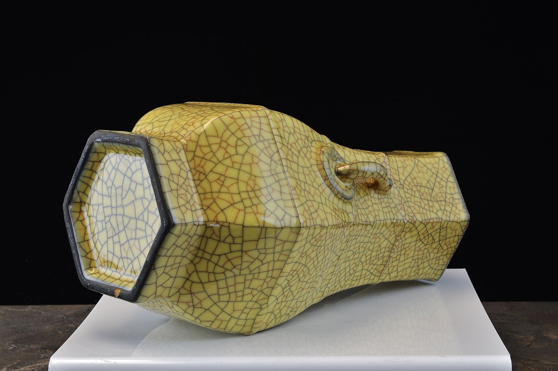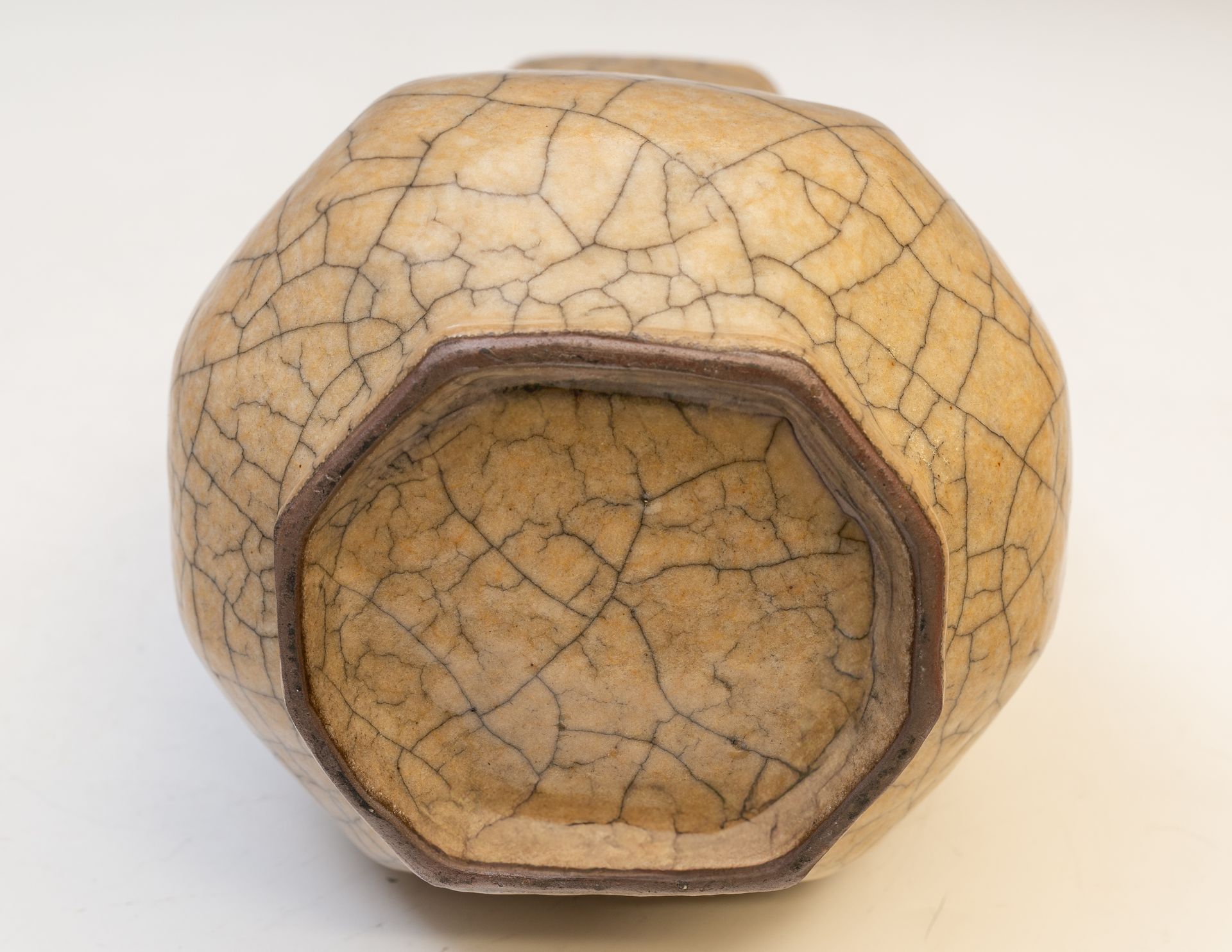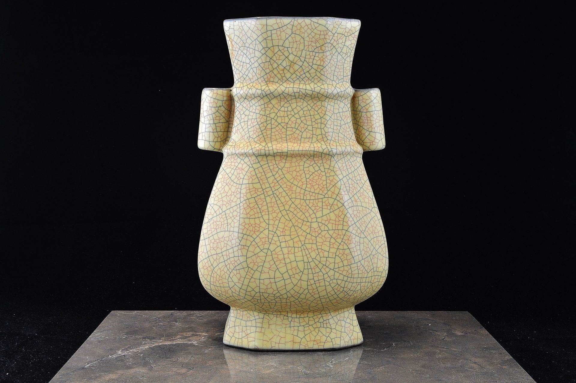 فرن جي من سلالة سونغ الجنوبية/يوان، مزهرية سداسية الشكل من خزف جي، تُظهر طقطقة خيط دم ثعبان البحر الرقيق، وقاعدة حديدية، بلون يُذكر بالقمح. يُعرف فرن جي بأنه فرن رائد من سلالة سونغ الجنوبية إلى سلالة يوان، ويبلغ ارتفاعه حوالي 10 بوصات. ppjrs