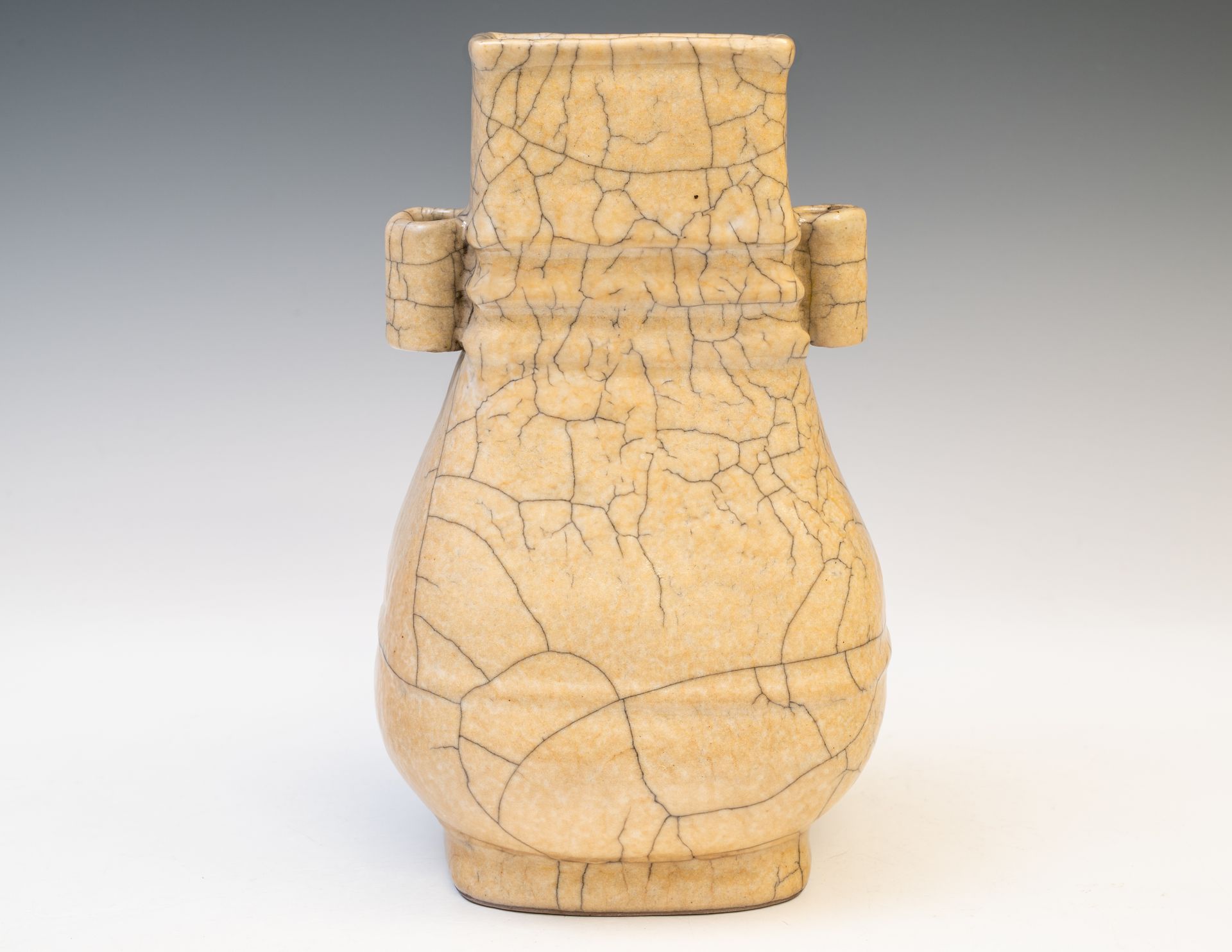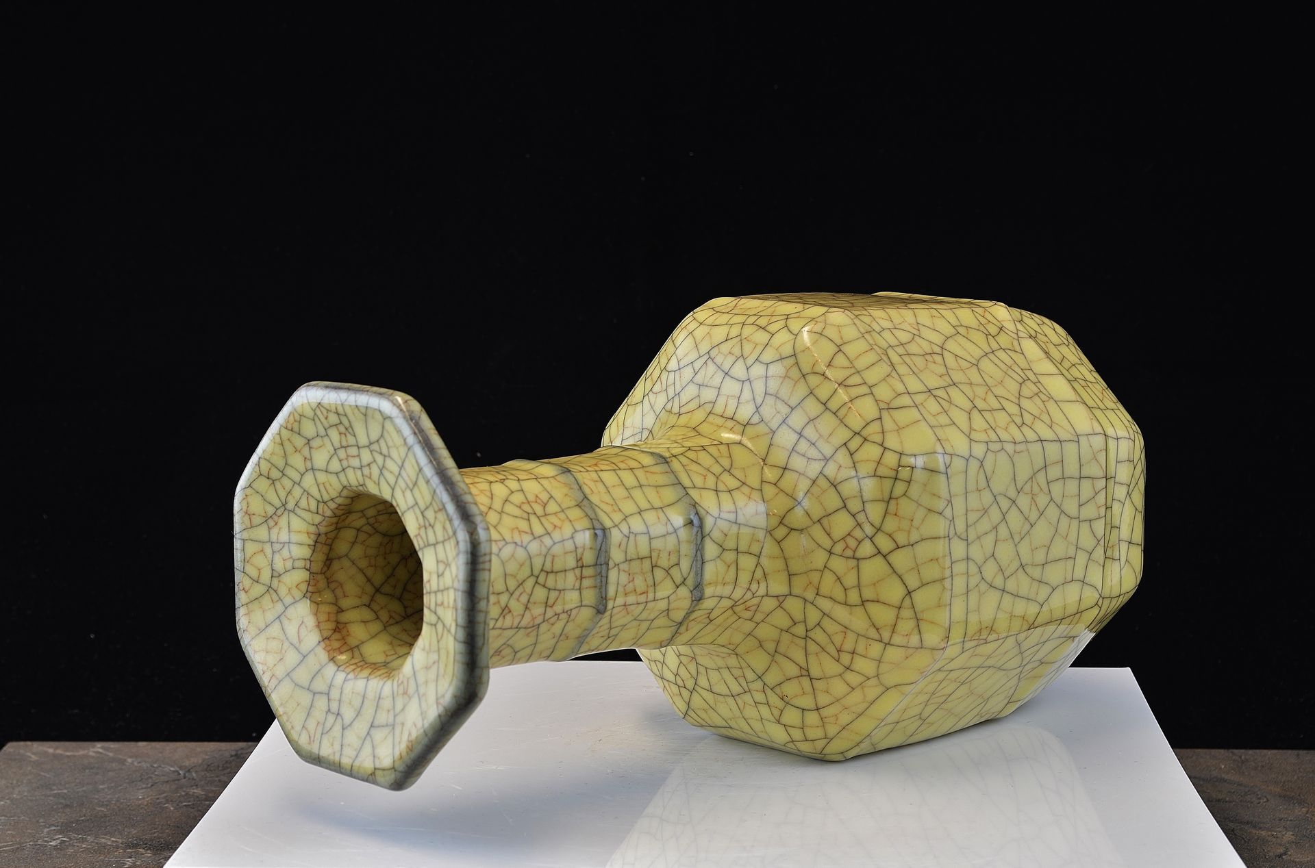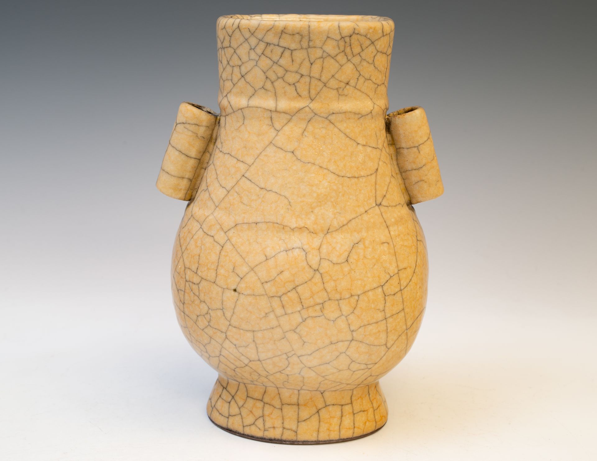 فرن جي من سلالة سونغ الجنوبية/يوان، مزهرية سداسية الشكل من خزف جي، تُظهر طقطقة خيط دم ثعبان البحر الرقيق، وقاعدة حديدية، بلون يُذكر بالقمح. يُعرف فرن جي بأنه فرن رائد من سلالة سونغ الجنوبية إلى سلالة يوان، ويبلغ ارتفاعه حوالي 10 بوصات. ppjrs