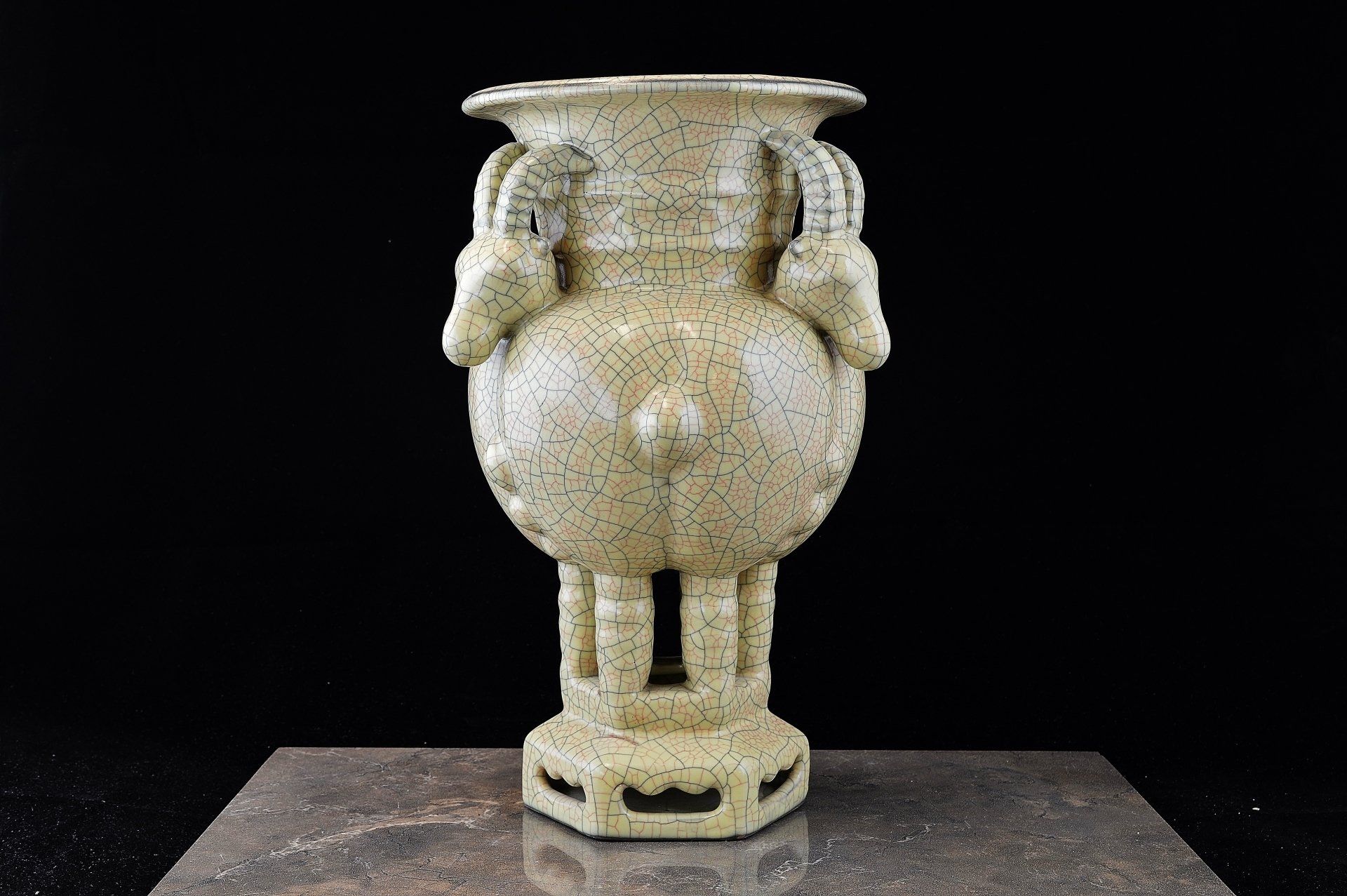 فرن جي من عهد أسرة سونغ الجنوبية/يوان. مزهرية كبيرة من خزف جي، تتميز بثلاثة مقابض على شكل رأس كبش، بلون يُذكرنا بالقمح، وفم أرجواني، وقاعدة حديدية. تُظهر القطعة زخارف من الأسلاك الحديدية وخيوط حمراء دموية نادرة تُصدر صوت طقطقة. يُعرف فرن جي، الذي غالبًا ما يُشار إليه بفرن الأخ الأكبر خلال عهد أسرتي سونغ الجنوبية ويوان، بحرفيته العالية. بفضل جودته الاستثنائية، وجماله الأخّاذ، وأبعاده الكبيرة - التي يبلغ ارتفاعها حوالي 13 3/8 بوصة - يُرجّح أن هذه المزهرية كانت تُستخدم كقطعة فنية تذكارية. ppjrs