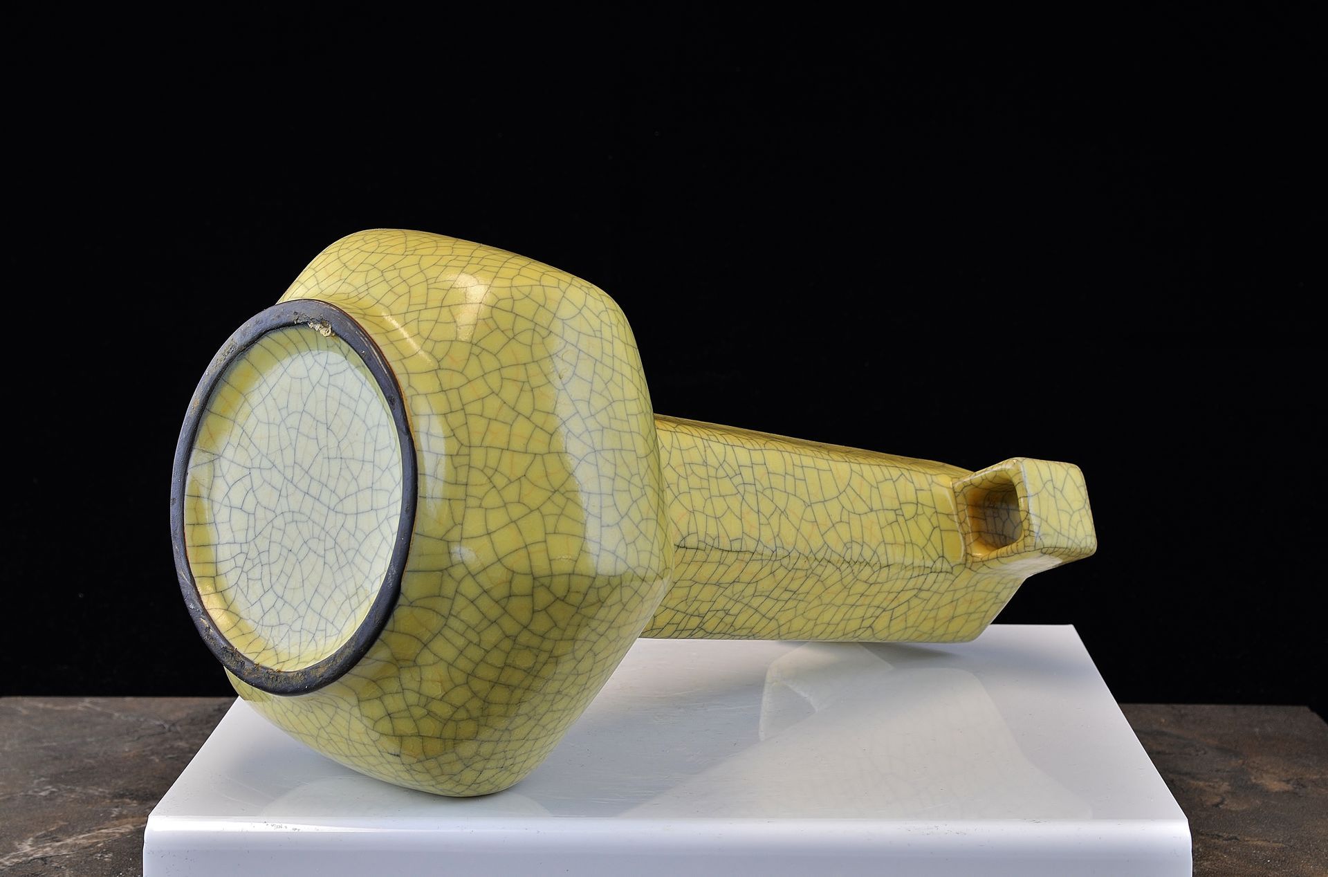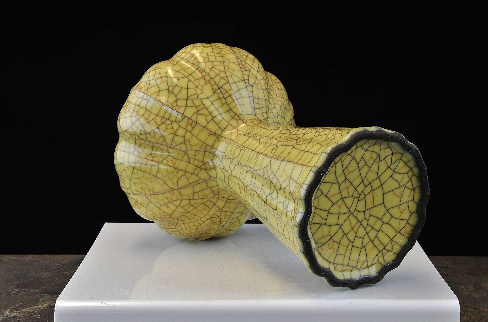 مزهرية على شكل بطيخة من فرن جي، من عهد أسرة سونغ/يوان، على قاعدة، بفم أرجواني، مزينة بخطوط ذهبية متشققة من أسلاك الحديد، وقاعدة حديدية. يشبه لونها لون القمح. يُعرف فرن جي بأنه فرن مميز لخشب البلسان، بدءًا من عهد أسرة سونغ الجنوبية وحتى عهد أسرة يوان. عند إضاءته بمصباح يدوي، يكشف الفم الأرجواني المزجج بطبقة رقيقة عن لمسة خفيفة من اللون الأرجواني. يبلغ ارتفاع المزهرية حوالي 9 7/8 بوصة. ppjrs