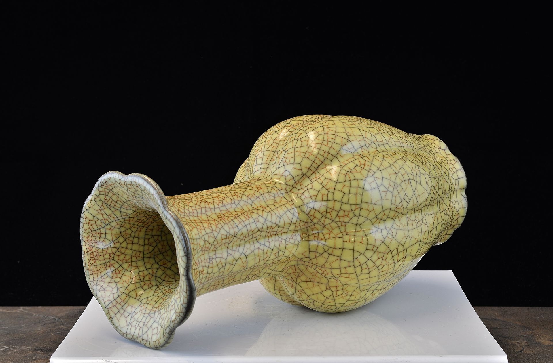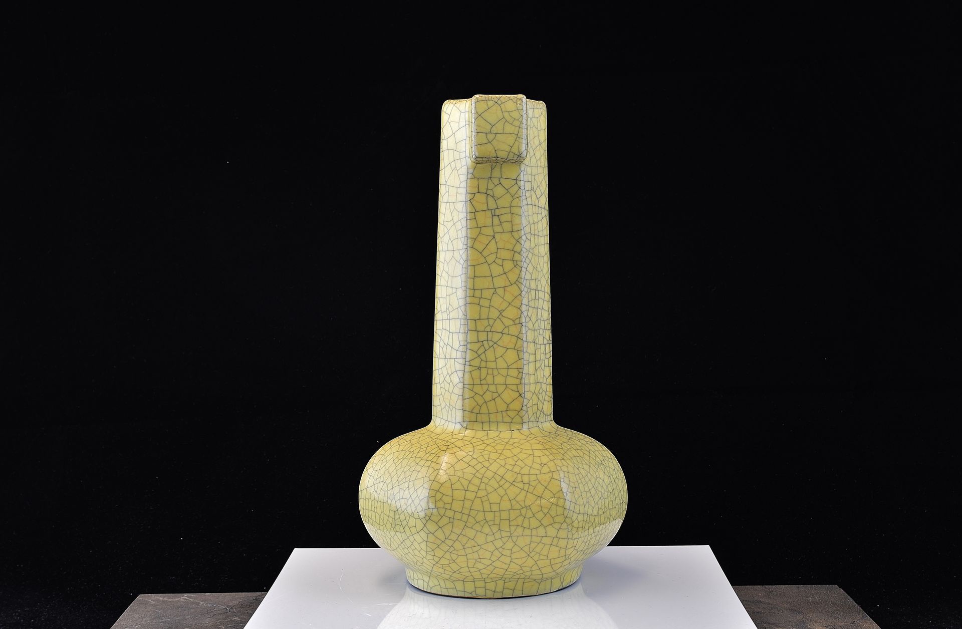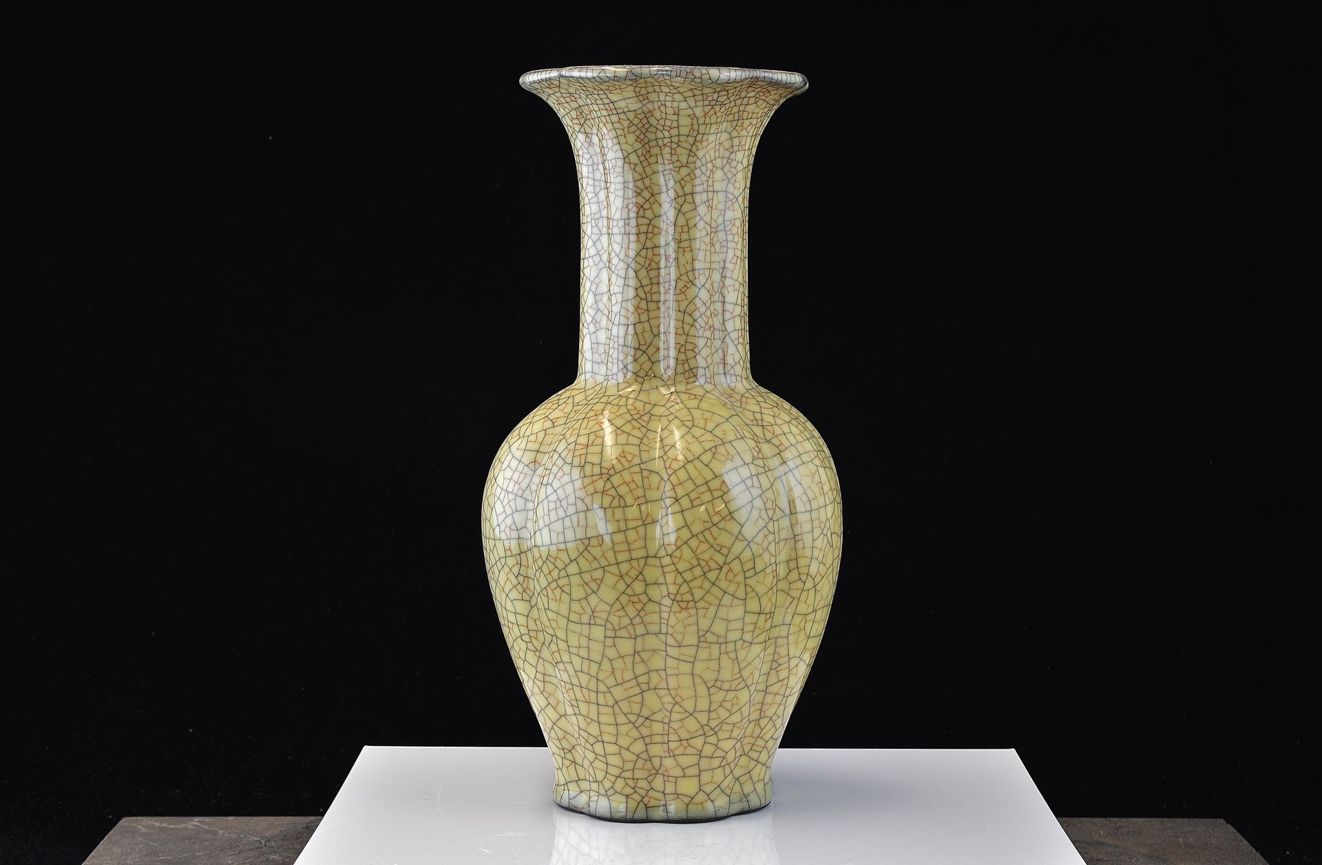 تُمثل هذه المزهرية الفنية الرائعة من "جي" بعضًا من أرقى نماذج خزف "جي" المسجلة على الإطلاق. وقد ميّز الصينيون تاريخيًا أرقى خزف "جي" بلونها الشبيه بلون القمح، مكملًا بحافة أرجوانية مميزة، حيث يخفّ الطلاء، مُضفيًا لمسة أرجوانية خفيفة عند الفوهة. علاوة على ذلك، تتميز هذه القطع بقاعدة حديدية بارزة على حلقة القاعدة، نتيجة استخدام طين بني فاتح غني بالحديد يتحول إلى لون بني داكن بعد الحرق. غالبًا ما يُوصف نمط التكسير بأنه يُشبه سلكًا حديديًا متشابكًا بخيوط ذهبية، مما يُضفي عليها لمسة جمالية فريدة. ازدهر فرن "جي"، المعروف بفرن الأخ الأكبر، خلال عهد أسرتي سونغ الجنوبية ويوان. يُرجّح تصنيف هذه المزهرية تحديدًا ضمن خزف التكريم نظرًا لجودتها وجمالها الرائع وحجمها الكبير، الذي يبلغ ارتفاعه حوالي 14 بوصة. ppjrs