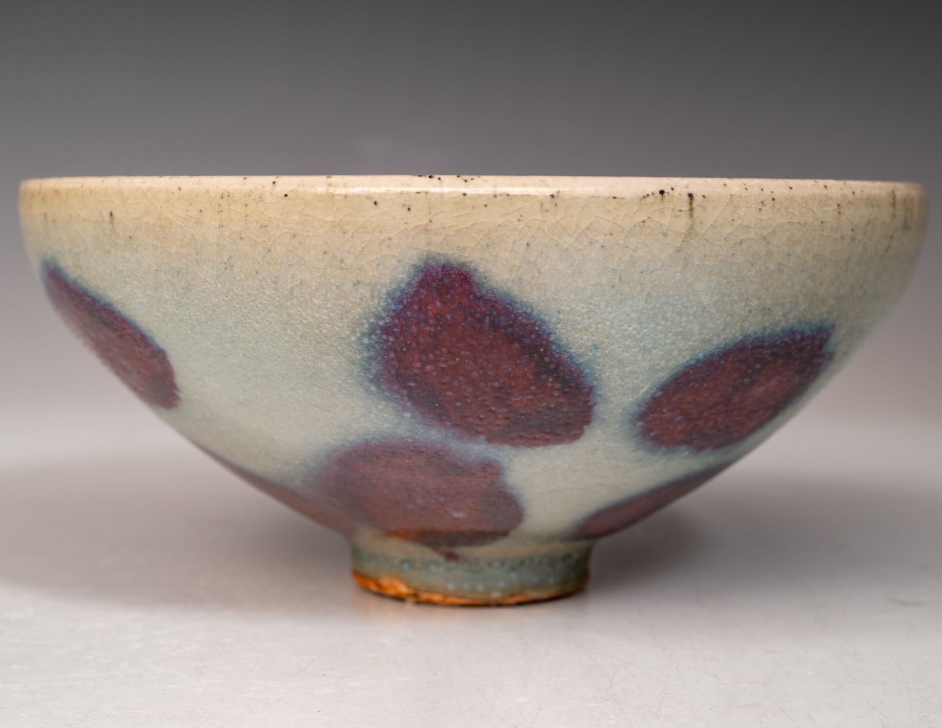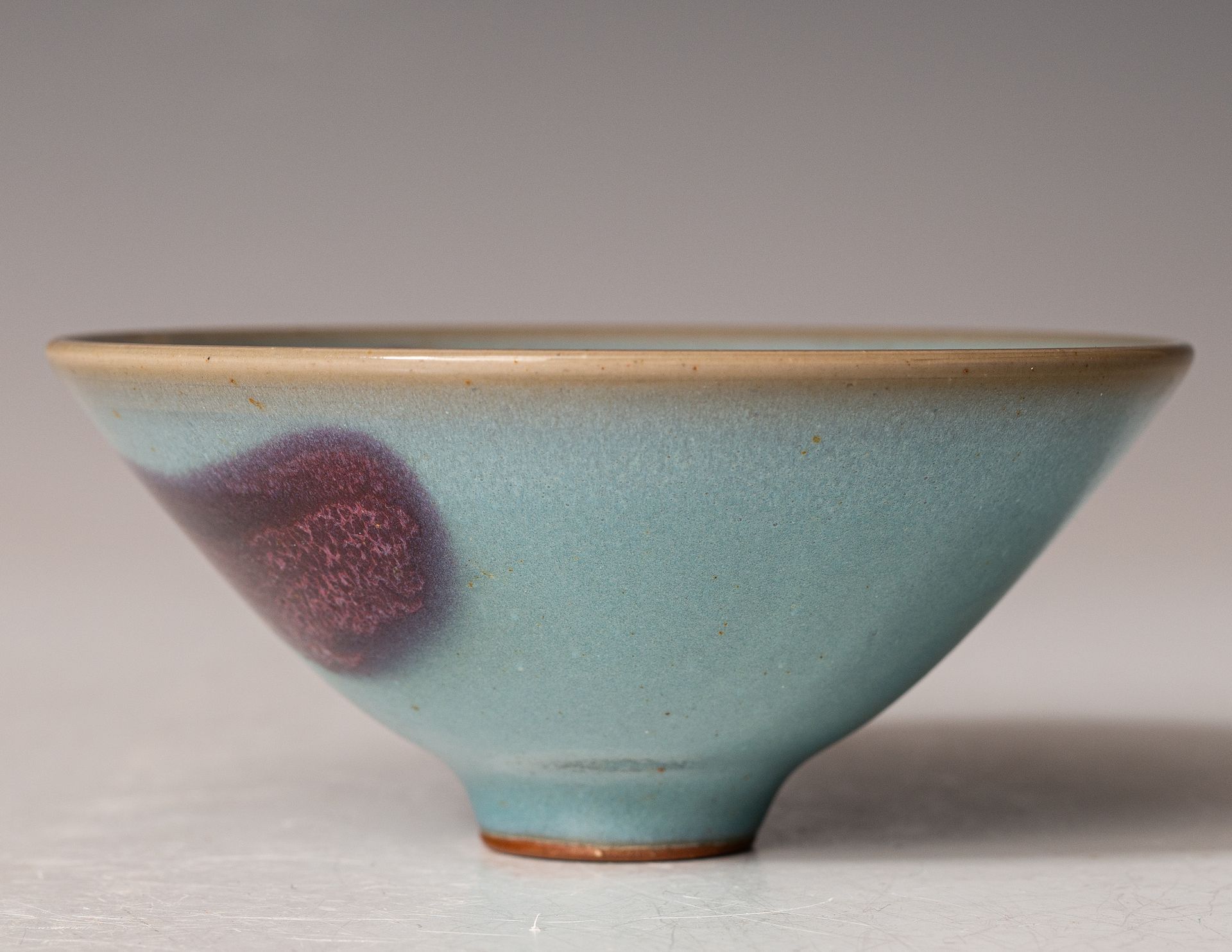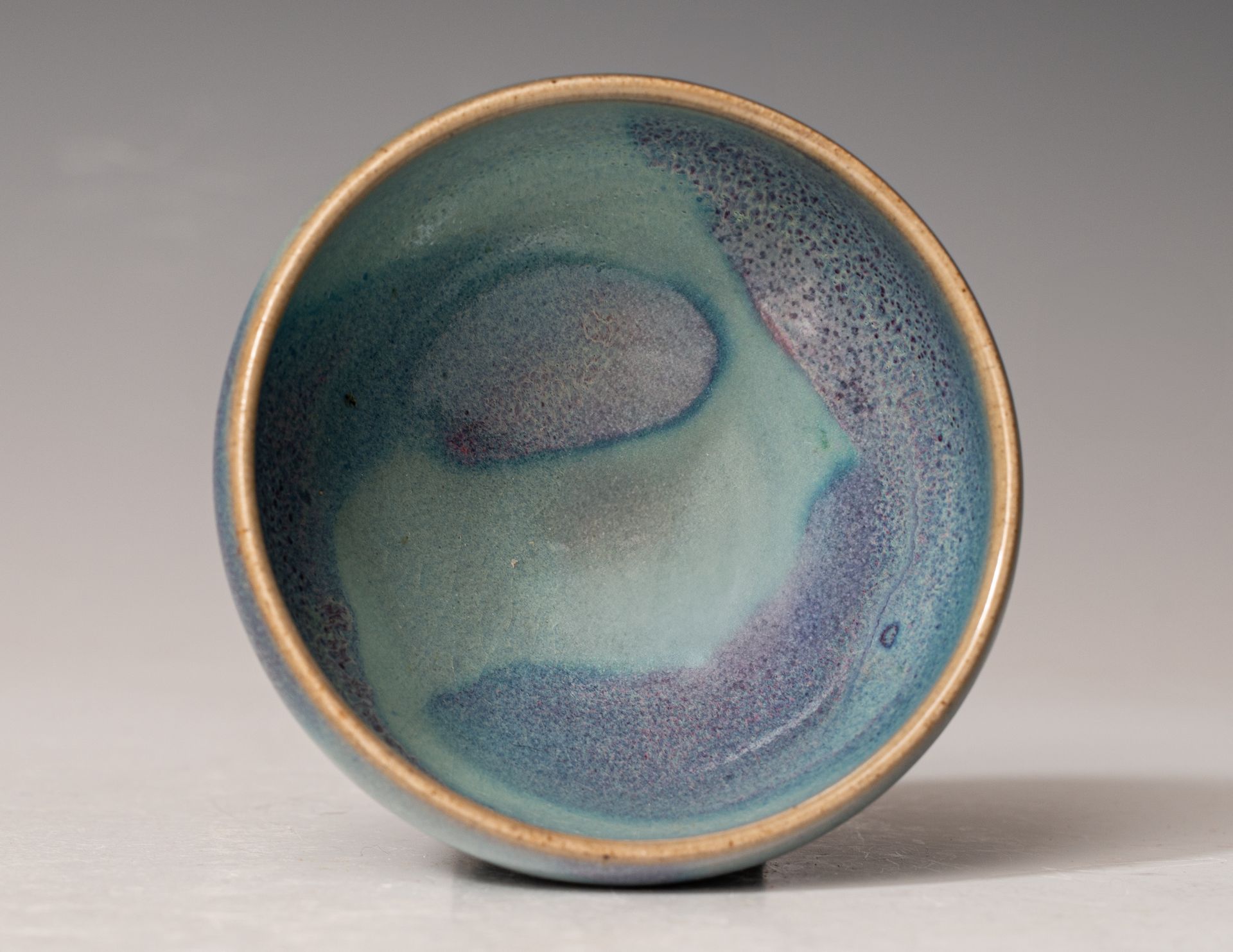 يتميز هذا الوعاء المخروطي من سلالة سونغ الشمالية بطلاء أزرق مميز بلون بيضة طائر روبن، مزين ببقع أرجوانية من الداخل والخارج. يتحول الطلاء تدريجيًا إلى لون الفطر على طول الحافة. يبلغ قطر الوعاء 10 سم. ppjrs