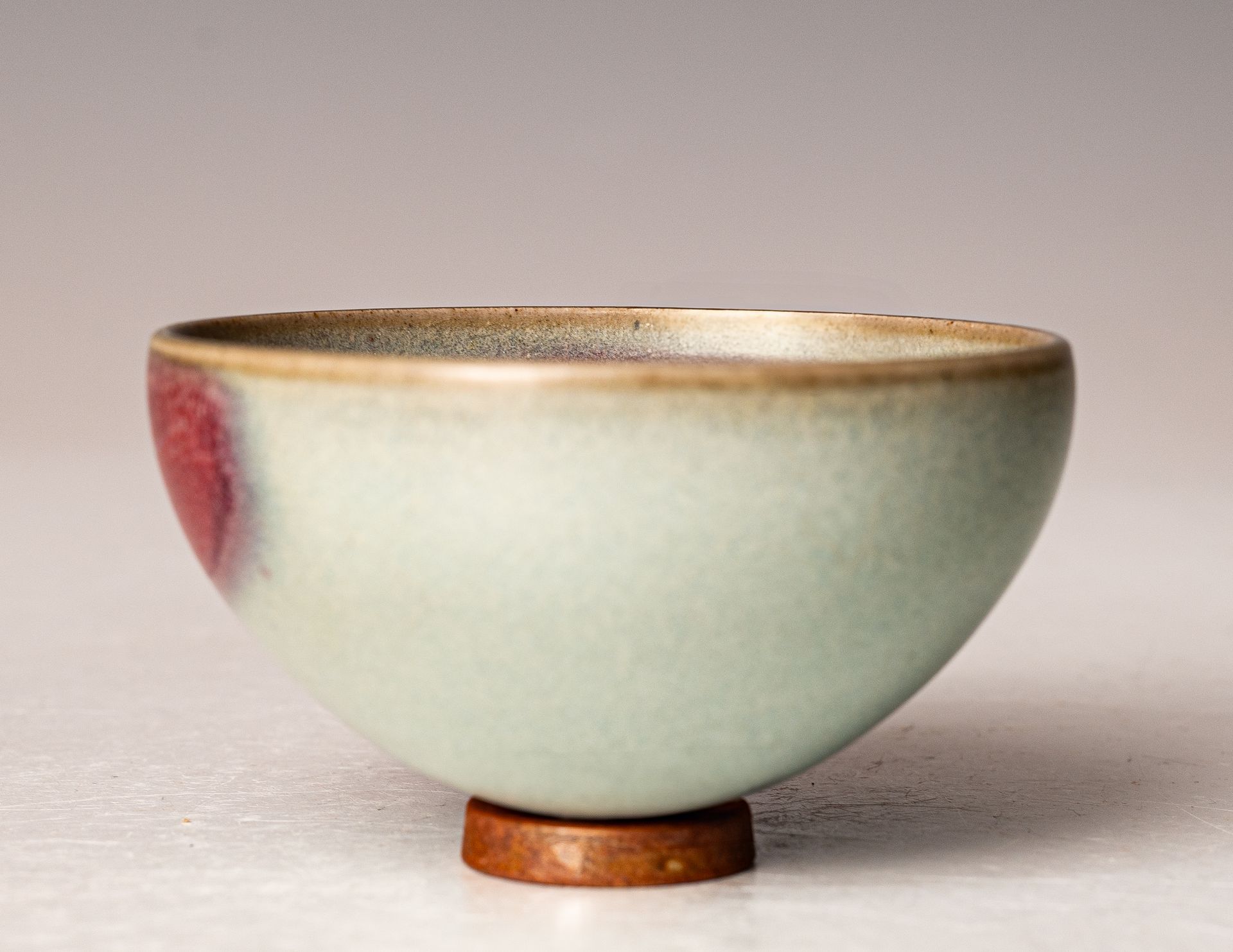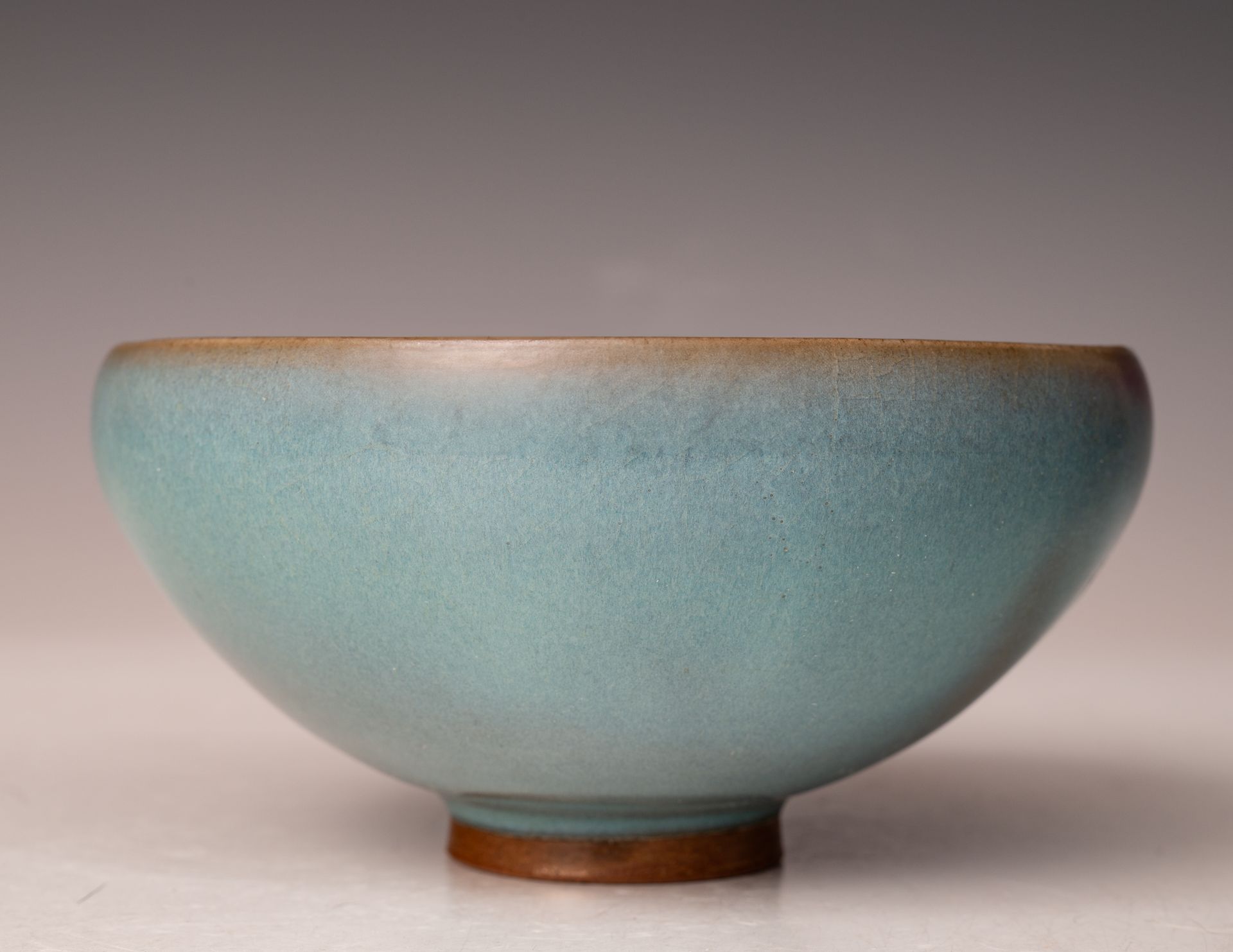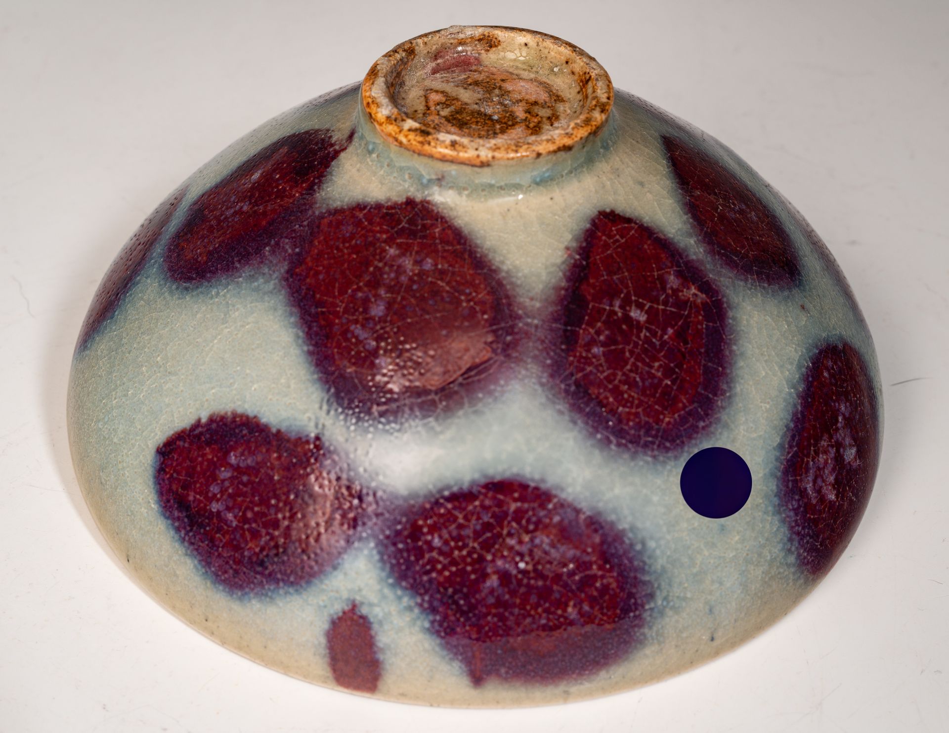 يتميز هذا الوعاء المخروطي من سلالة سونغ الشمالية بطلاء أزرق مميز بلون بيضة طائر روبن، مزين ببقع أرجوانية من الداخل والخارج. يتحول الطلاء تدريجيًا إلى لون الفطر على طول الحافة. يبلغ قطر الوعاء 10 سم. ppjrs