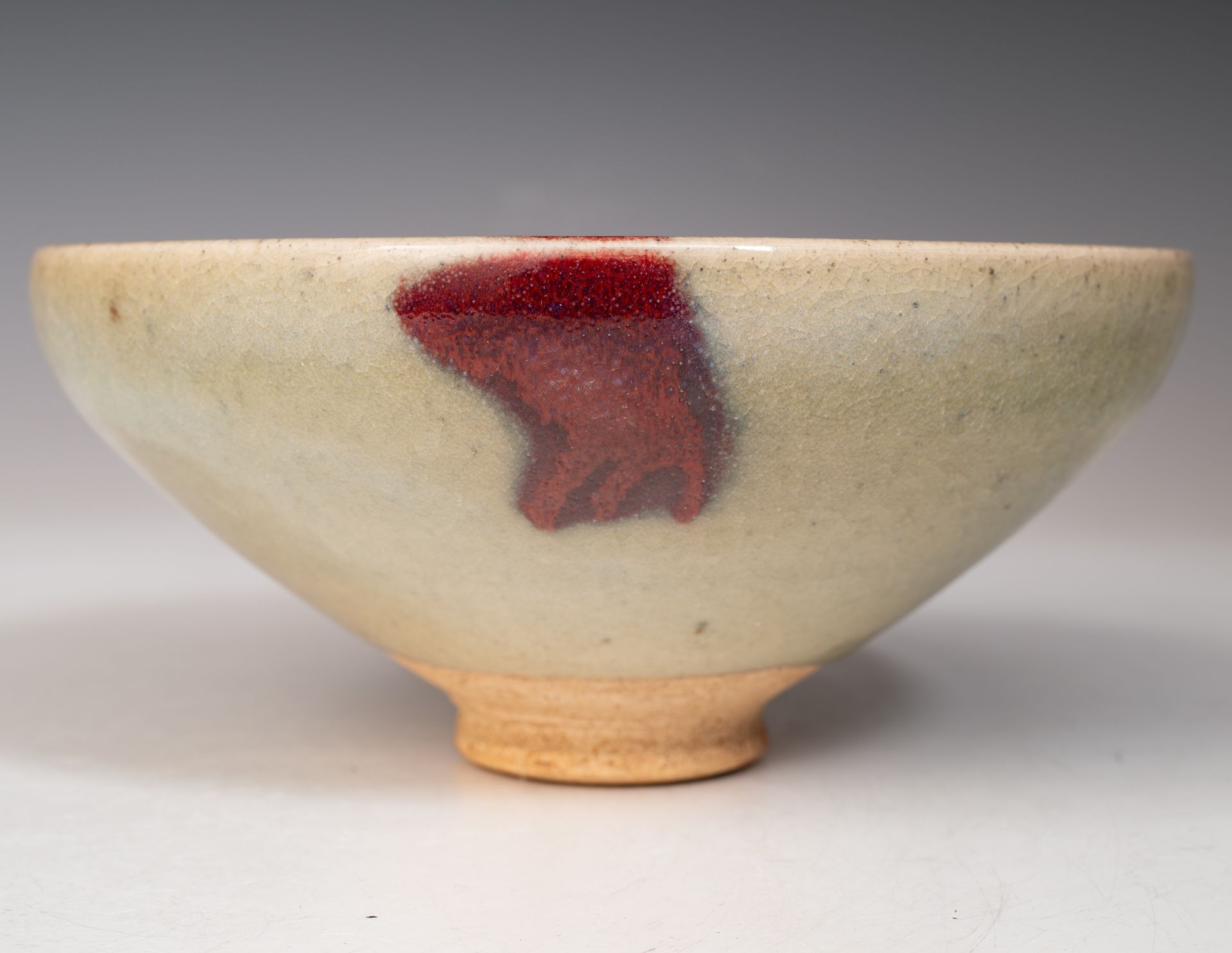 هذا الوعاء المخروطي من عهد أسرة يوان، يتميز بطلائه الأبيض المزرق الباهت، مع بقع أرجوانية من الداخل وعلى الحافة. يتحول الطلاء بسلاسة إلى لون فطري عند الحافة. يبلغ قطر الوعاء 3.5 بوصة. ppjrs