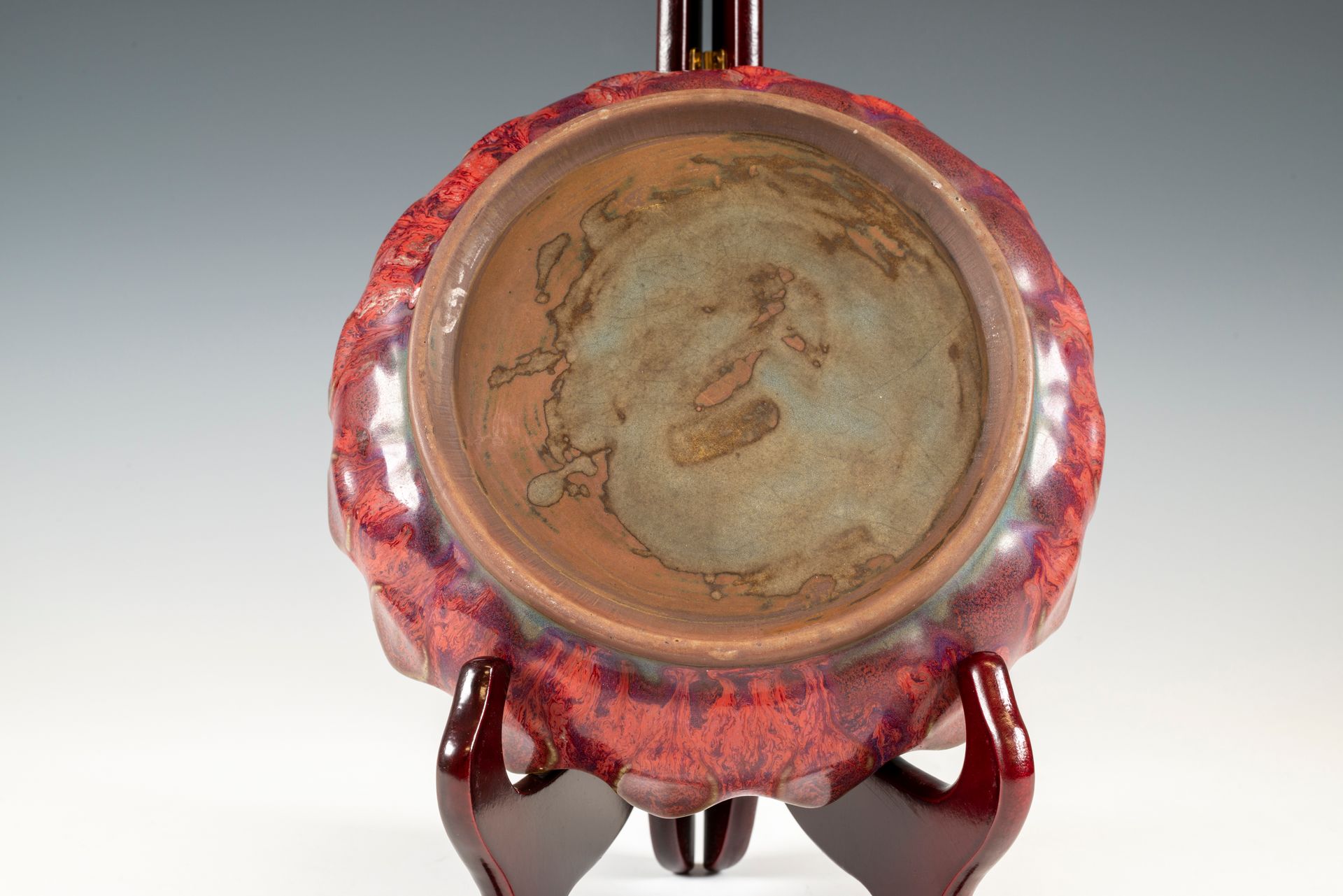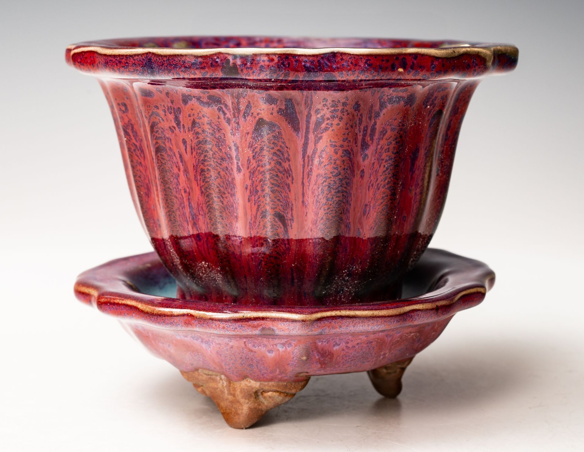 وعاء زهور وطبق من فخار جون من عهد أسرة سونغ مطلي بطلاء أحمر وجزء داخلي أزرق مزين بآثار ديدان