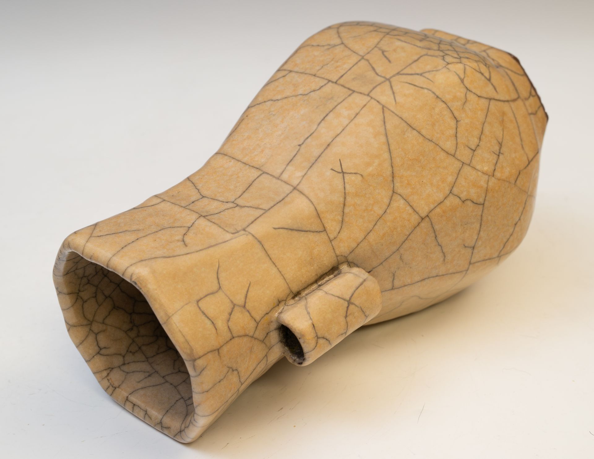 مزهرية من فرن جيه، مصنوعة على شكل هو، بمقابض أنبوبية، من عهد أسرة سونغ الجنوبية/يوان، يُرجَّح أنها صُنعت في أوائل عهد أسرة سونغ الجنوبية، وتتميز بعملية حرق غير دقيقة، مما أدى إلى زيادة سمك طبقة التزجيج نتيجةً لعدم التحكم الكامل في تقنيات التزجيج في ذلك الوقت. تتميز المزهرية بقاعدة حديدية ولون يُذكرنا بالقمح. يُعتبر فرن جيه سلفًا للأفران الأخرى خلال الفترة الانتقالية من عهد أسرة سونغ الجنوبية إلى عهد أسرة يوان. يبلغ ارتفاع المزهرية التقريبي 8 بوصات ونصف. ppjrs