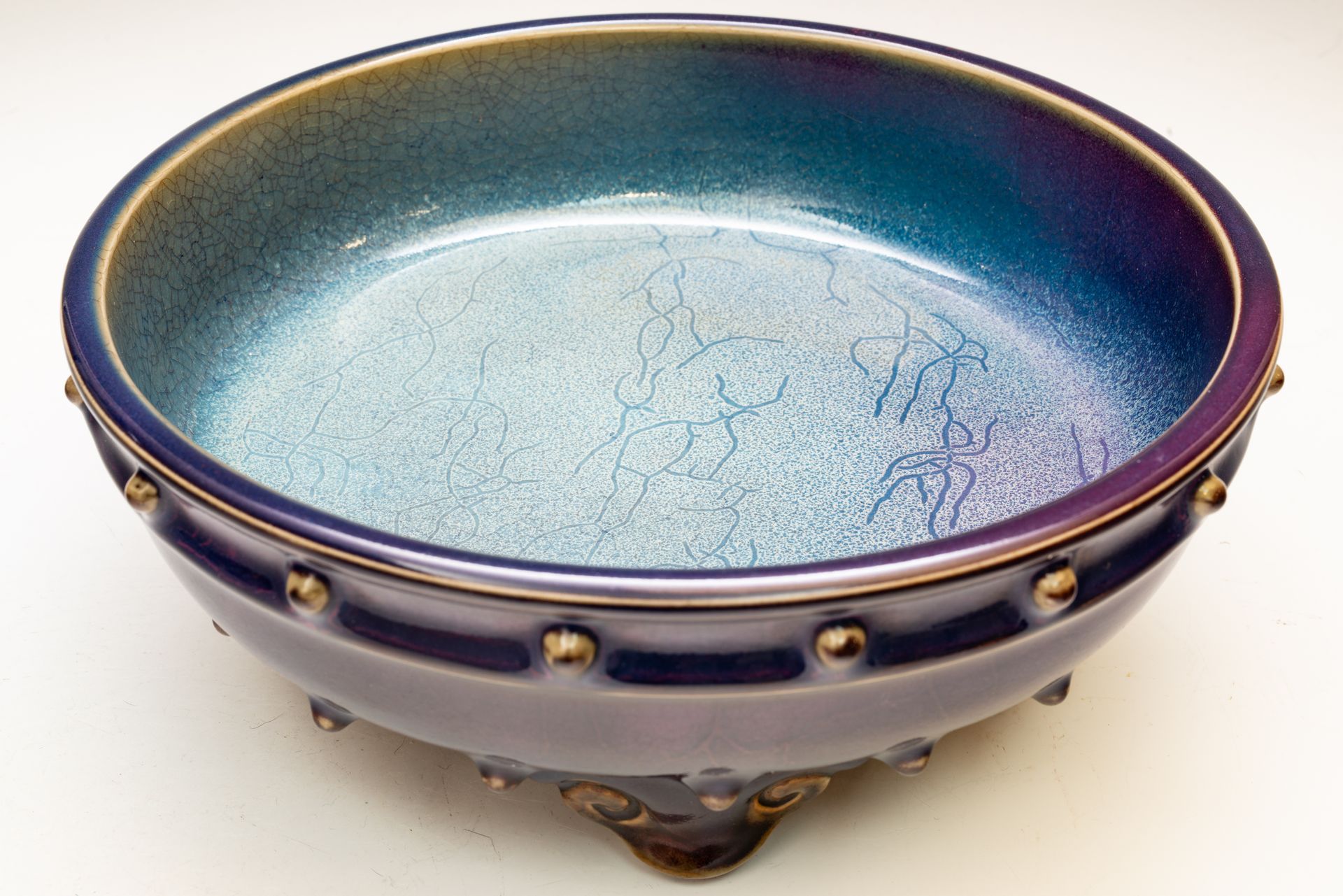 هذا الوعاء الرائع من زهر النرجس، من سلالة سونغ الجنوبية، مصنوع في فرن جون، يتميز بثلاثة أرجل ومزين بصفين من المسامير. يتميز سطحه الخارجي بلون أرجواني مزرق غني، بينما يتميز الجزء الداخلي بلمسة نهائية زرقاء فاتحة رقيقة، تكملها مجموعة واسعة من آثار الديدان في جميع أنحاء الوعاء. القاعدة منقوشة بعلامتين مميزتين. يبلغ قطر الوعاء حوالي 9 3/4 بوصة. بي بي جي آر إس