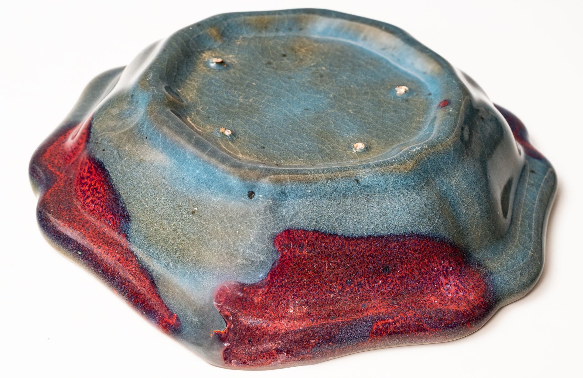 تتميز هذه القطعة الفنية الرائعة، التي تعود إلى أوائل عهد أسرة مينغ، بشكلها المثمن على طراز جون، بطلاء أزرق مائل للأرجواني، مع منطقة حمراء أسفل الحافة من الخارج. أما الجزء الداخلي، فيتميز بلون أزرق فاتح رقيق، بينما طُبّق طلاء بني داكن على السطح الداخلي حيث يخفّ الطلاء، بما في ذلك الحافة والحواف البنية الداكنة. ومن اللافت للنظر ظهور آثار ديدان على السطح الداخلي. القاعدة منقوشة بثلاث علامات مميزة. يبلغ قطر هذه الإناء 9 1/8 بوصة. ppjrs