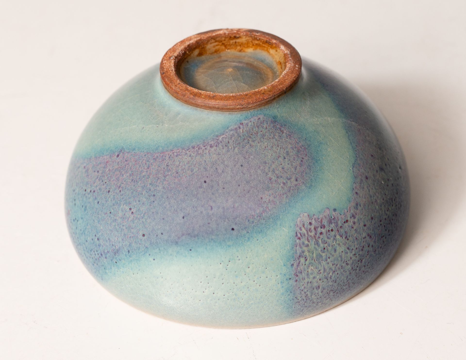 هذا الوعاء من سلالة يوان، ذو اللون الأزرق الباهت، يتميز ببقع أرجوانية ومسحة خضراء على حافته الداخلية والخارجية. بالإضافة إلى ذلك، هناك لمسة خفيفة من اللون الأرجواني تُبرز حافة الوعاء. يبلغ قطر الوعاء 3 3/16 بوصة. ppjrs