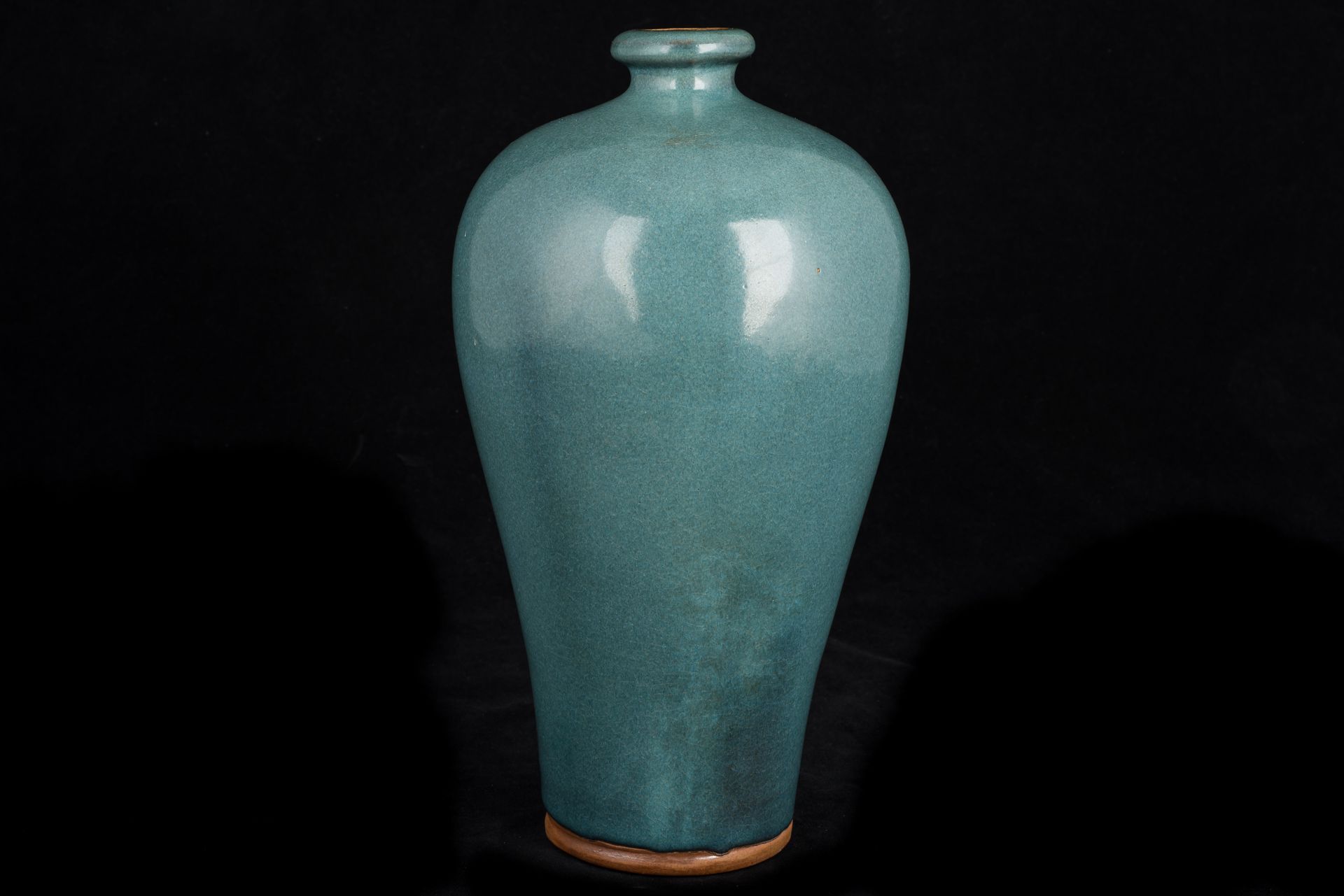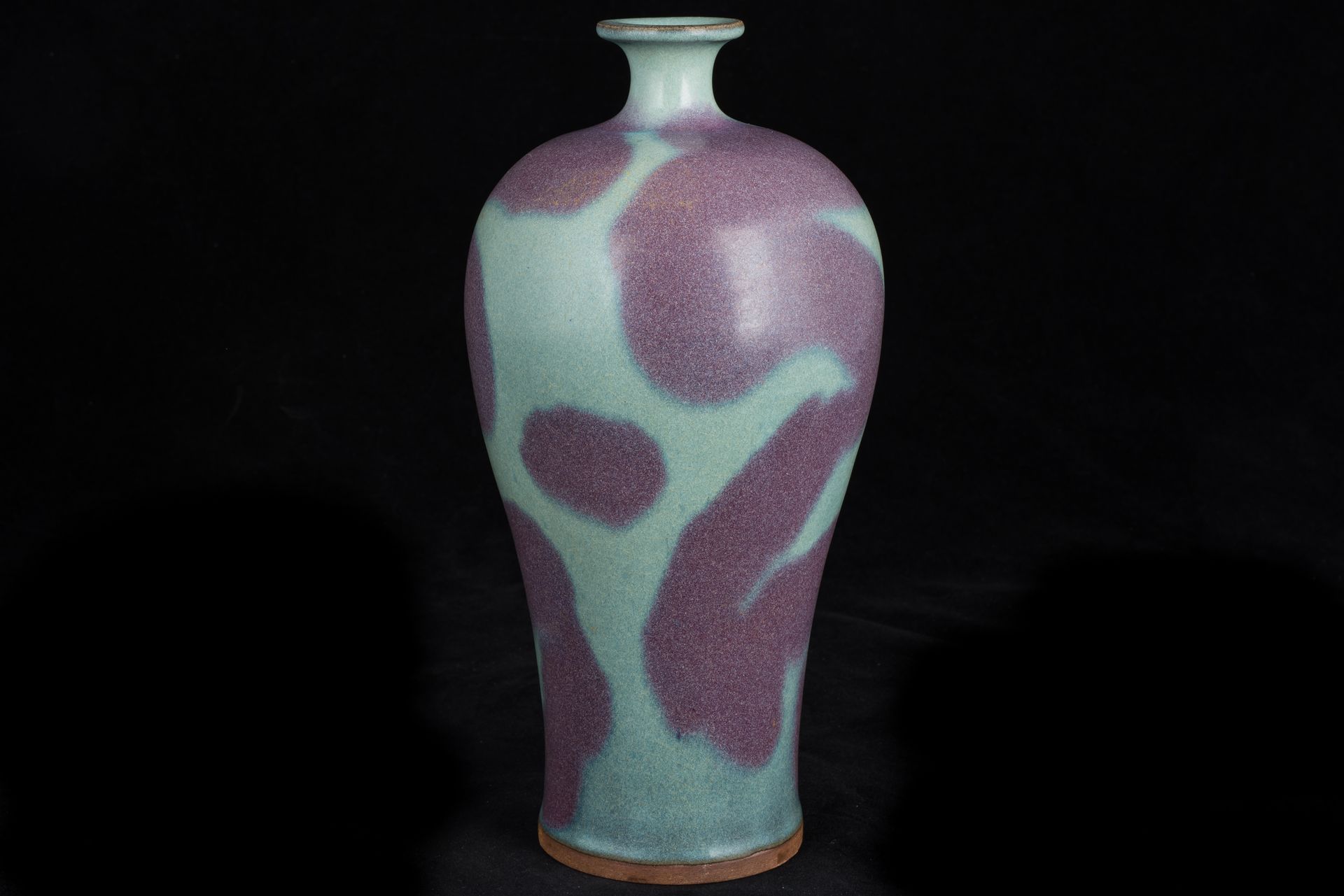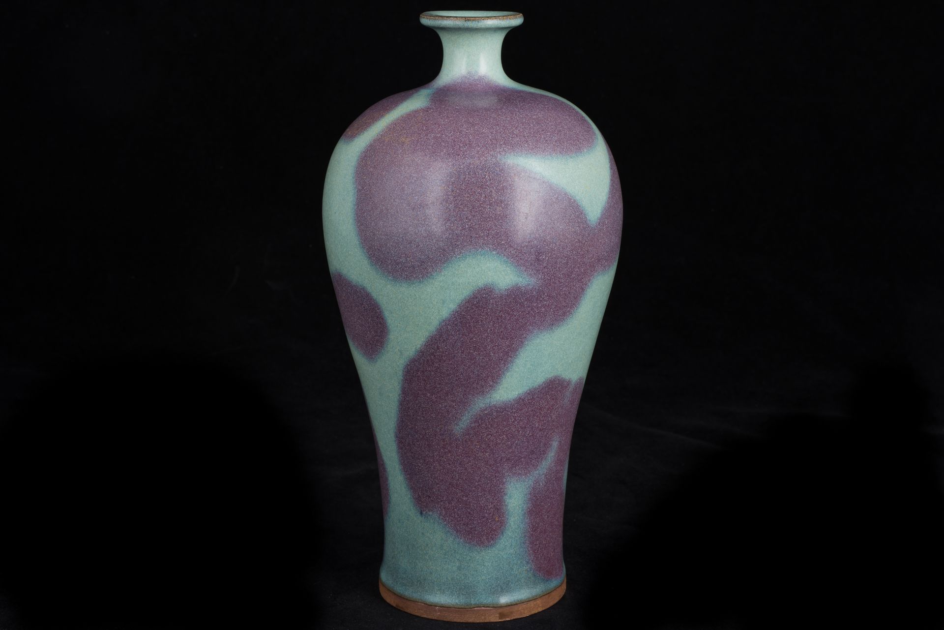 مزهرية مي بينغ من فرن جون، من عهد أسرة سونغ الشمالية، تتميز بطلائها الأزرق الرائع بلون بيضة روبن، مع تأثيرات طقطقة دقيقة وبقع أرجوانية كثيفة. يبلغ ارتفاع المزهرية حوالي