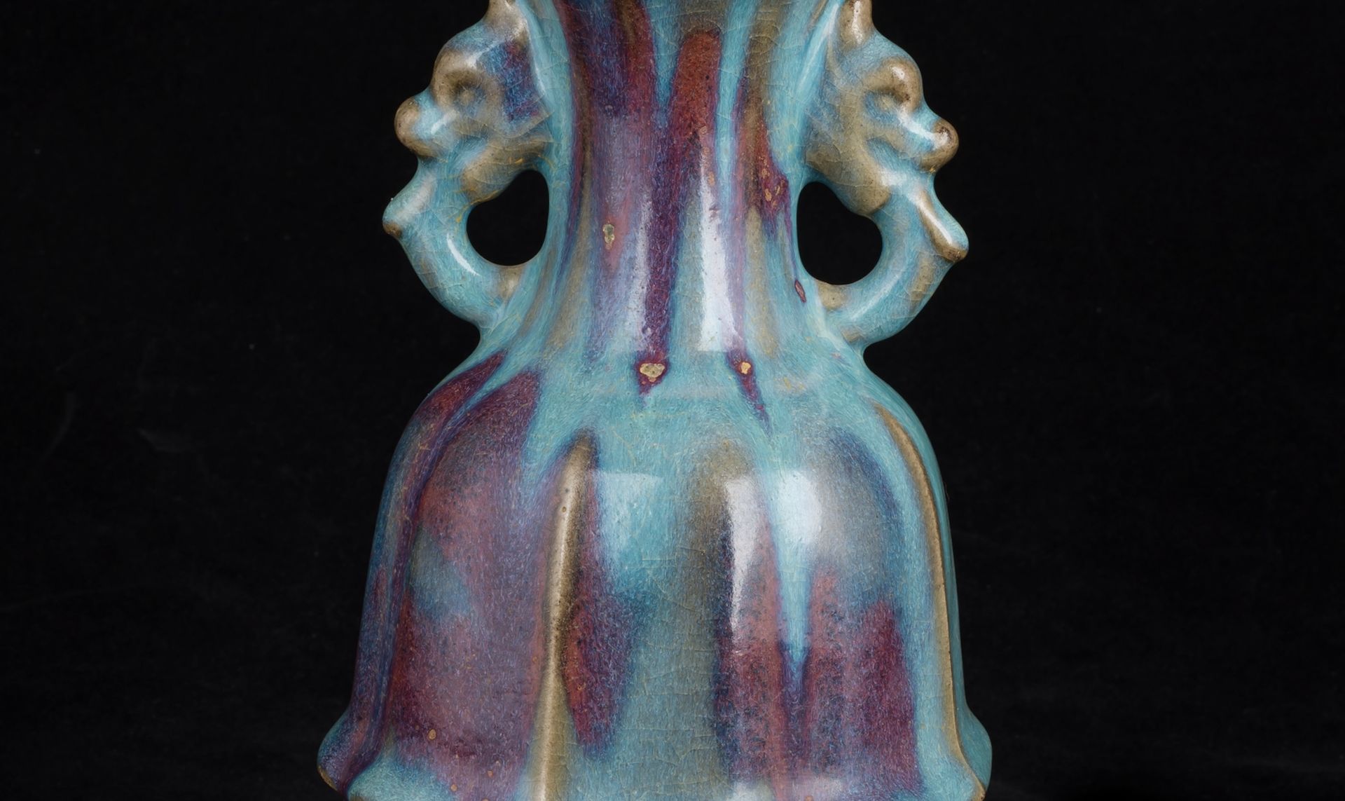مزهرية من فرن جي من عهد أسرة سونغ/يوان الجنوبية بمقابض حيوانات أسطورية: حافة أرجوانية ولمسات من الخيوط الذهبية