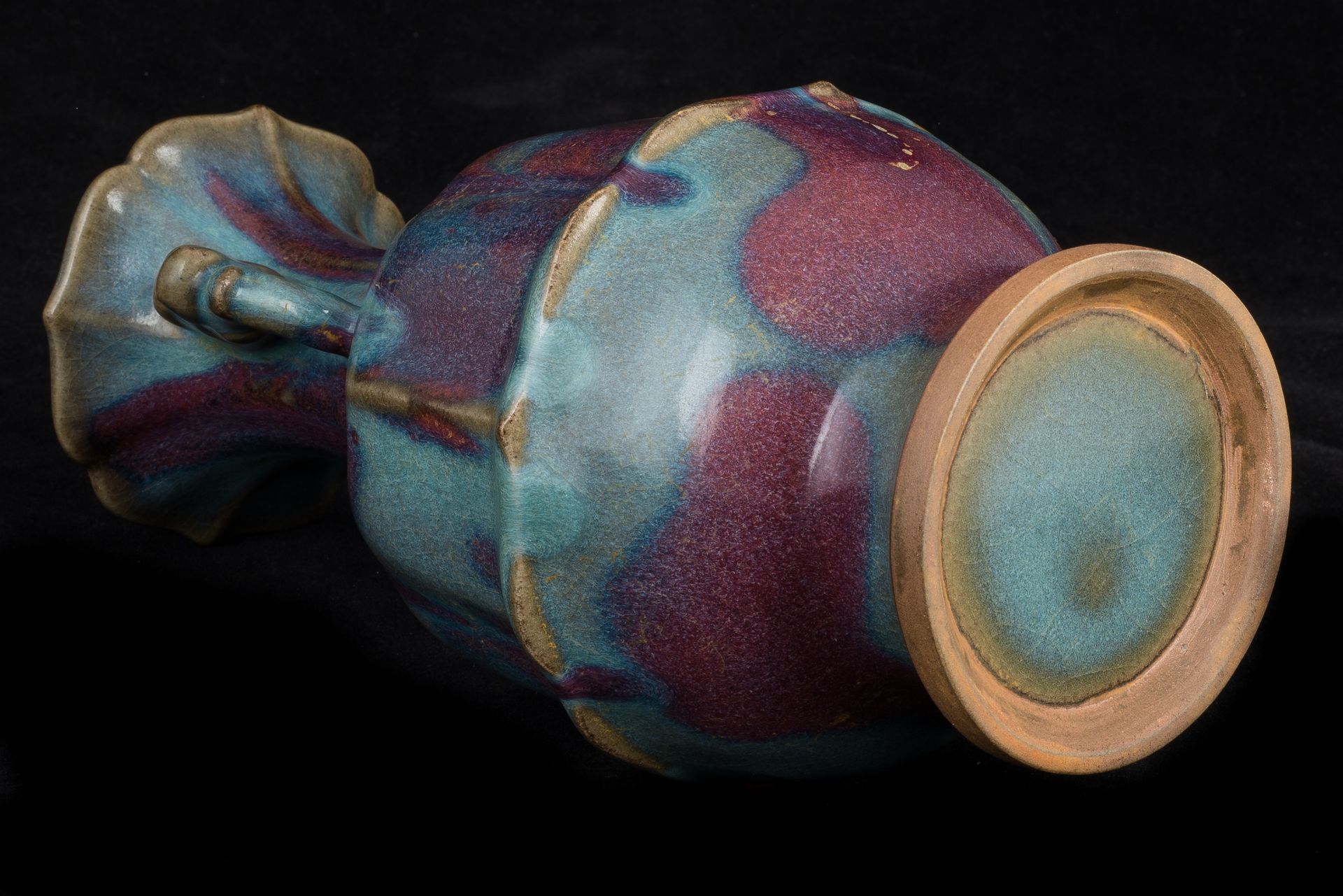 هذه المزهرية الرائعة من سلالة سونغ الشمالية، والمعروفة باسم خزف جون، تتميز بطلاء أزرق بيضاوي مميز، مع لمسة أرجوانية مميزة عند الرقبة. تتميز القطعة بنسيج متشقق رقيق على سطحها. يبلغ ارتفاعها حوالي 9.5 بوصة. ppjrs