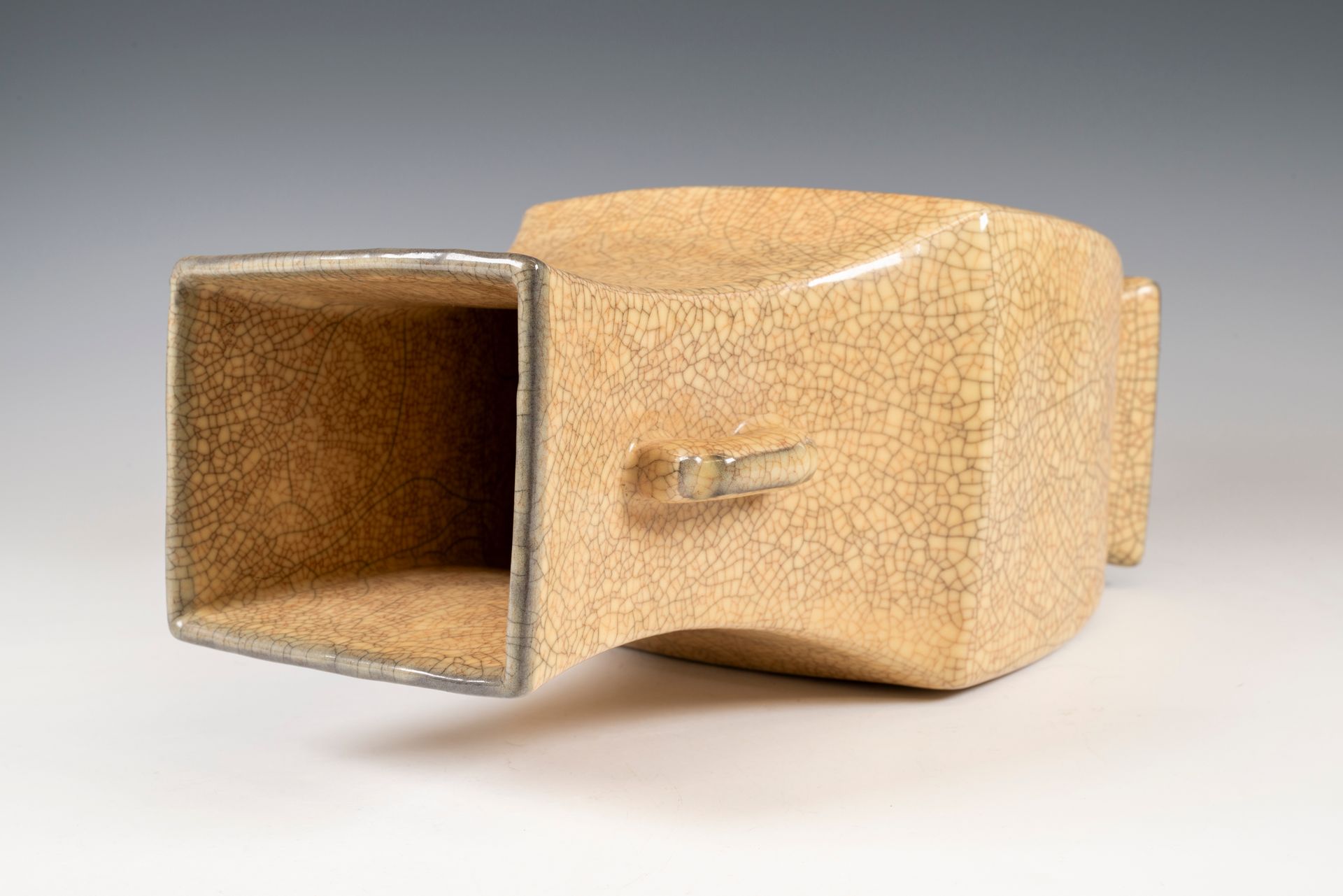 مزهرية هو مربعة الشكل من فرن جي، بمقابض أنبوبية، تعود إلى عهد أسرة سونغ الجنوبية/يوان. تُنسب هذه المزهرية المربعة الرائعة، بمقابض أنبوبية، إلى أوائل عهد أسرة سونغ الجنوبية. أظهرت تقنية الحرق المستخدمة خلال هذه الفترة نقصًا في الدقة، مما أدى إلى زيادة سمك طبقة التزجيج. يدل هذا على تطور عملية صناعة الخزف، التي لم تكن قد أُتقنت بالكامل بعد. تستند المزهرية على قاعدة حديدية، وتتميز بلون يُذكرنا بالقمح. لعب فرن جي، المعروف غالبًا بفرن الأخ الأكبر، دورًا هامًا في إنتاج الخزف خلال عهد أسرتي سونغ الجنوبية ويوان. يبلغ ارتفاع المزهرية حوالي 9 1/4 بوصة. ppjrs