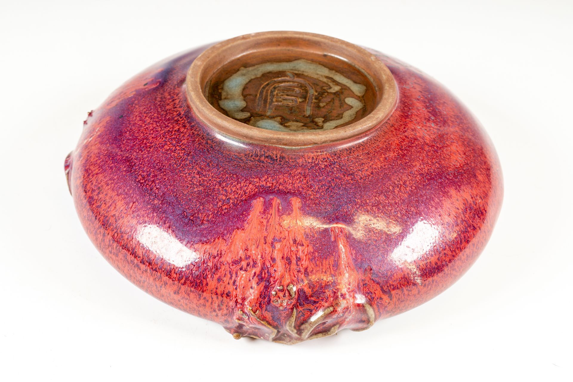إناء أثري نادر من فرن جون، من أوائل عهد أسرة مينغ، على شكل دينغ، مع نقش. يتميز هذا المبخرة بلونه الأحمر المزرق، وبطانة داخلية مطلية باللون الأزرق الفاتح، وتظهر عليها علامات قدم، مثل آثار الديدان، ونقش على قاعدتها. يبلغ ارتفاع الإناء حوالي 20 سم. بي بي جي آر إس