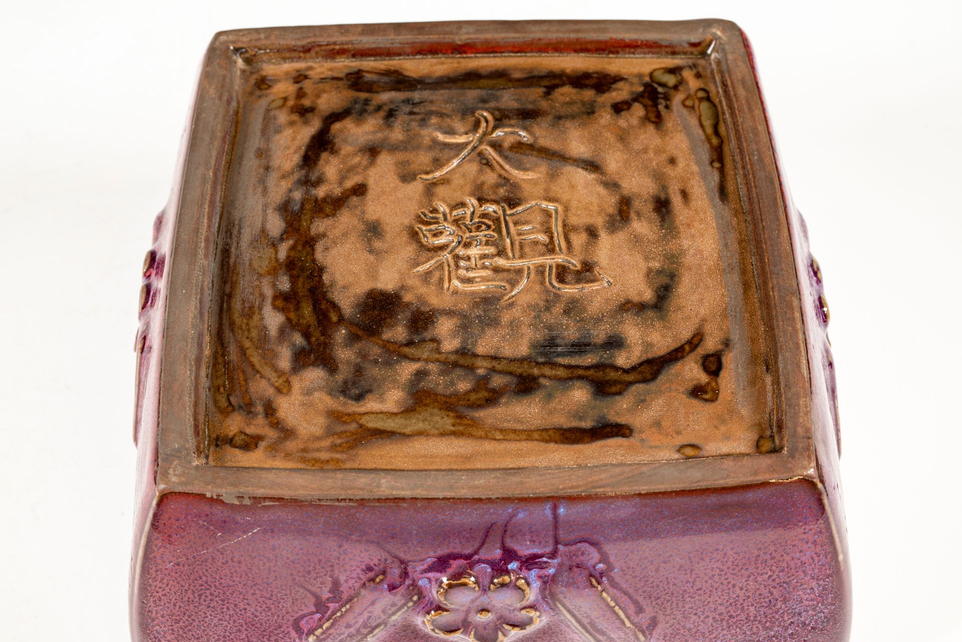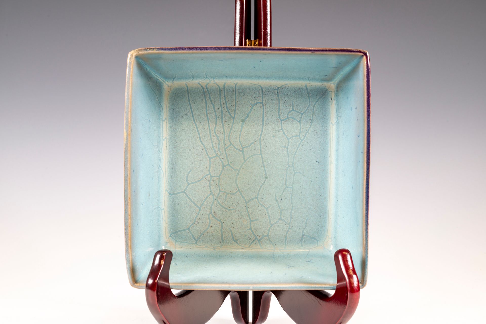 هذه الفرشاة المربعة من خزف جون، التي تعود إلى عهد أسرة سونغ، تتميز بطبقة بنية مميزة. خارجيًا، يمتاز بلون أرجواني، بينما يتألق الجزء الداخلي بلون أزرق بيضاوي جذاب، يكمله تشقق خفيف وخفيف، وعلامات آثار ديدان على القاعدة. يبلغ قطر القطعة حوالي 16 5/8 بوصة.