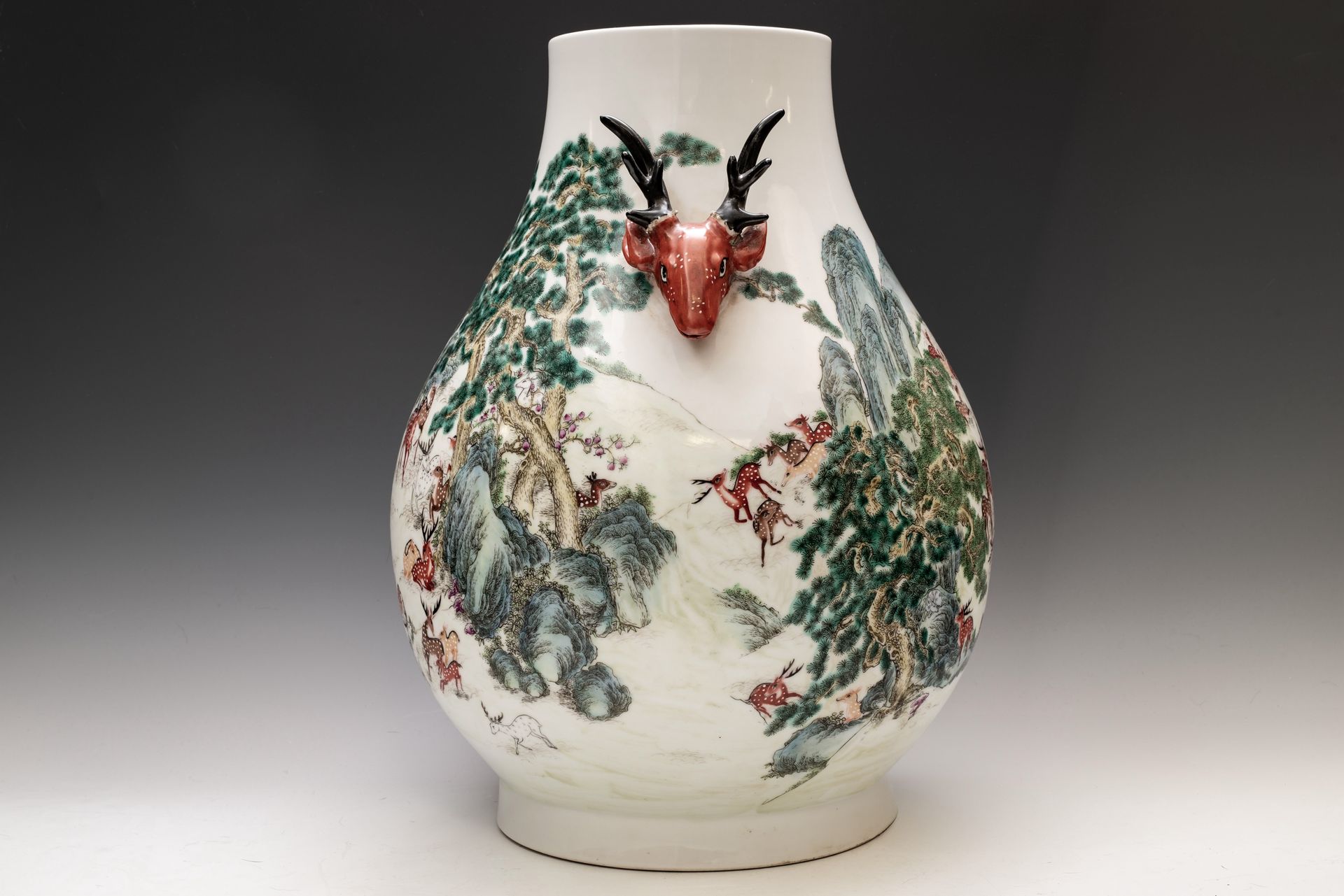 مزهرية استثنائية من عائلة روز تحمل صورة مائة غزال من عهد أسرة تشينغ، تتميز بختم تشيان لونغ وعلامته وفترة حكمه