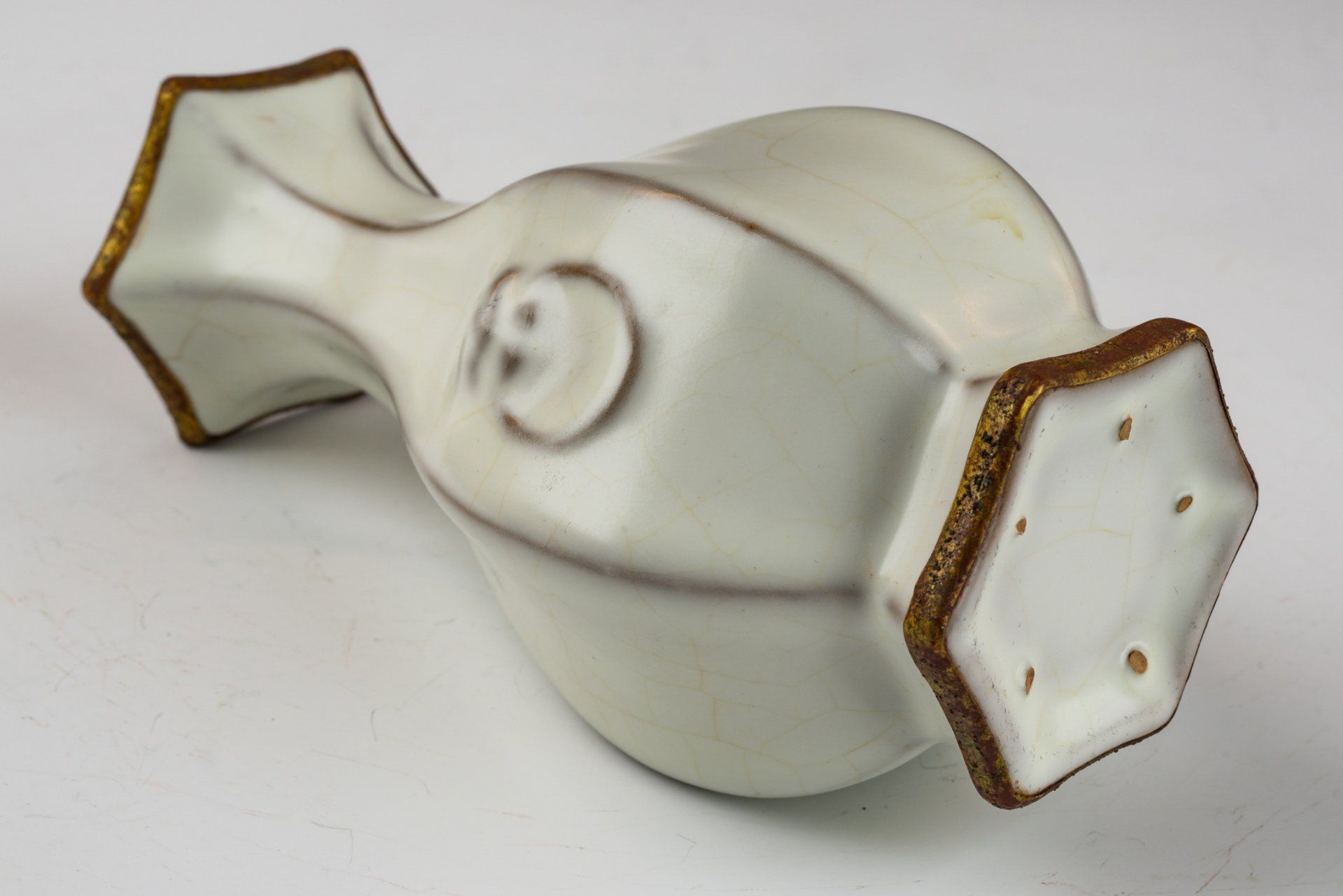 تُجسّد هذه المزهرية التذكارية الرائعة السمات المميزة لفناني رو، حيث تتميز بشكلها السداسي المصنوع بدقة وطبقة طلاء بيضاء نقية بلون ضوء القمر. والجدير بالذكر أن تركيبة الطلاء خالية من العقيق، مما يضمن أصالتها والتزامها بتقنيات الإنتاج التقليدية. يُزيّن الجزء العلوي والسفلي من المزهرية شريطان نحاسيان مطليان بالذهب الناري، وهي سمة مميزة تُحفظ للأواني التذكارية المُقدمة للإمبراطور وبلاطه. تُظهر هذه الأشرطة بعض علامات التنظيف، كاشفةً عن تآكل طبقي يدل على وجود الكوبريت المحمر والملاكيت الأخضر، مما يُضيف إلى الأهمية التاريخية للقطعة. وقد أكد التحليل المجهري المُصاحب عدم وجود العقيق داخل الطلاء، كما أن التآكل المرئي على الأشرطة النحاسية المذهبة يُعزز عمر المزهرية. تُعتبر هذه الأدلة أكثر موثوقية من اختبار التألق الحراري، ويستخدمها الخبراء على نطاق واسع لتحديد أصالة القطع الأثرية، مما يجعل تقليدها أمرًا غير ممكن. تتميز المزهرية أيضًا بمقابض حلقية وخمسة نتوءات صغيرة، تُشبه بذور السمسم في الشكل والحجم. يبلغ ارتفاع هذه القطعة الرائعة حوالي 16.5 سم، وهي من مجموعة أواني رو الباقية، المنسوبة إلى الإمبراطور هويزونغ من سلالة سونغ الشمالية. بي بي جي آر إس