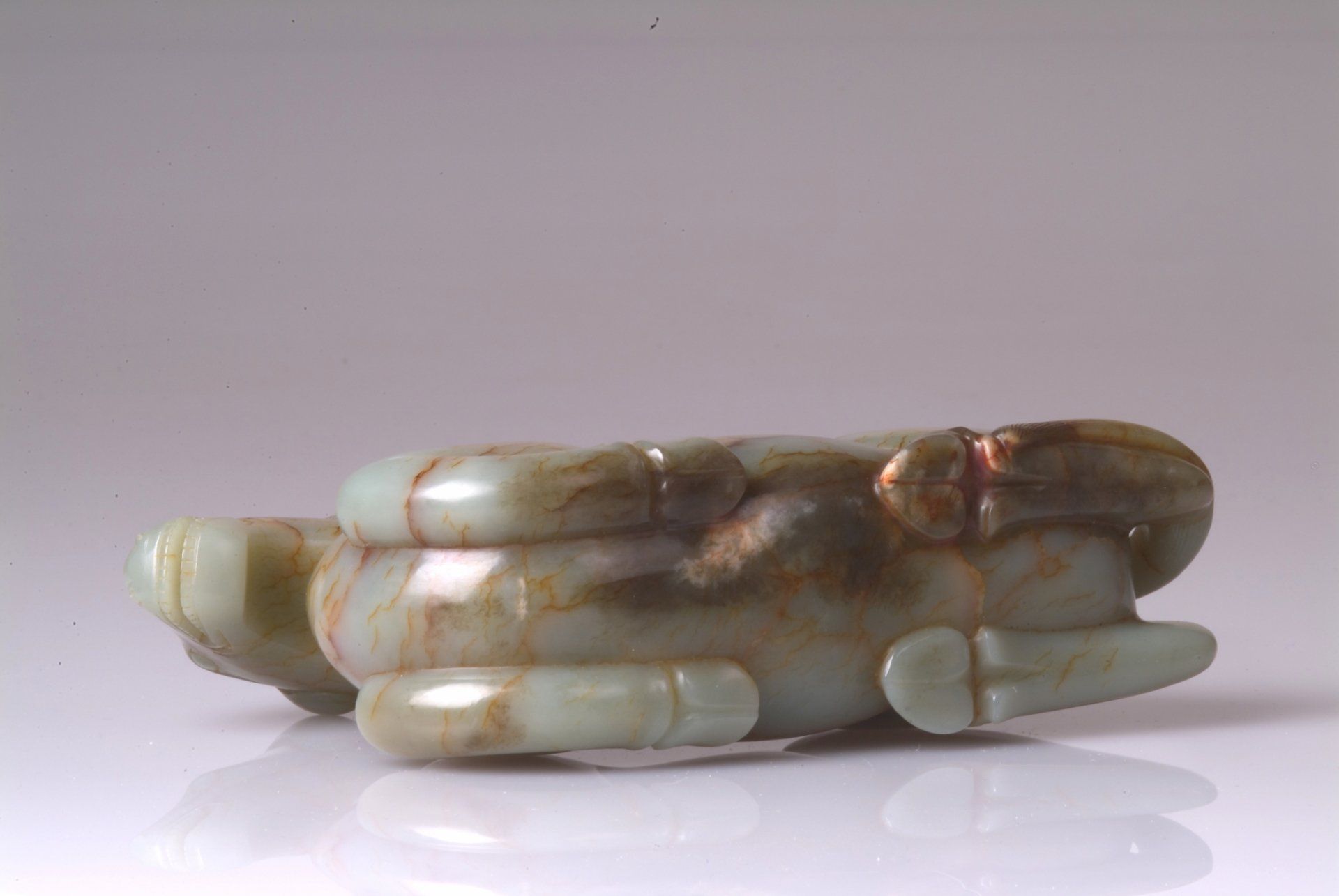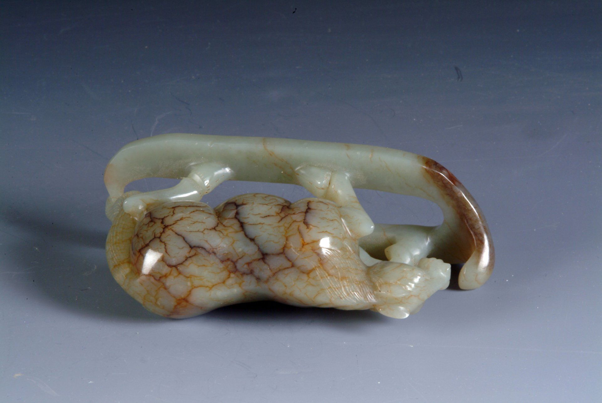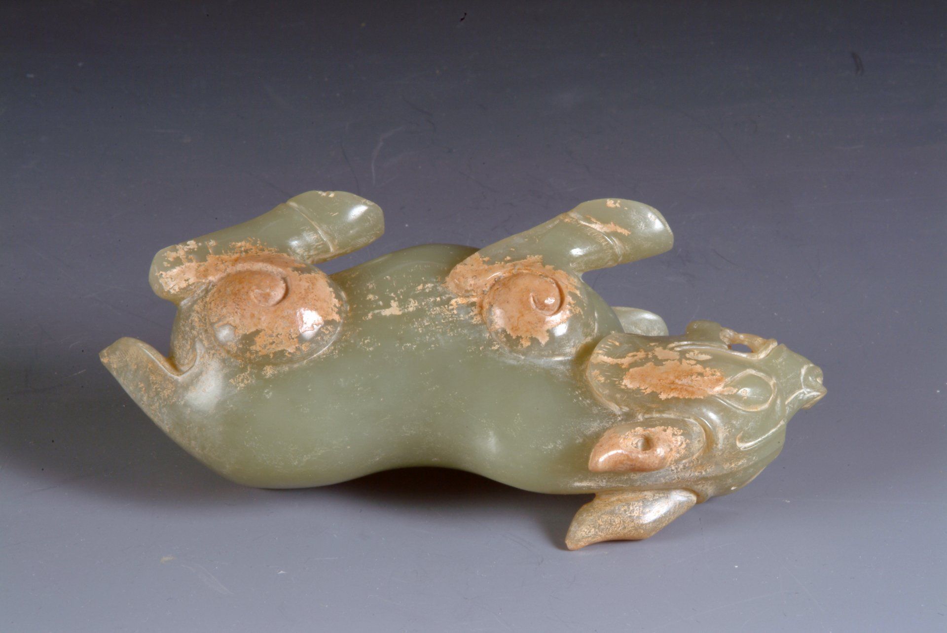 هذا التمثال المصنوع بدقة من اليشم الرمادي المخضر، من ست سلالات، يتميز بتصميم حيوان أسطوري ملتوي، يتميز بمناطق بارزة من الشوائب البنية والحمراء. يؤكد أسلوب النحت الدقيق على أصله التاريخي. يبلغ طول التمثال حوالي 4.5 بوصة.
