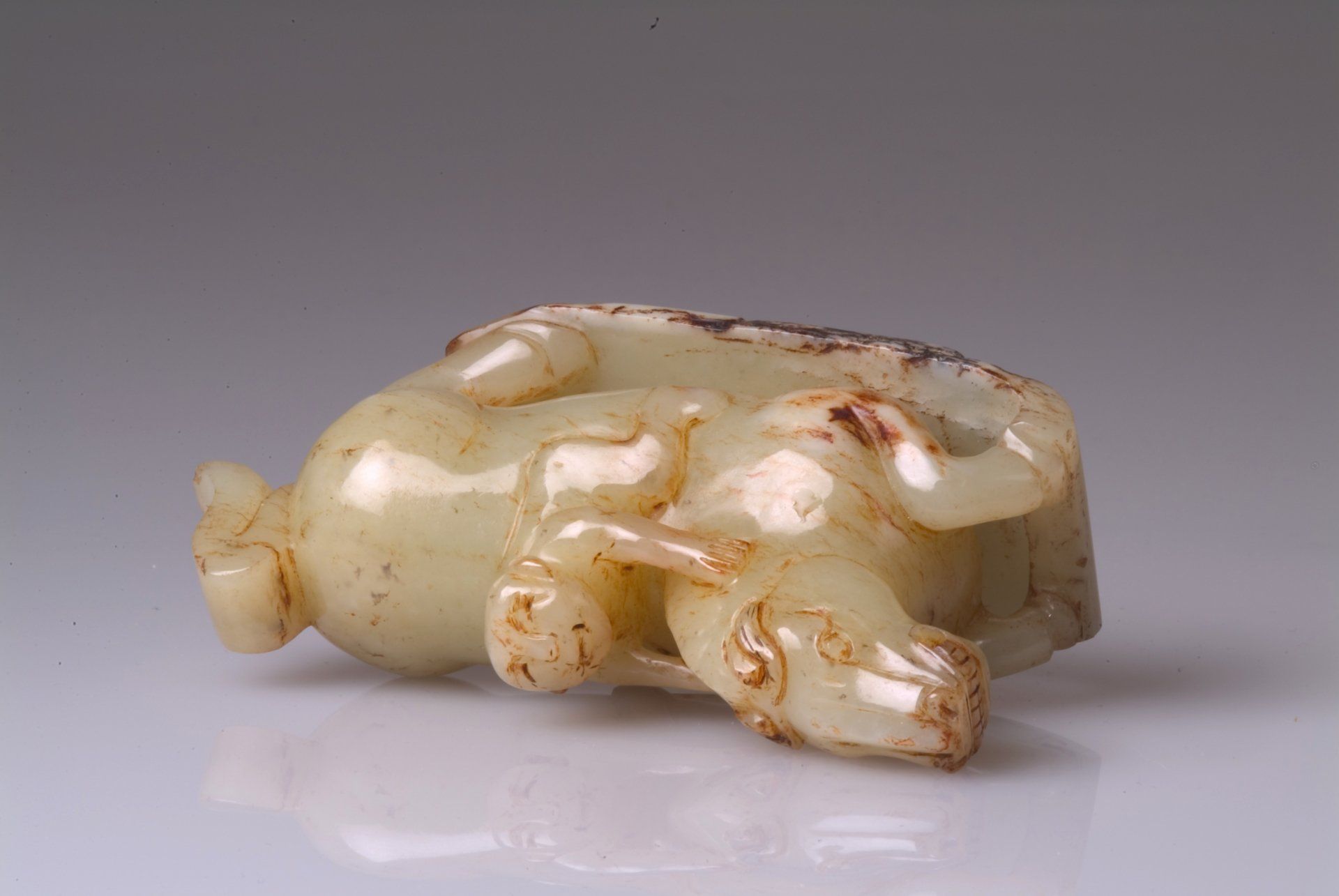 تمثال حصان راقد مصنوع بإتقان، يعود تاريخه إلى عصر الأسرات الست، منحوت بدقة من اليشم الأبيض المائل للرمادي. يتميز بمناطق واسعة من اللون البني المتغير والغامض، مما يؤكد أهمية التمثال التاريخية وعمره. يبلغ طول التمثال حوالي 12.7 سم.