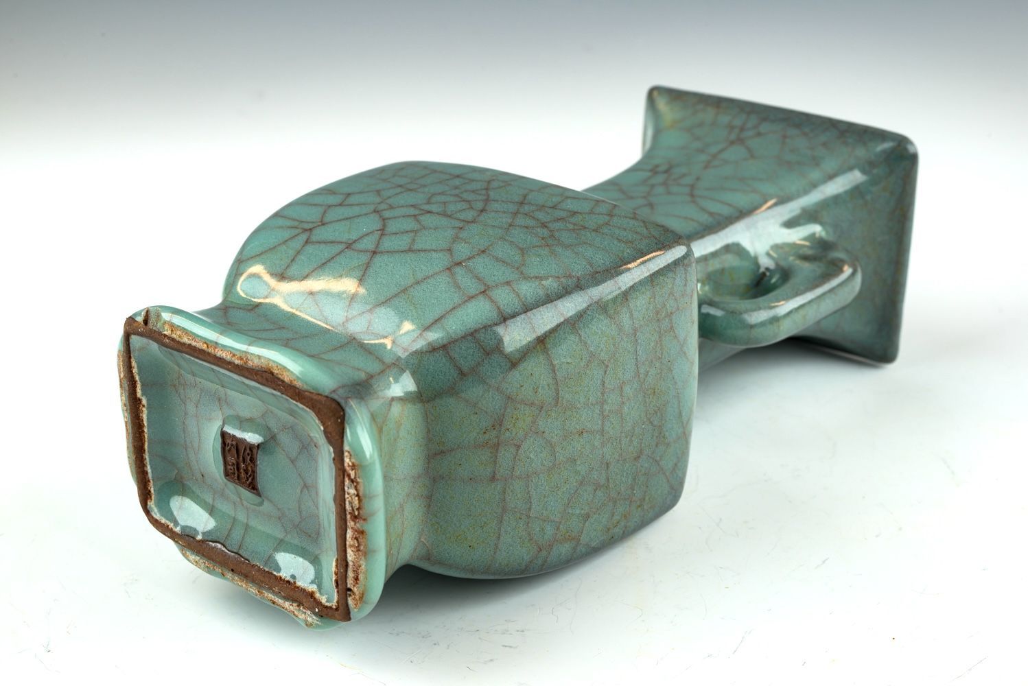 Diese bemerkenswerte sechseckige Vase aus der Zeit der Südlichen Song-Dynastie ist ein Paradebeispiel für die Kunstfertigkeit der Guan-Keramik, die im offiziellen Xiuneisi-Brennofen mit kaiserlicher Marke gefertigt wurde. Das Gefäß besticht durch ein filigranes Design, das durch elegant proportionierte Tigerhenkel zusätzlich betont wird. Charakteristisch sind mehrere Schichten einer dicken, bläulichen Glasur mit subtilen Grüntönen, die auf einen dünnen Scherben aufgetragen wurden und am Boden in einer markanten Glasuransammlung enden. Die Vase präsentiert eine atemberaubende, bläuliche, krakelierte, durchscheinende Glasur und trägt die offizielle Guan-Marke auf der Unterseite. Zudem weist sie einen eisernen Fuß auf, der durch den Brennvorgang entstanden ist, und zeigt einen dunklen ockerbraunen Farbton, der auf den verwendeten braunen Ton zurückzuführen ist. Die Bezeichnung „Xiu Nei Si“ bezieht sich vermutlich auf die Abteilung, die für die Versorgung des Palastes zuständig war. Nach dem Einfall der Jin-Armeen, die den Kaiserhof der Nördlichen Song-Dynastie vertrieb, zog sich dieser 1127 n. Chr. nach Hangzhou im Süden zurück und begründete schließlich die Südliche Song-Dynastie. Dieses exquisite Stück ist ca. 23,5 cm hoch. ppjrs