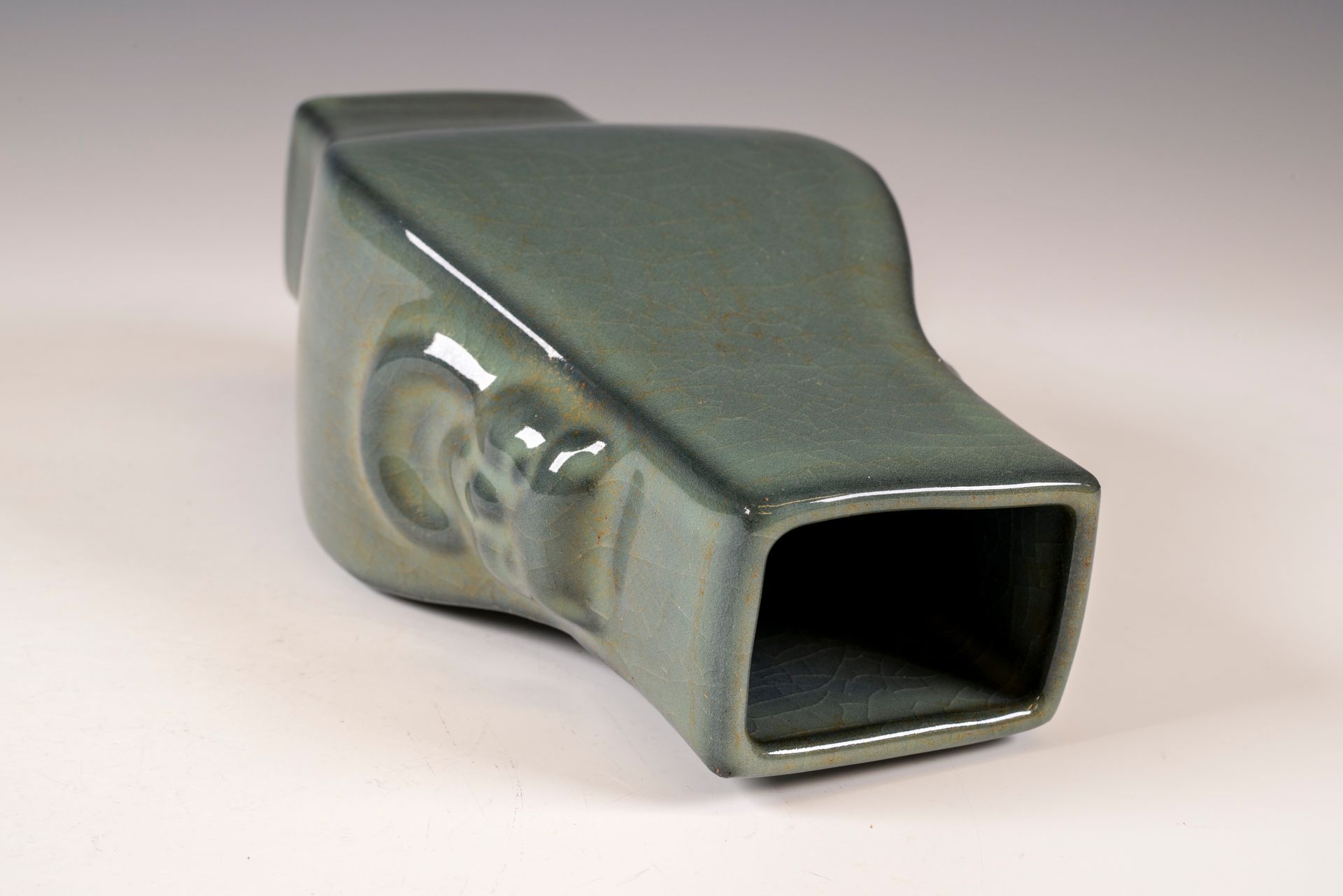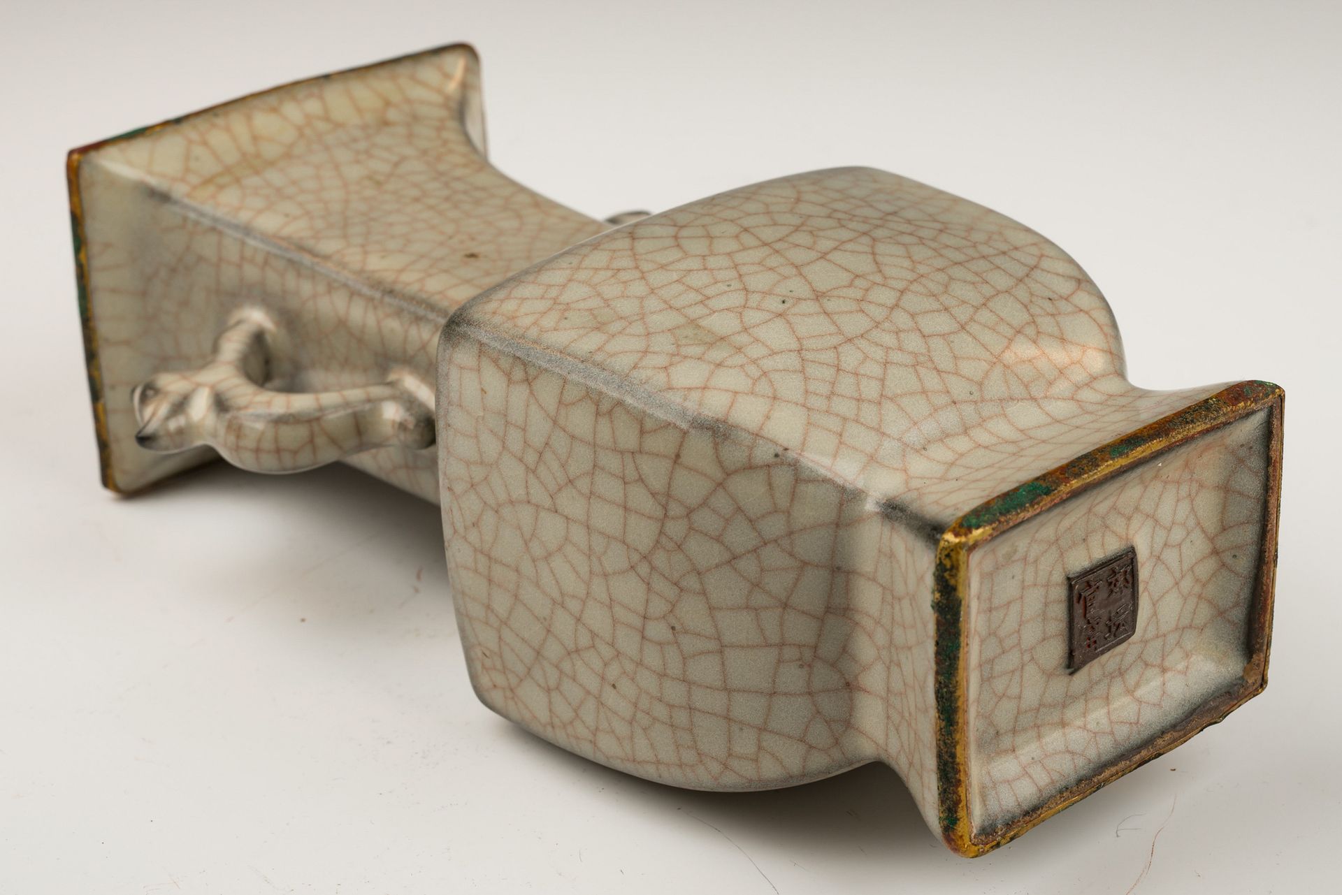 Dieses außergewöhnliche Artefakt ist eine Vase aus der Zeit der Südlichen Song-Dynastie. Sie zeichnet sich durch ihre Tigerhenkel aus und wurde im angesehenen Guan-Ofen Xiuneisi unter der Schirmherrschaft der kaiserlichen Guan-Marke gefertigt. Die Vase besticht durch mehrere Schichten aufwendiger, grünlicher Glasur auf einem fein gearbeiteten Korpus. Die elegant geschwungene, rechteckige Vase weist eine dezente Craquelé-Glasur auf, die ihre ästhetische Wirkung unterstreicht, und trägt prominent die offizielle Guan-Marke am Boden. Zusätzlich ruht das Stück auf einem robusten Eisenfuß, der den charakteristischen dunkelbraunen Farbton des verwendeten Tons zeigt. Nach der Vertreibung des Kaiserhofs durch die Jin-Armeen aus der Nördlichen Song-Dynastie im Jahr 1127 n. Chr. verlegte der Hof seinen Sitz nach Hangzhou im Süden, was die Gründung der Südlichen Song-Dynastie markierte. Die Vase ist ca. 22,5 cm hoch.