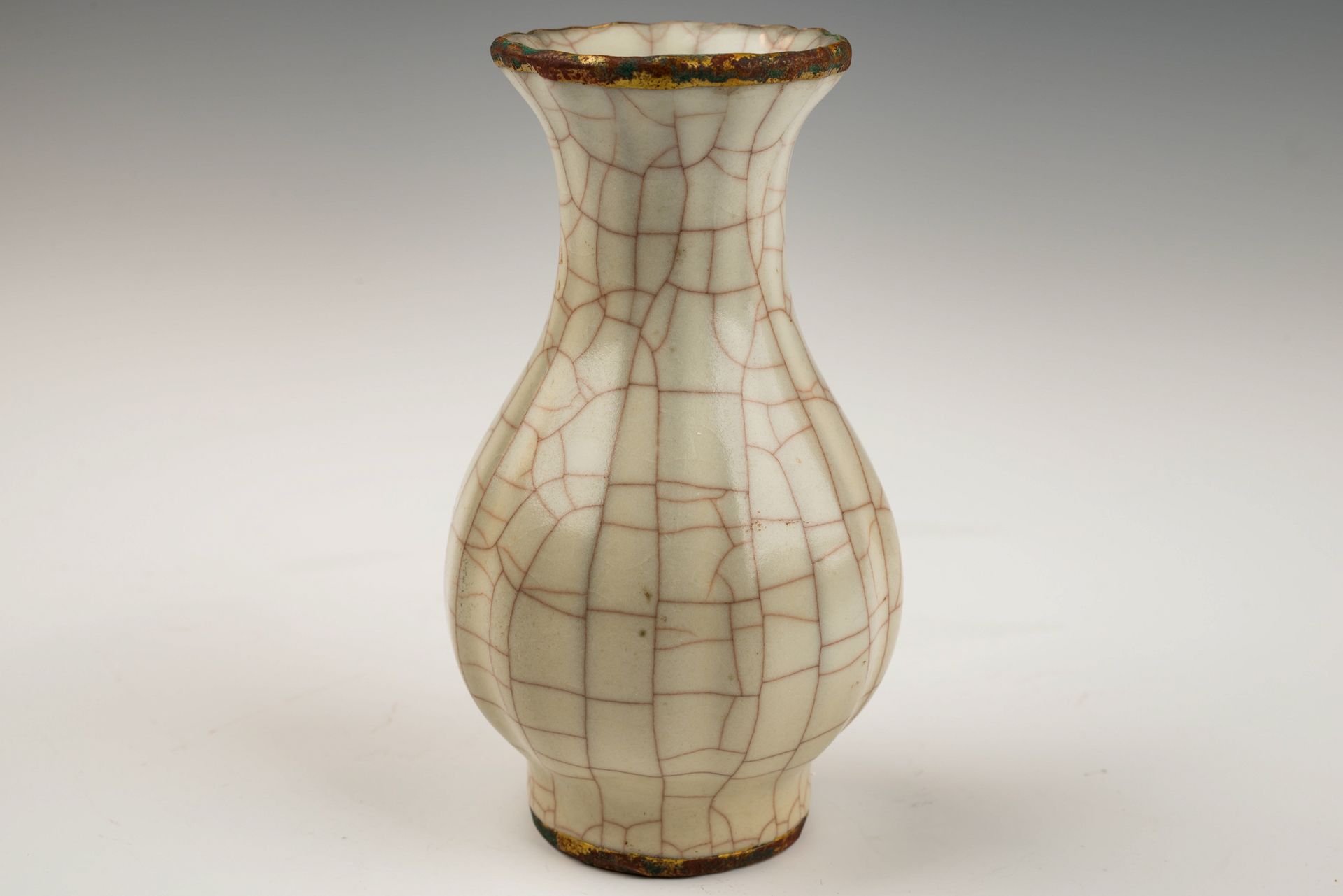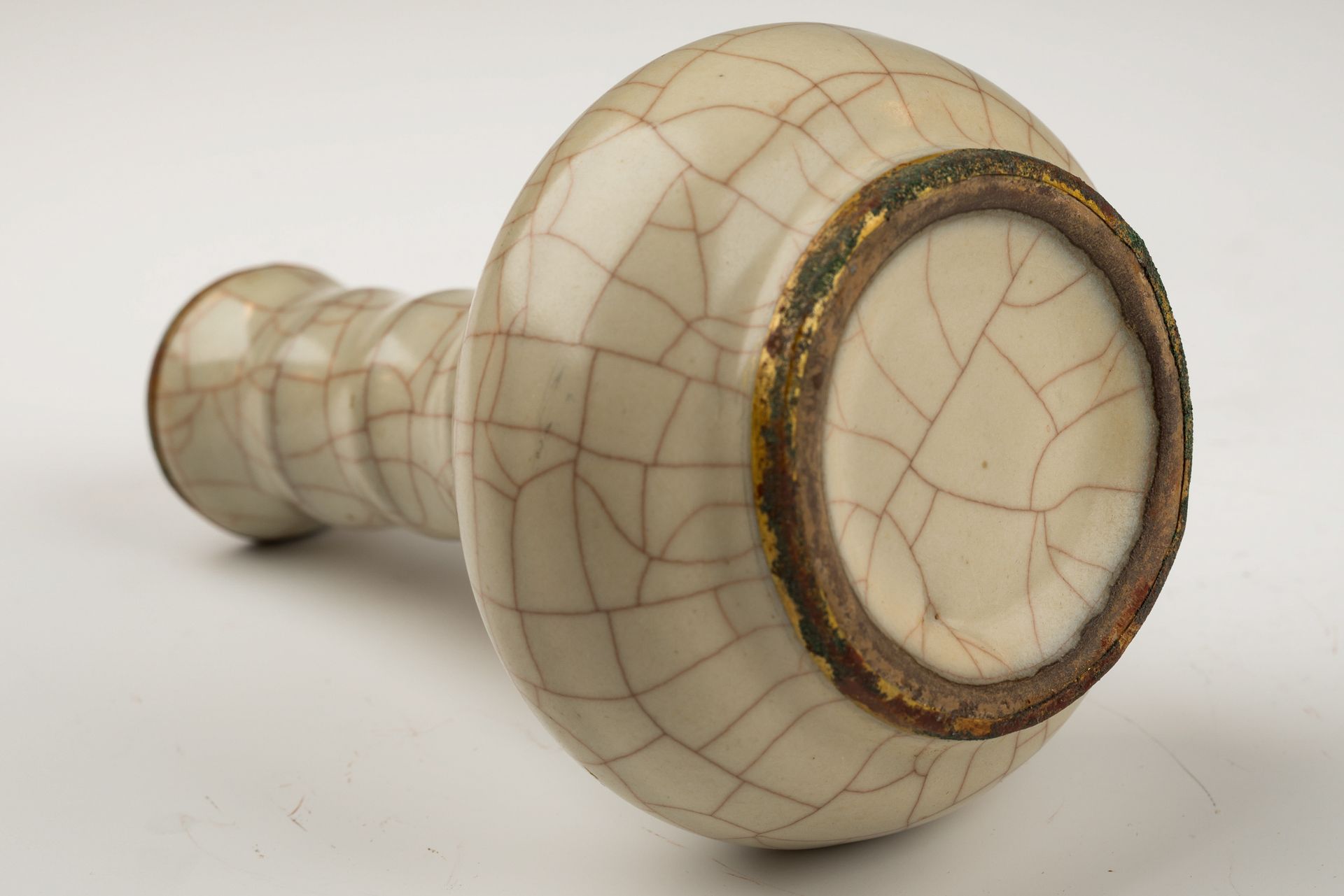 Die während der Kaiserzeit in der Song-Dynastie gefertigte Guan Yao-Vase ist eine herausragende Flaschenvase aus Guan-Ware mit Bambushals. Die beige glasierte Vase mit Craquelé-Effekt weist feuervergoldete Bänder am Rand und Boden auf, die mit geschichtetem, rötlichem Cuprit und grünlicher, traubenförmiger Malachitkorrosion verziert sind. Dieses Phänomen ist in die Poren der feuervergoldeten Kupferbänder eingedrungen und liefert überzeugende Beweise für das hohe Alter und die Authentizität der Vase. Dieses Merkmal ist ein zuverlässigerer Herkunftsnachweis als eine Thermolumineszenzprüfung (TL), wie Experten bestätigen, die diese Methode zur Echtheitsprüfung von nicht reproduzierbaren Artefakten einsetzen. Die Vase besitzt zudem einen Eisenfuß mit einer dunkelbraunen Patina, die durch den Brennvorgang entstanden ist. Nach der Vertreibung des Kaiserhofs aus der Nördlichen Song-Dynastie durch die Jin-Armeen im Jahr 1127 n. Chr. verlegte der Kaiserhof seinen Sitz nach Hangzhou, was die Gründung der Südlichen Song-Dynastie markierte. Die Vase ist ca. 14,3 cm hoch. ppjrs