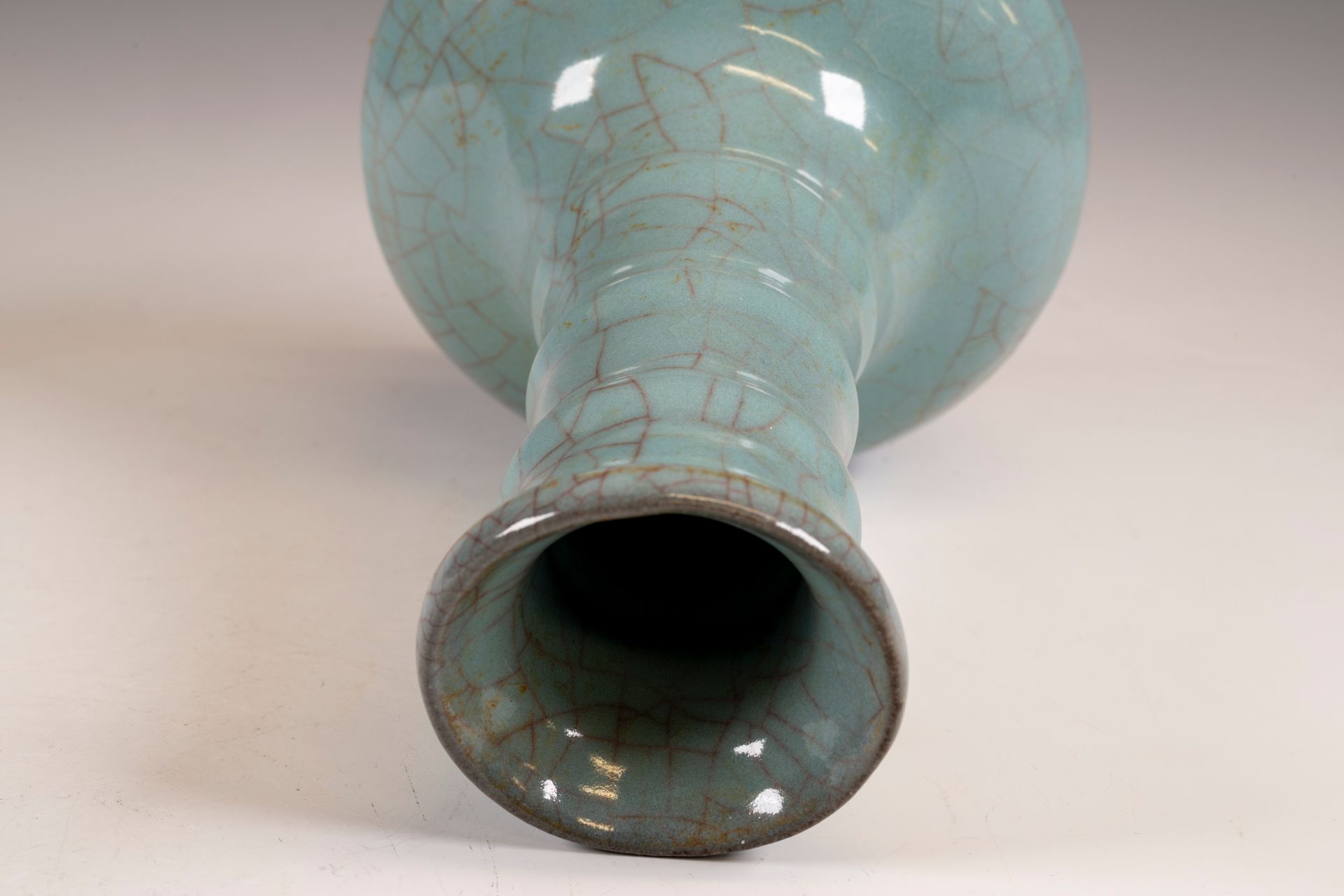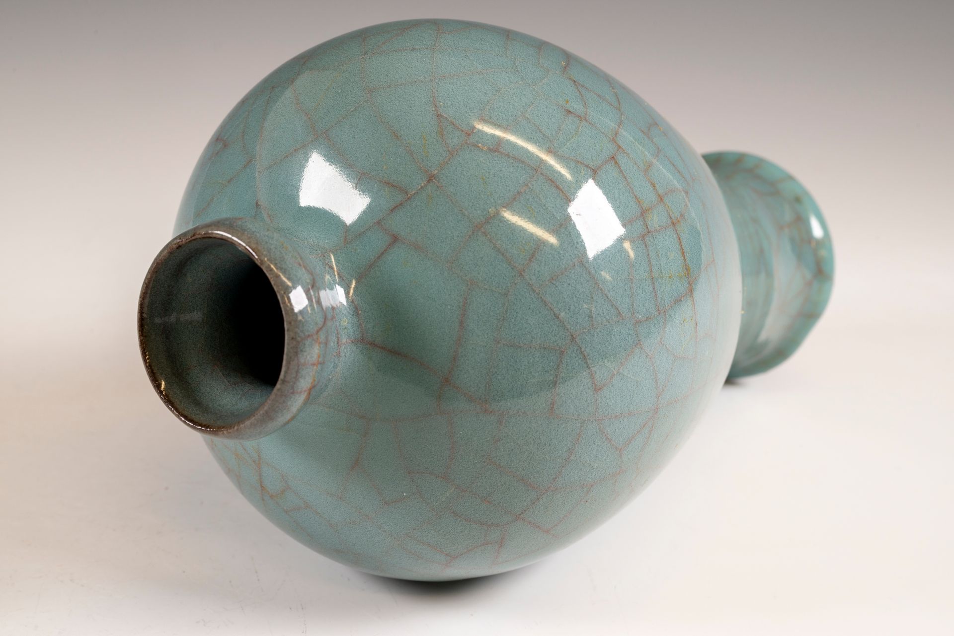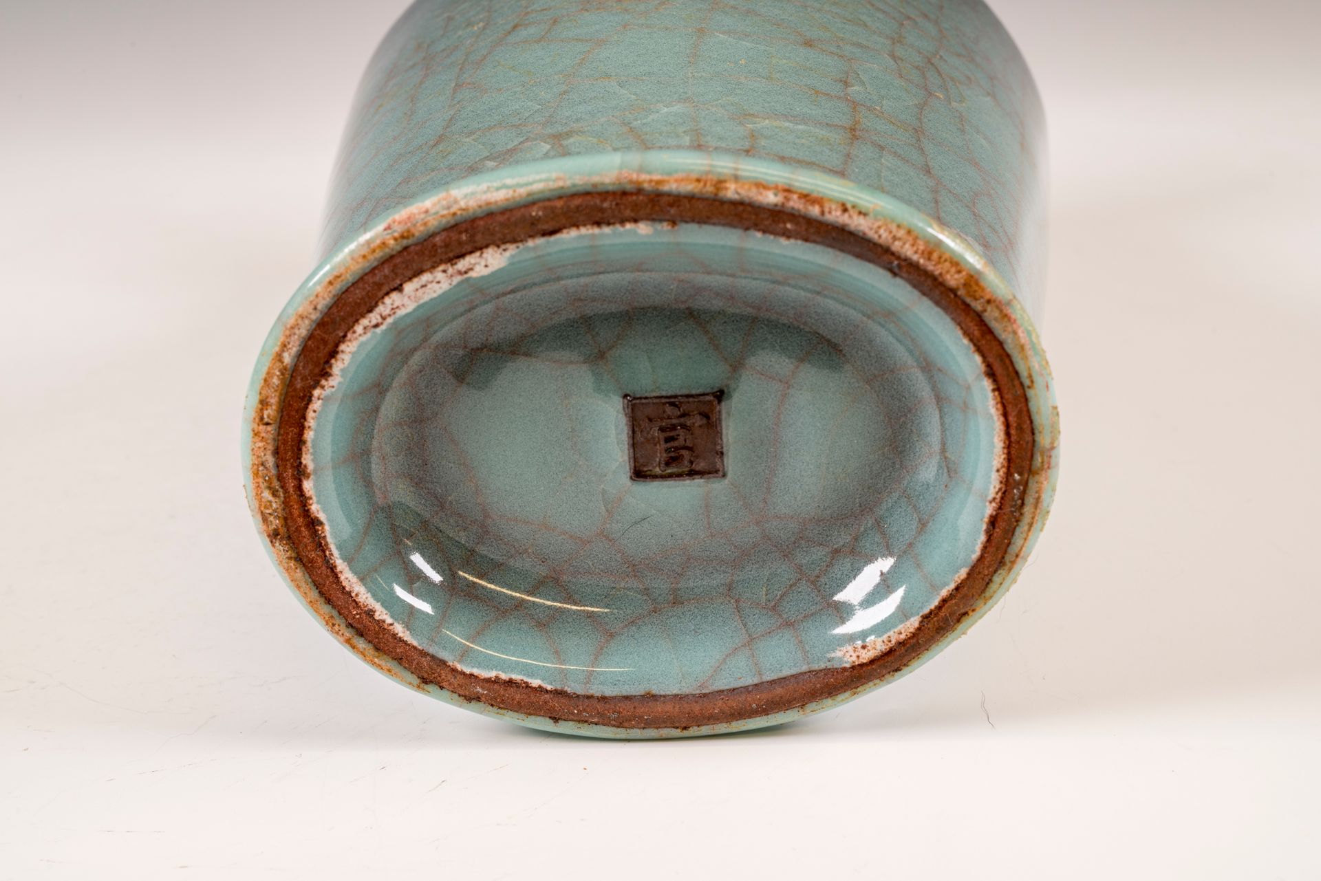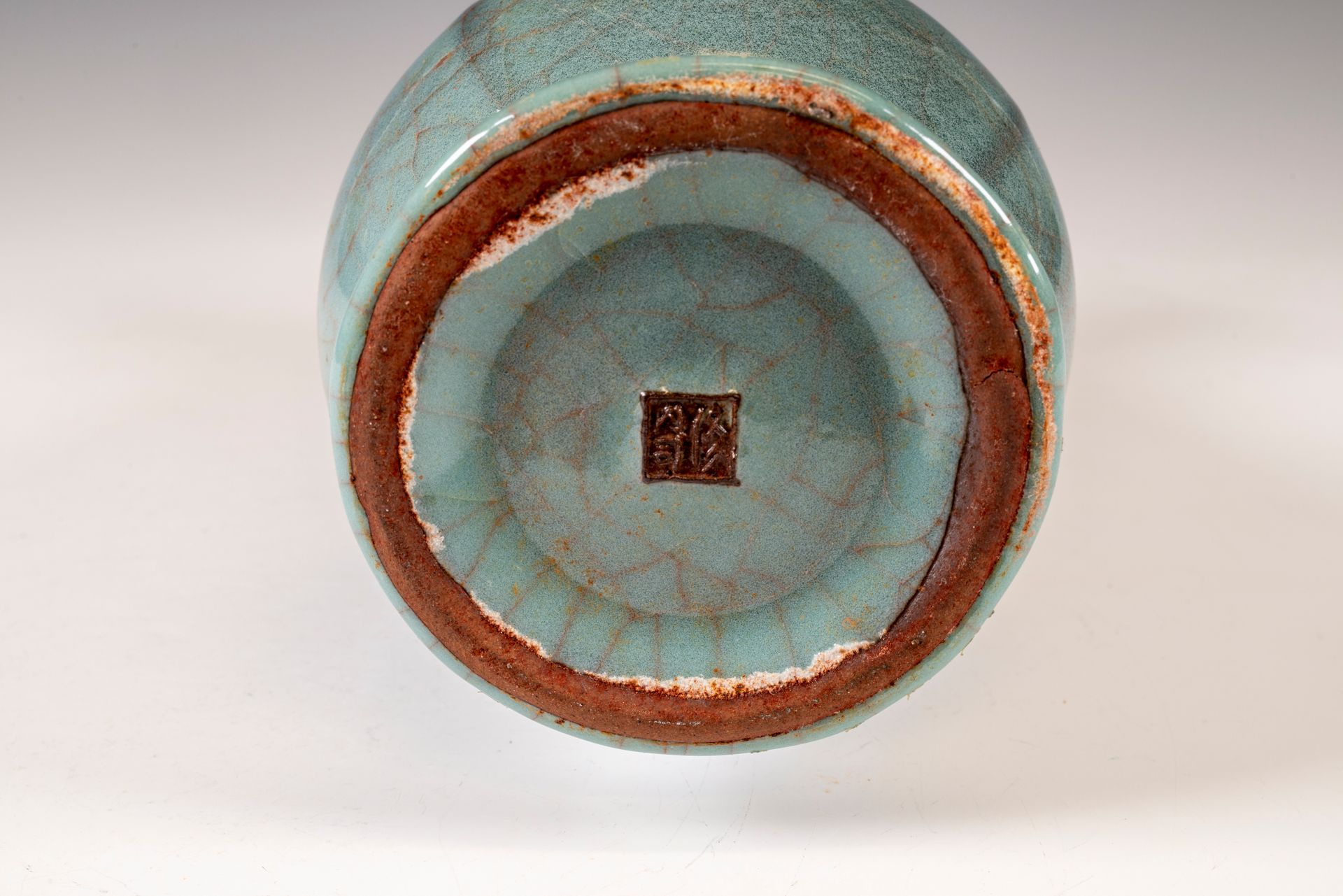 Flaschenvase mit Bambushals aus der Südlichen Song-Dynastie: Ein Meisterwerk aus dem offiziellen Guan-Brennofen Xiuneisi. Diese außergewöhnliche Guan-Keramik-Flaschenvase wurde im offiziellen Innenofen Xiuneisi gefertigt. Das Stück zeichnet sich durch mehrere Schichten einer satten, bläulichen Glasur mit subtilen grünlichen Untertönen aus, die auf einen zarten Korpus aufgetragen wurde und am Boden in einer dickeren, sich sammelnden Glasur mündet. Die Vase besticht durch ihre markante, bläulich-krakelierte Oberfläche und trägt die offizielle Guan-Marke am Boden. Charakteristisch ist außerdem der eiserne Fuß, der durch den Brennvorgang entstanden ist und den dunklen ockerbraunen Farbton des verwendeten Tons ergänzt. Der historische Kontext dieses Werkes ist bedeutend: Nach dem Einfall der Jin-Armeen, die den Kaiserhof der Nördlichen Song-Dynastie im Jahr 1127 n. Chr. verdrängten, gründete der Hof die Südliche Song-Dynastie in Hangzhou. Die Vase ist ca. 21,5 cm hoch und zeugt von der Kunstfertigkeit und dem handwerklichen Können ihrer Zeit.