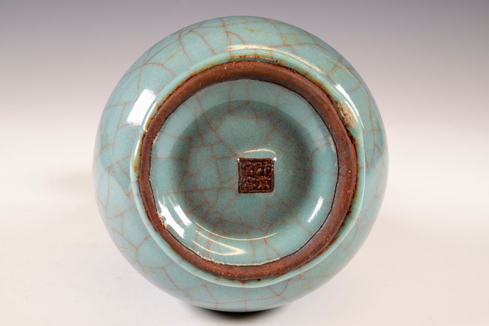 Diese exquisite ovale Vase, ein herausragendes Beispiel für die Kunst der Südlichen Song-Dynastie, zeichnet sich durch die charakteristischen Merkmale der Guan-Ware aus, die während der Kaiserzeit im renommierten Xiuneisi-Brennofen hergestellt wurde. Das im offiziellen Innenofen gefertigte und gemarkte Meisterwerk besticht durch mehrere Schichten einer dicken, durchscheinenden Glasur mit einem subtilen bläulich-grünen Farbton, die die filigrane Struktur hervorhebt und am Boden einen stärkeren Farbverlauf erzeugt. Die Vase ist mit einer attraktiven Craquelé-Glasur verziert, die ihre grünlich-bläuliche Transparenz zusätzlich betont, und trägt die offizielle Guan-Marke am Boden. Bemerkenswert ist der erhaltene Eisenfuß aus dem Brennprozess, der eine tiefbraune Farbe aufweist, die auf den verwendeten ockerfarbenen Ton zurückzuführen ist. Nach dem Einfall der Jin-Armeen, der 1127 n. Chr. zur Vertreibung des Kaiserhofs aus der Nördlichen Song-Dynastie führte, gründete der Hof die Südliche Song-Dynastie in Hangzhou. Diese bemerkenswerte Flaschenvase ist ca. 23,2 cm hoch und verkörpert die Kunstfertigkeit und Handwerkskunst ihrer Zeit. ppjrs