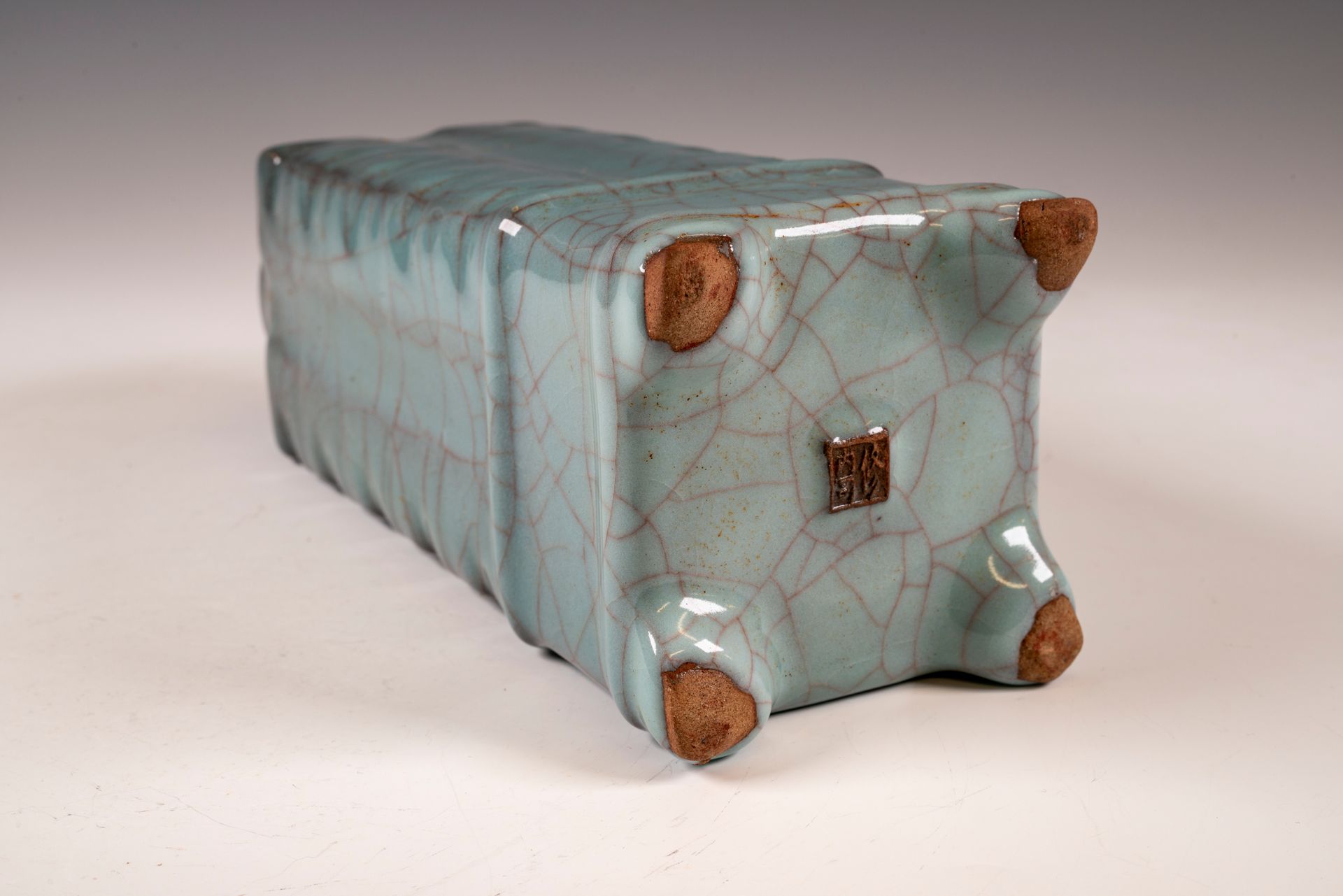 Quadratische, gerippte Vase aus der Südlichen Song-Dynastie. Dieses herausragende Meisterwerk, eine Guan-Ware-Vase aus der Zeit des offiziellen Xiuneisi-Ofens mit kaiserlicher Marke, zeugt von der exquisiten Handwerkskunst jener Epoche. Gefertigt im angesehenen Innenofen, besticht die Vase durch mehrere Schichten einer dicken, bläulichen Glasur mit einem dezenten Grünstich. Diese Glasur ist auf einen schlanken Korpus aufgetragen, dessen dickerer Korpus elegant am Boden verläuft. Die bemerkenswerte, durchscheinende Vase weist eine feine Craquelé-Textur auf, während die offizielle Guan-Marke prominent auf dem Boden prangt. Der eiserne Fuß, ein Produkt des Brennvorgangs, harmoniert perfekt mit dem dunklen Ockerbraun, das durch den hochwertigen Ton entsteht. „Xiu Nei Si“ bezeichnet die Palastversorgungsabteilung. Nach der Vertreibung des Kaiserhofs durch die Jin-Armeen während der Nördlichen Song-Dynastie im Jahr 1127 n. Chr. verlegte der Hof seinen Sitz nach Hangzhou im Süden, was zur Gründung der Südlichen Song-Dynastie führte. Die Vase ist ca. 23,5 cm hoch. ppjrs