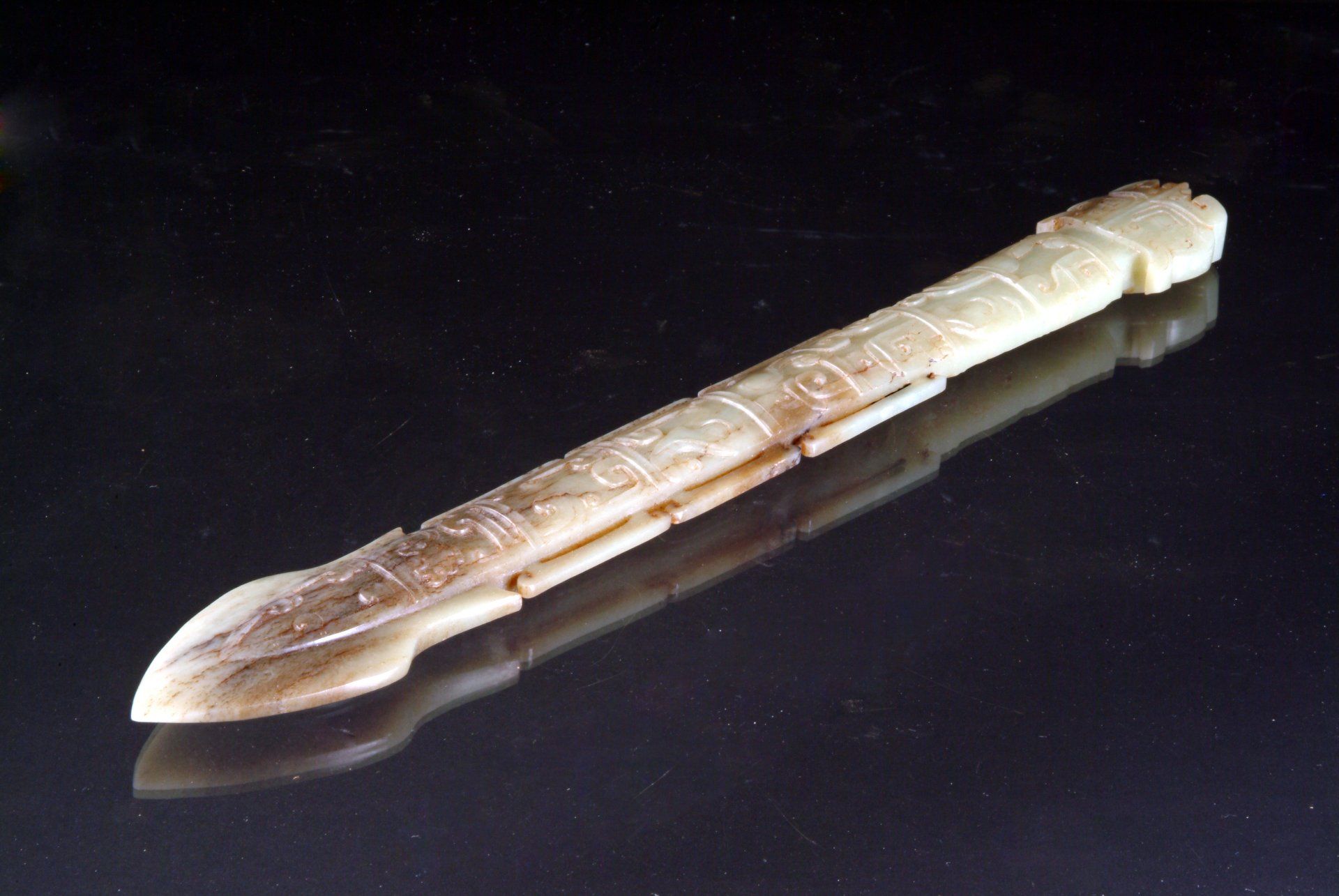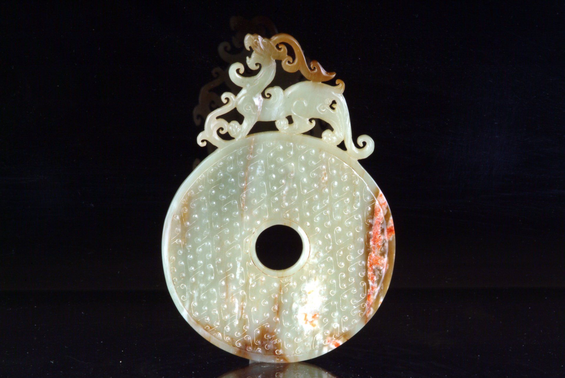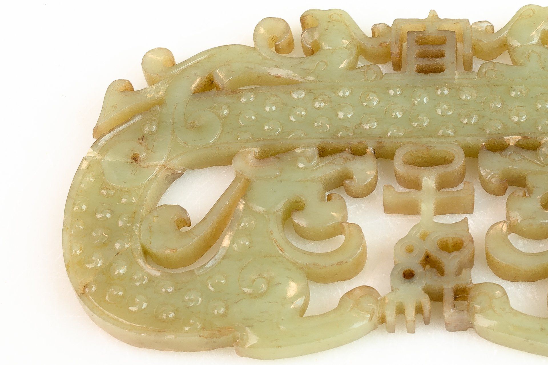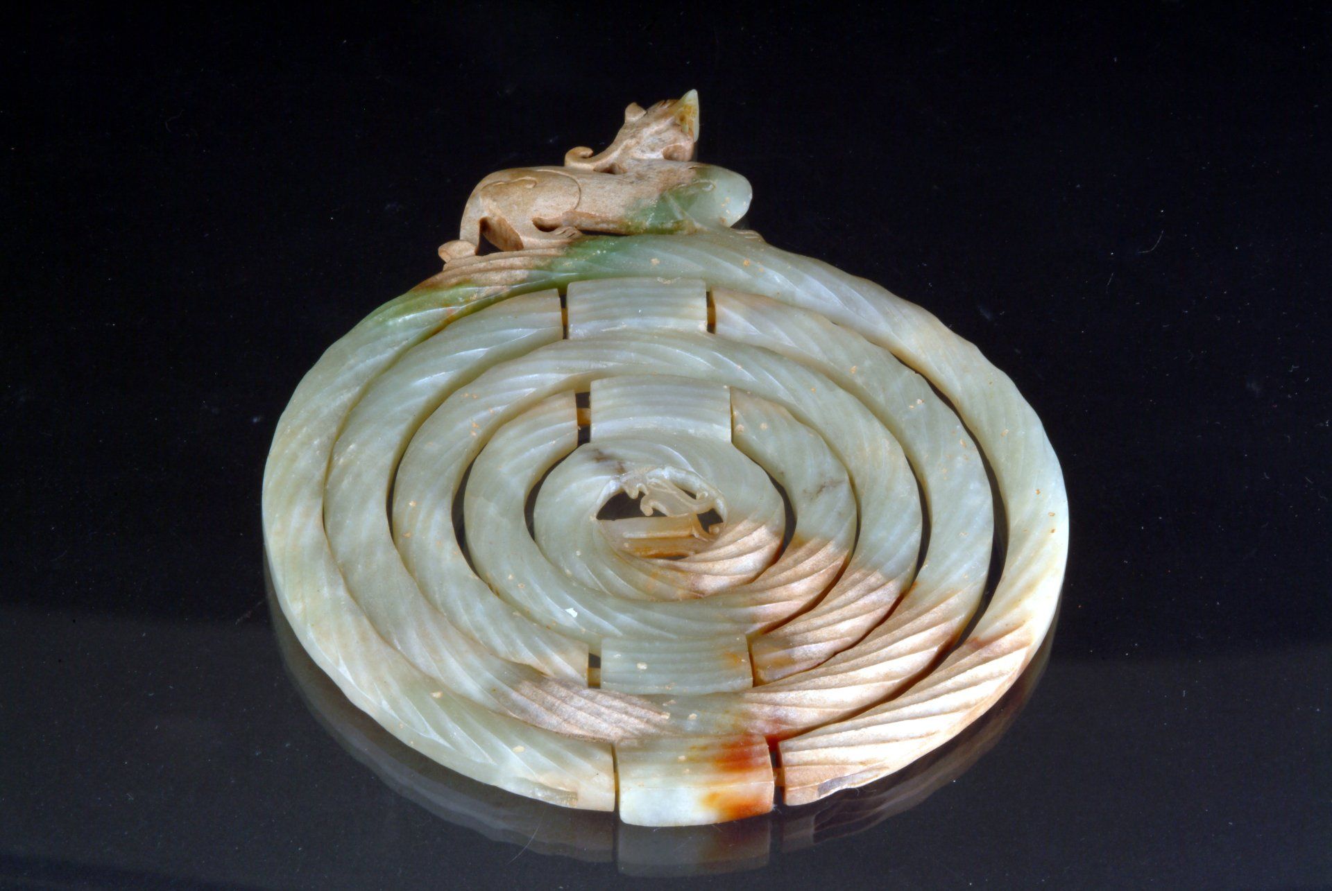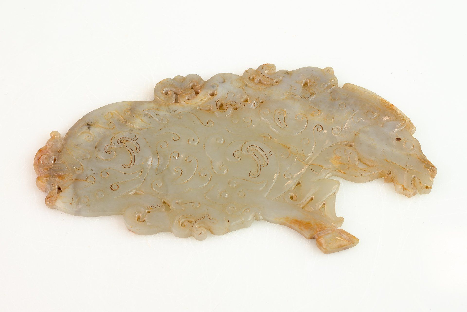 Aus der Han-Dynastie stammt ein kunstvoll gestalteter Anhänger aus weißem Jade mit einem Drachen- und Phönixmotiv, der sich durch seine stark stilisierte Verarbeitung auszeichnet. Das Schmuckstück weist auffällige, bräunliche Kalkeinschlüsse sowie grünliche Farbtöne auf, die auf die Lagerung neben Bronzeartefakten zurückzuführen sind. Der Schnitzstil unterstreicht seine historische Bedeutung. Der Anhänger misst im geschlossenen Zustand etwa 16,8 cm und im geöffneten Zustand etwa 44,5 cm.