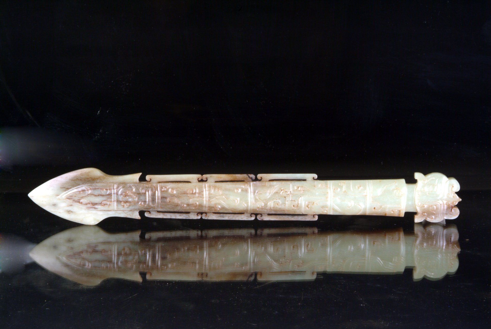 Dieses hochstilisierte, grauweiße Jade-Zepterornament aus der Han-Dynastie zeichnet sich durch bräunliche Einschlüsse und eine charakteristische Trübung aus. Die kunstvolle Schnitzerei zeugt von seiner historischen Bedeutung. Das Objekt ist etwa 33,7 cm lang.