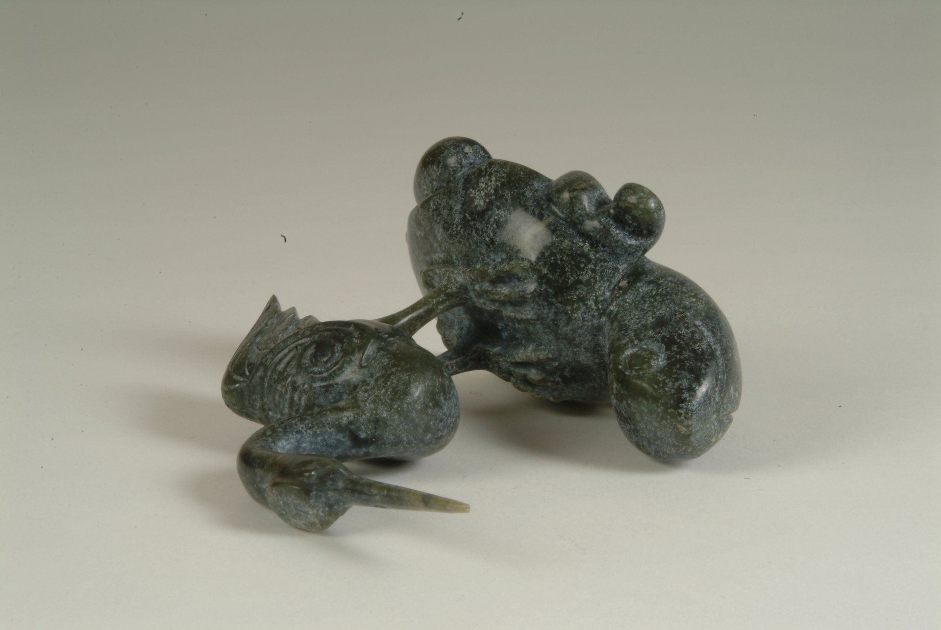 Statue einer spinatgrünen Jadeschildkröte mit Kranich aus der Han-Dynastie mit markanten weißlichen Einschlüssen und einem für die Epoche typischen Schnitzstil. Die Länge beträgt ca. 12 cm.