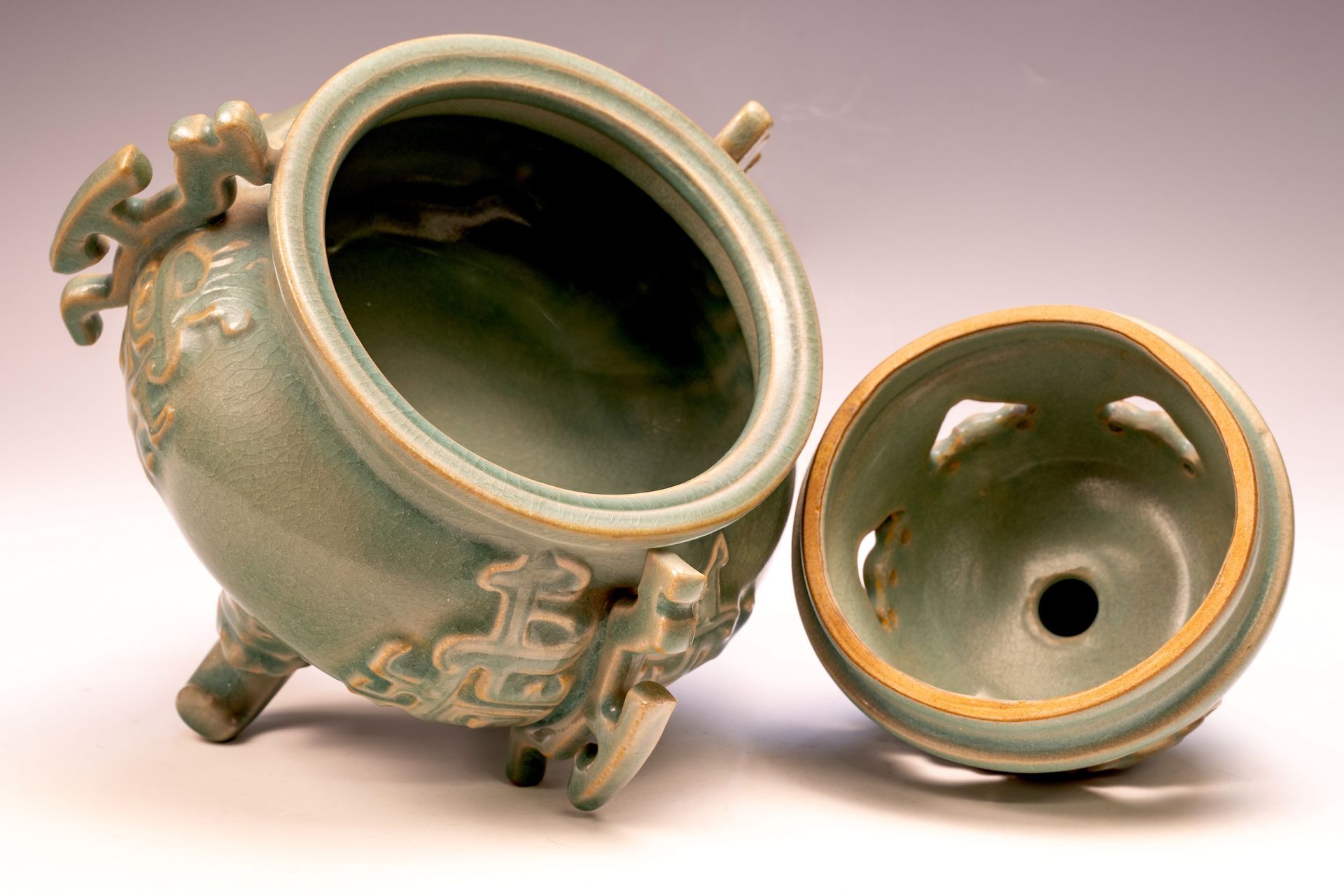 **Ein exquisiter, erster offizieller kaiserlicher Ru-Brenner mit drei Beinen, Griffen und Deckel, verziert mit einem mythischen Tier als Knauf: Ein Meisterwerk für Kaiser Huizong und seinen Hof** Dieser 23,5 cm hohe, herausragende Brenner verkörpert die außergewöhnliche Handwerkskunst der Keramik der frühen Song-Dynastie und wurde speziell für Kaiser Huizong und seinen Hofstaat angefertigt. Seine elegant proportionierte Form wird durch kunstvoll gestaltete Griffe ergänzt, die von künstlerischer Präzision zeugen. Die Seladonglasur offenbart nuancierte Variationen, die seine ästhetische Wirkung verstärken. Besonders hervorzuheben ist die zarte, an Eisbruch erinnernde Textur, kombiniert mit fein zerstoßenem, seltenem blauem Achat – ein exklusives Merkmal offizieller kaiserlicher Ru-Keramik –, die bei genauer Betrachtung, wie in den beigefügten mikroskopischen Aufnahmen zu sehen, sichtbar wird. Der Korpus des Brenners weist eine edle, gräuliche Farbpalette auf, die durch den Brennvorgang bräunlich erscheint. Dieses bemerkenswerte Artefakt ist Teil der erhaltenen Sammlung kaiserlicher Ru-Keramik der Nördlichen Song-Dynastie und ein bedeutendes Zeugnis des künstlerischen Erbes, das unter Kaiser Huizong begründet wurde.