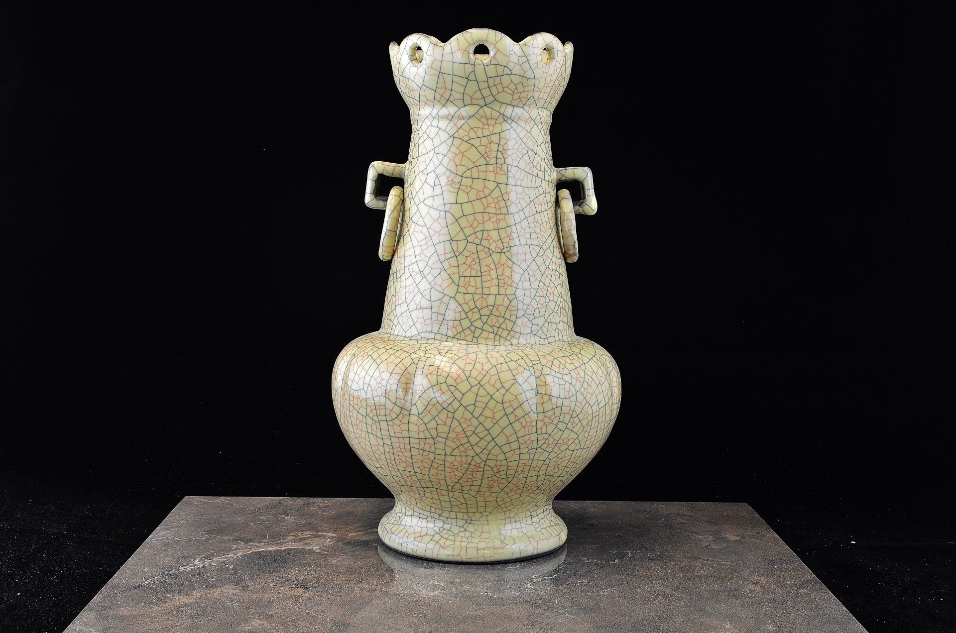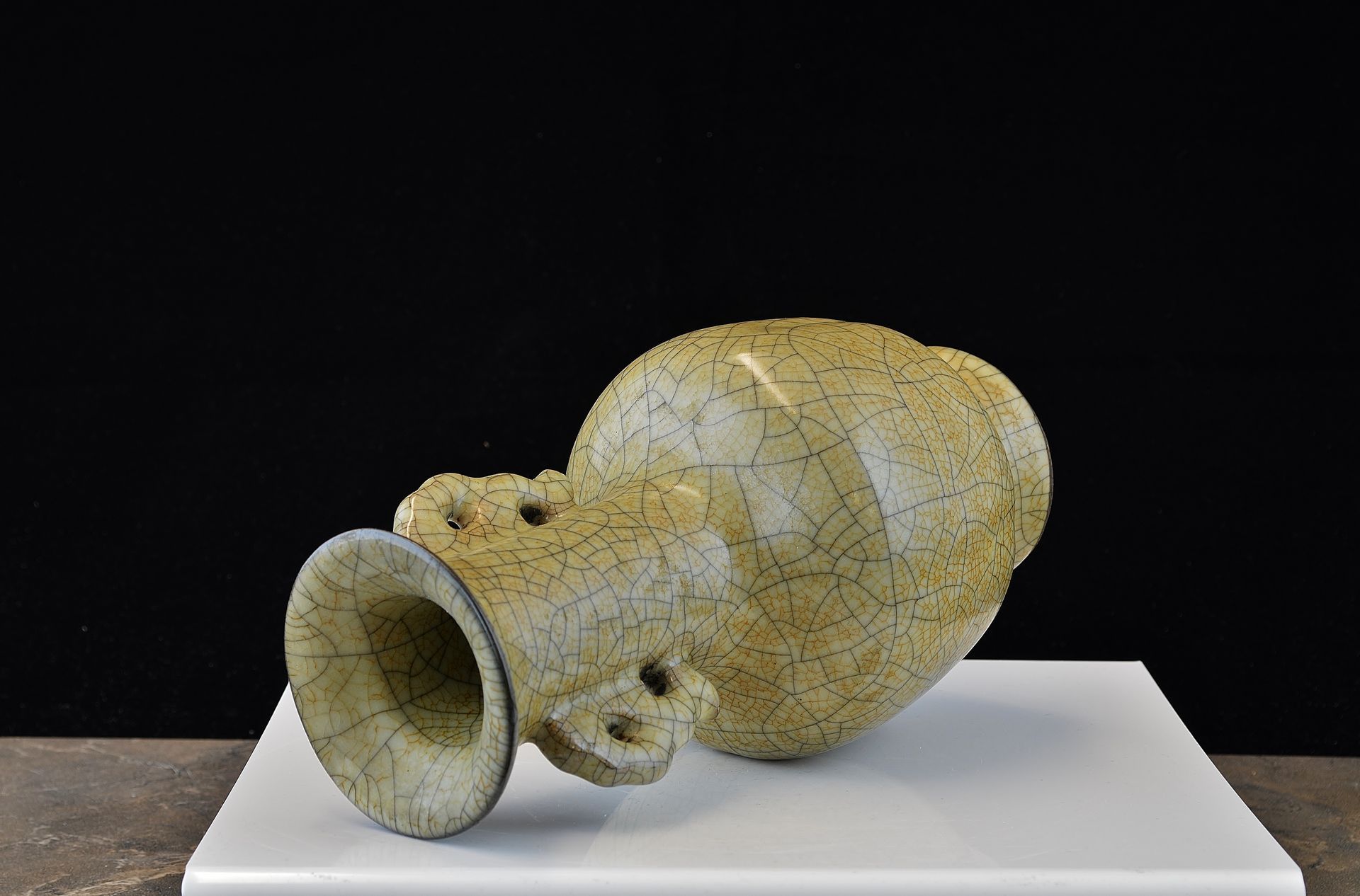 Ge-Ofen-Vase aus der Südlichen Song-/Yuan-Dynastie mit röhrenförmigen Henkeln. Die Vase stammt vermutlich aus der frühen Südlichen Song-Dynastie und weist Spuren eines unvollkommenen Brennvorgangs auf, der aufgrund der damals noch nicht vollständig beherrschten Techniken zu einer dickeren Glasur führte. Sie besitzt einen Eisenfuß und eine weizenfarbene Färbung. Der Ge-Ofen gilt als Vorläufer anderer Brennöfen in der Übergangszeit von der Südlichen Song- zur Yuan-Dynastie. Die Vase ist etwa 21,5 cm hoch.