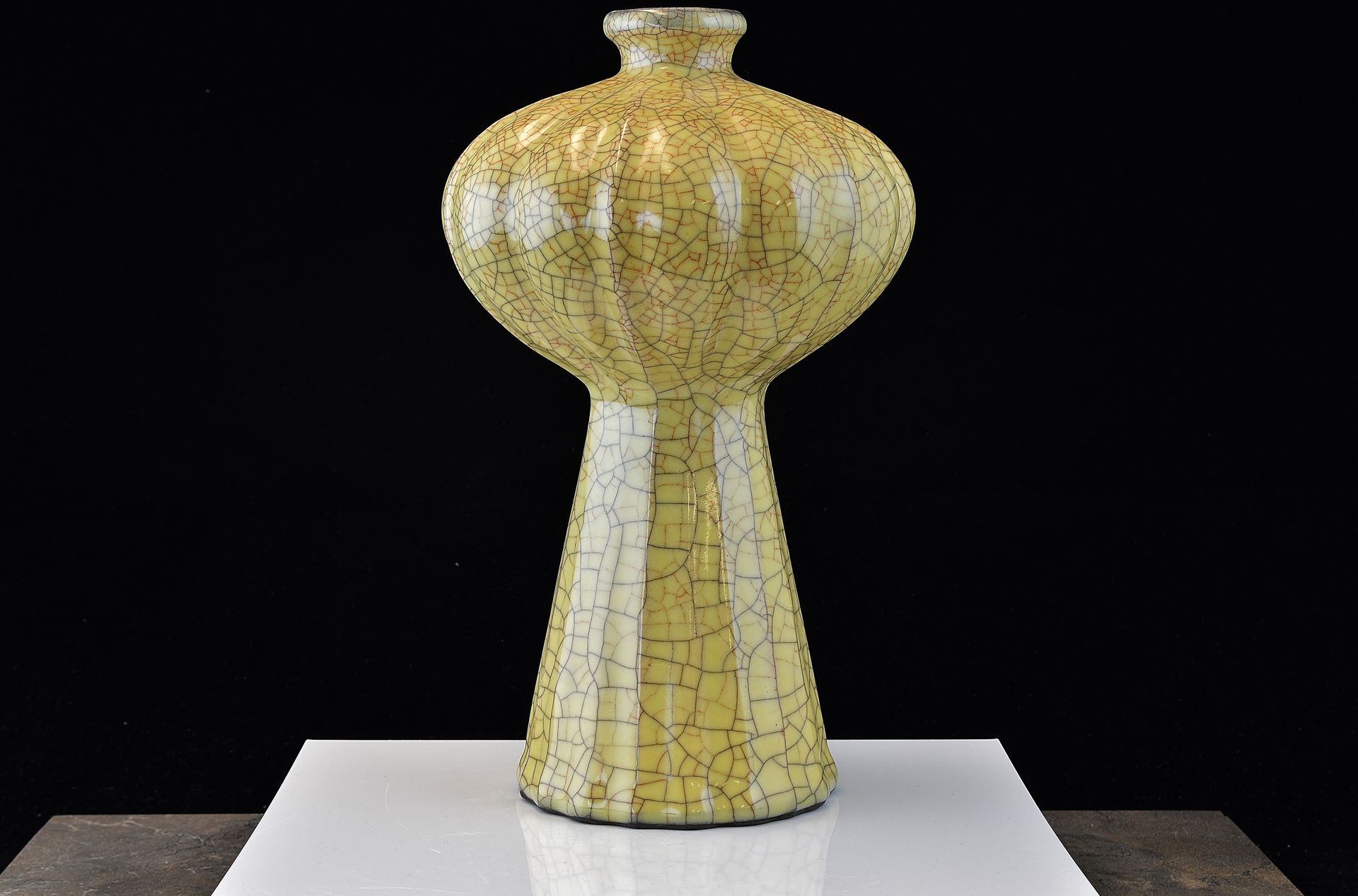 Ge-Ofenvase in Form einer gelappten Melone auf Sockel aus der Song-/Yuan-Dynastie. Die Vase besticht durch ihren purpurfarbenen Mund, verziert mit goldgeflochtenem Eisendraht-Craquelé und einem Eisenfuß. Die Farbe erinnert an Weizen. Der Ge-Ofen gilt als eine der bedeutendsten und ältesten Brennöfen der Südlichen Song- bis zur Yuan-Dynastie. Im Licht einer Taschenlampe schimmert der dünn glasierte, purpurfarbene Mund zart durch. Die Vase ist ca. 25 cm hoch. ppjrs