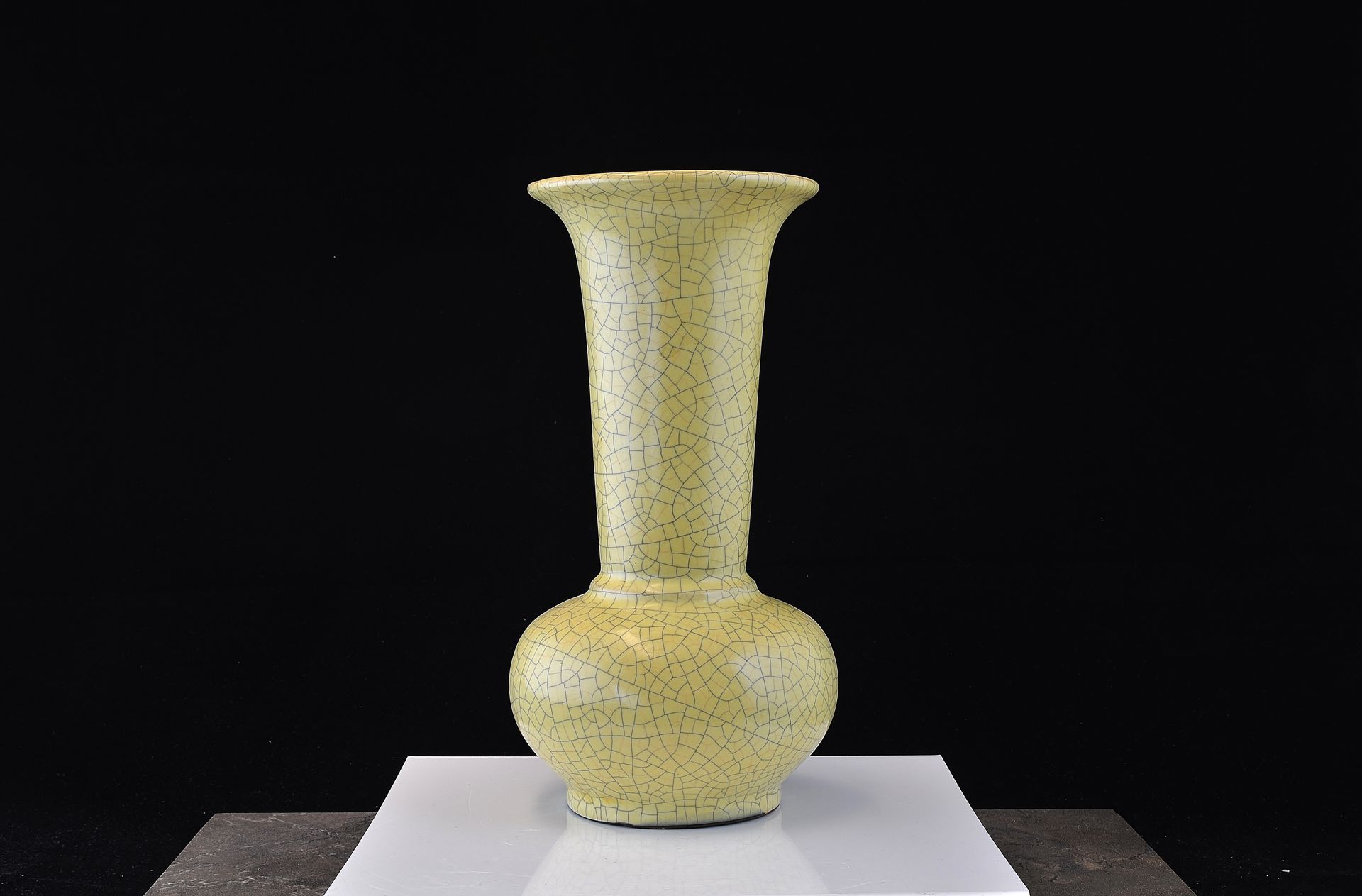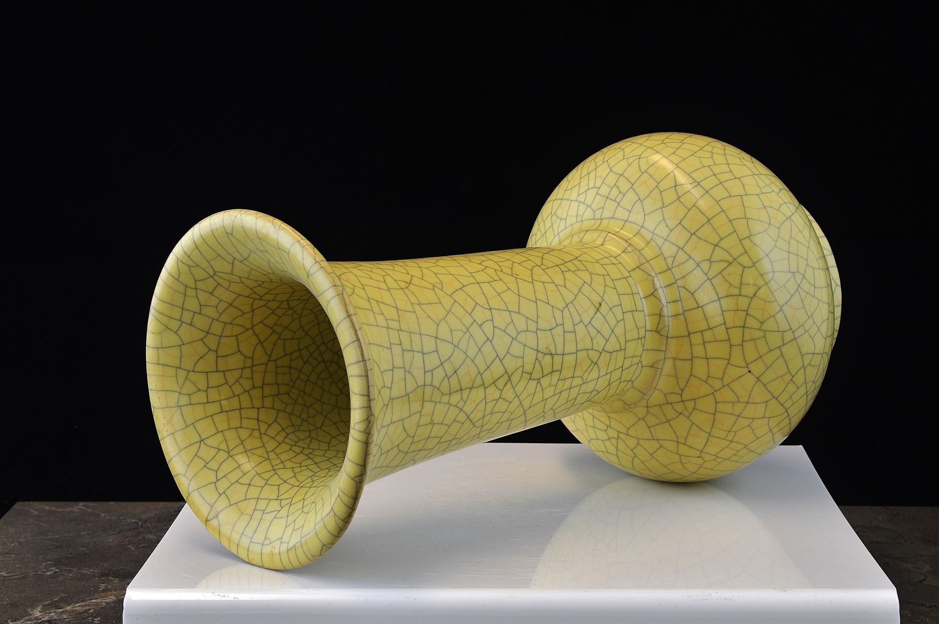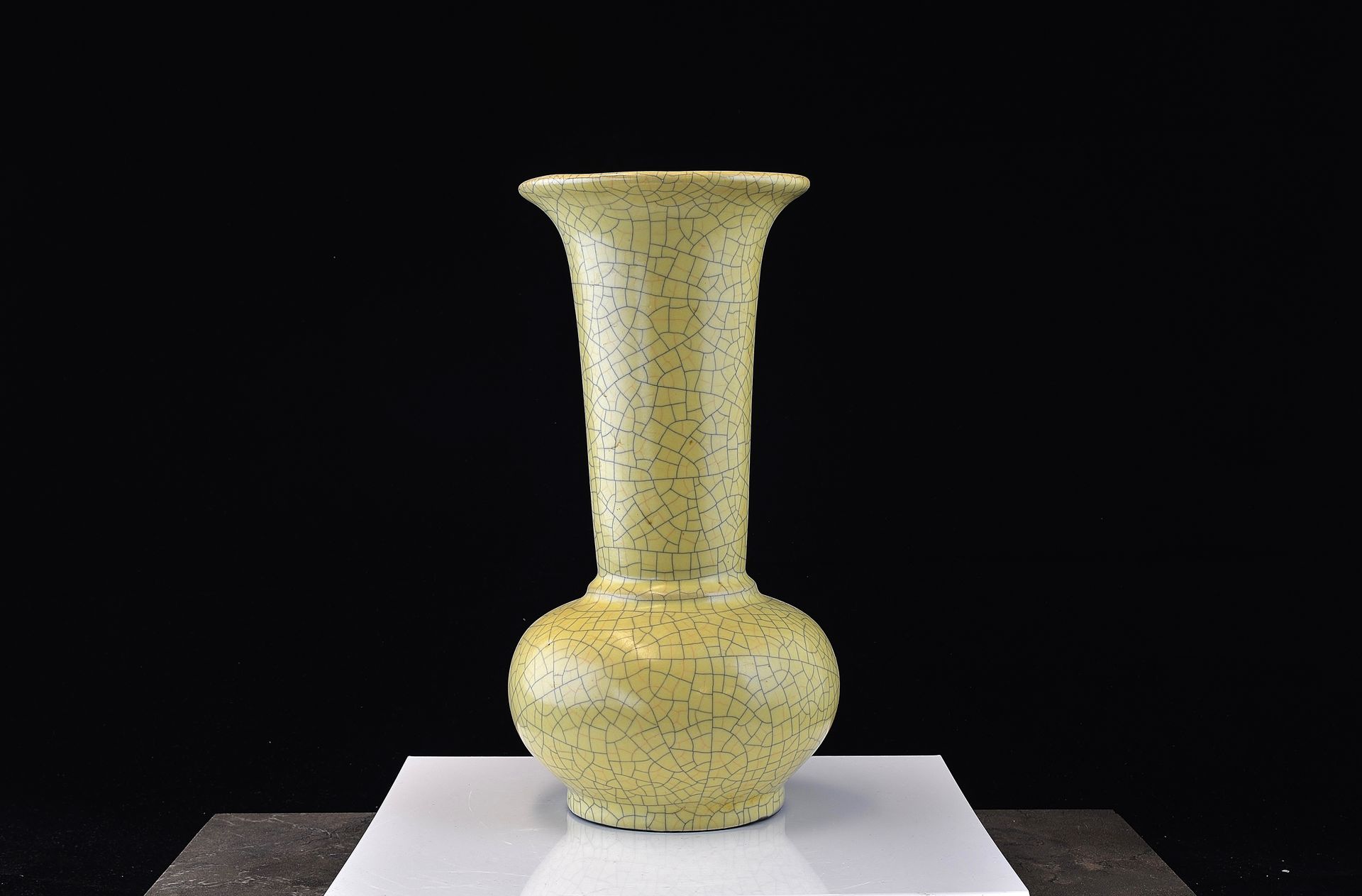 Diese außergewöhnliche Ge-Vase zählt zu den wertvollsten Beispielen der Ge-Keramik überhaupt. Traditionell zeichnen sich feinste Ge-Keramiken durch ihre weizenähnliche Färbung und einen markanten violetten Rand aus, an dem die Glasur dünner wird und einen dezenten violetten Schimmer an der Öffnung erzeugt. Charakteristisch für diese Stücke ist außerdem ihr eiserner Fuß, der am Fußring deutlich sichtbar ist. Dieser entsteht durch die Verwendung eines hellbraunen, eisenhaltigen Tons, der nach dem Brennen eine dunkelbraune Farbe annimmt. Das Craquelé-Muster erinnert an mit Goldfäden umwundenen Eisendraht und verleiht der Vase eine einzigartige Ästhetik. Der Ge-Ofen, auch als Ofen des älteren Bruders bekannt, erlebte seine Blütezeit während der Südlichen Song- und Yuan-Dynastie. Aufgrund ihrer bemerkenswerten Qualität, Schönheit und beachtlichen Größe (ca. 35,5 cm Höhe) wird diese Vase wahrscheinlich als Tributware klassifiziert.